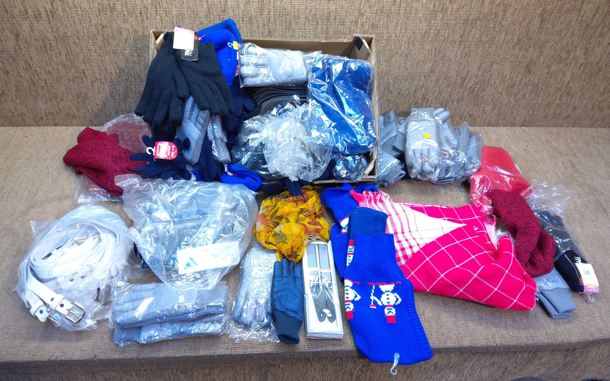 Large quantity of retail packaged hats, gloves and scarfs.