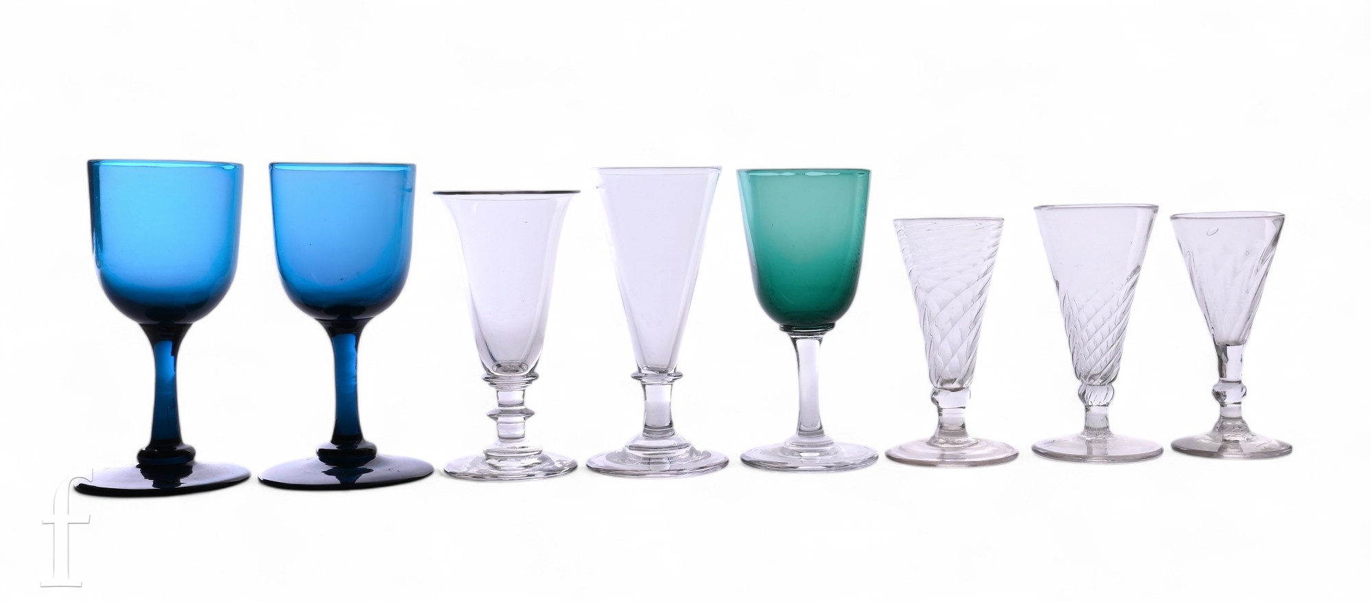 A small collection of late 18th and 19th Century table and drinking glasses to include wrythen ales, bladed knop jelly glass and Bristol green wines, tallest 13.5cm. (8)