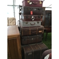 A stack of old suite cases and traveling trunks