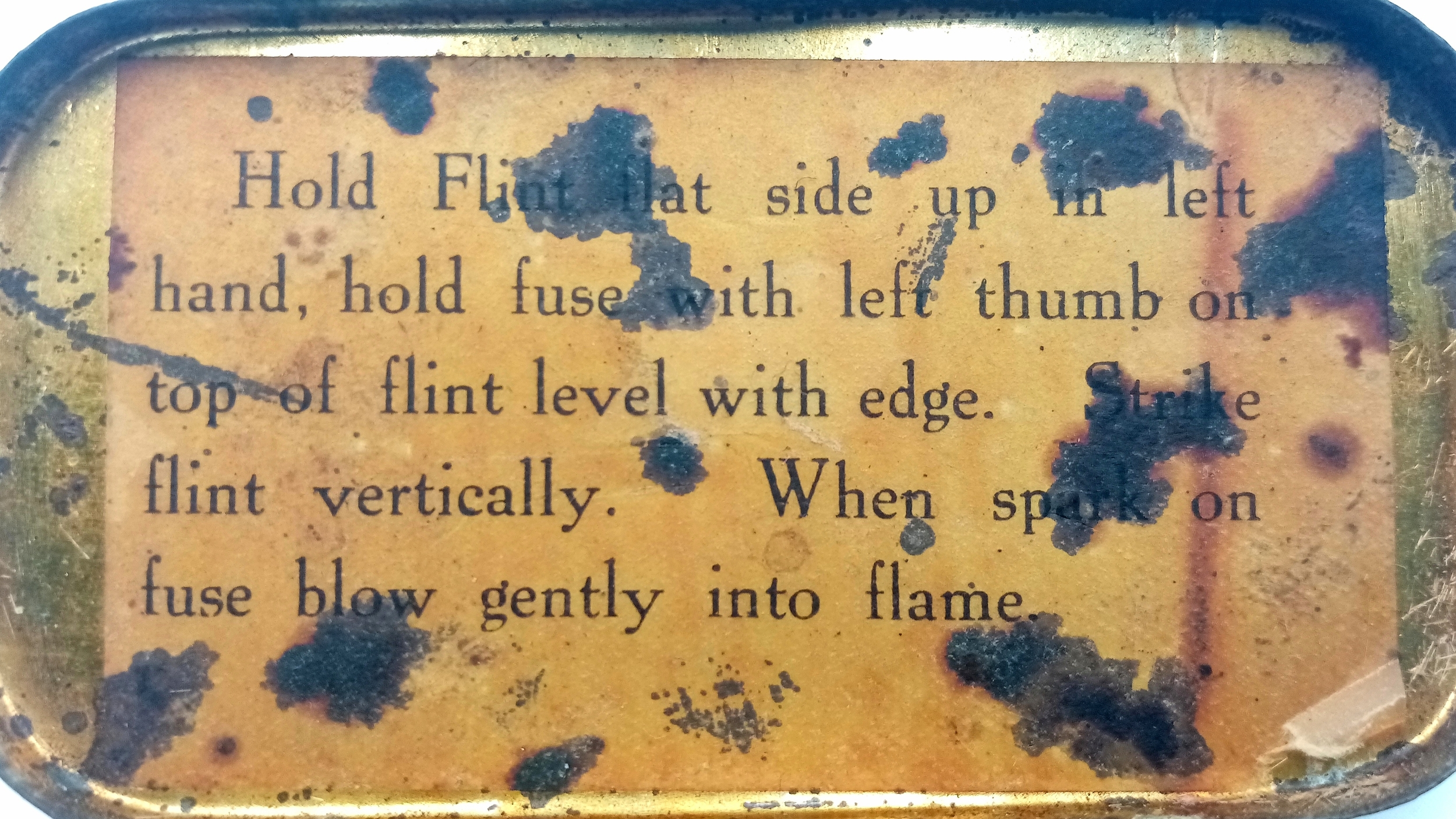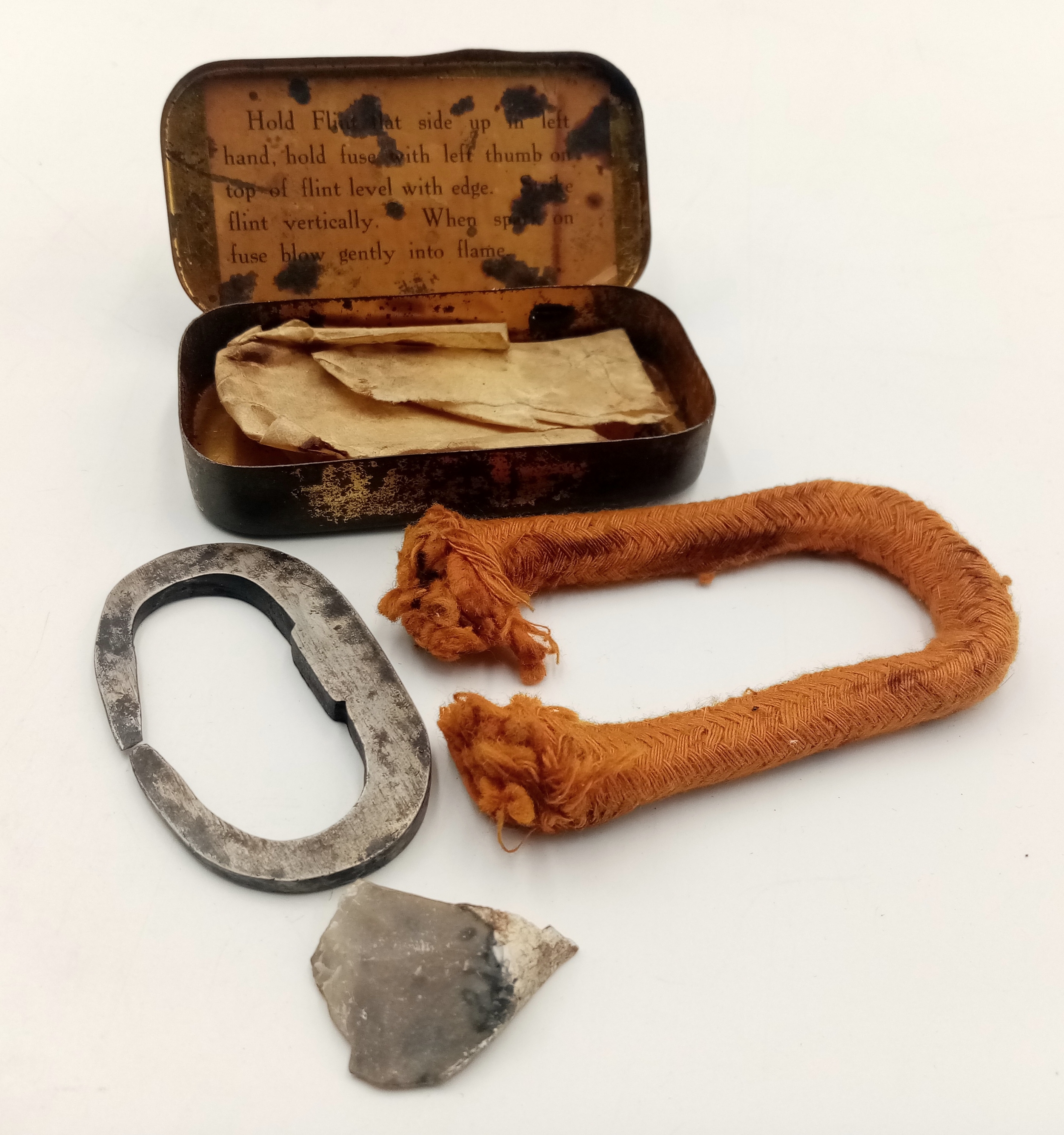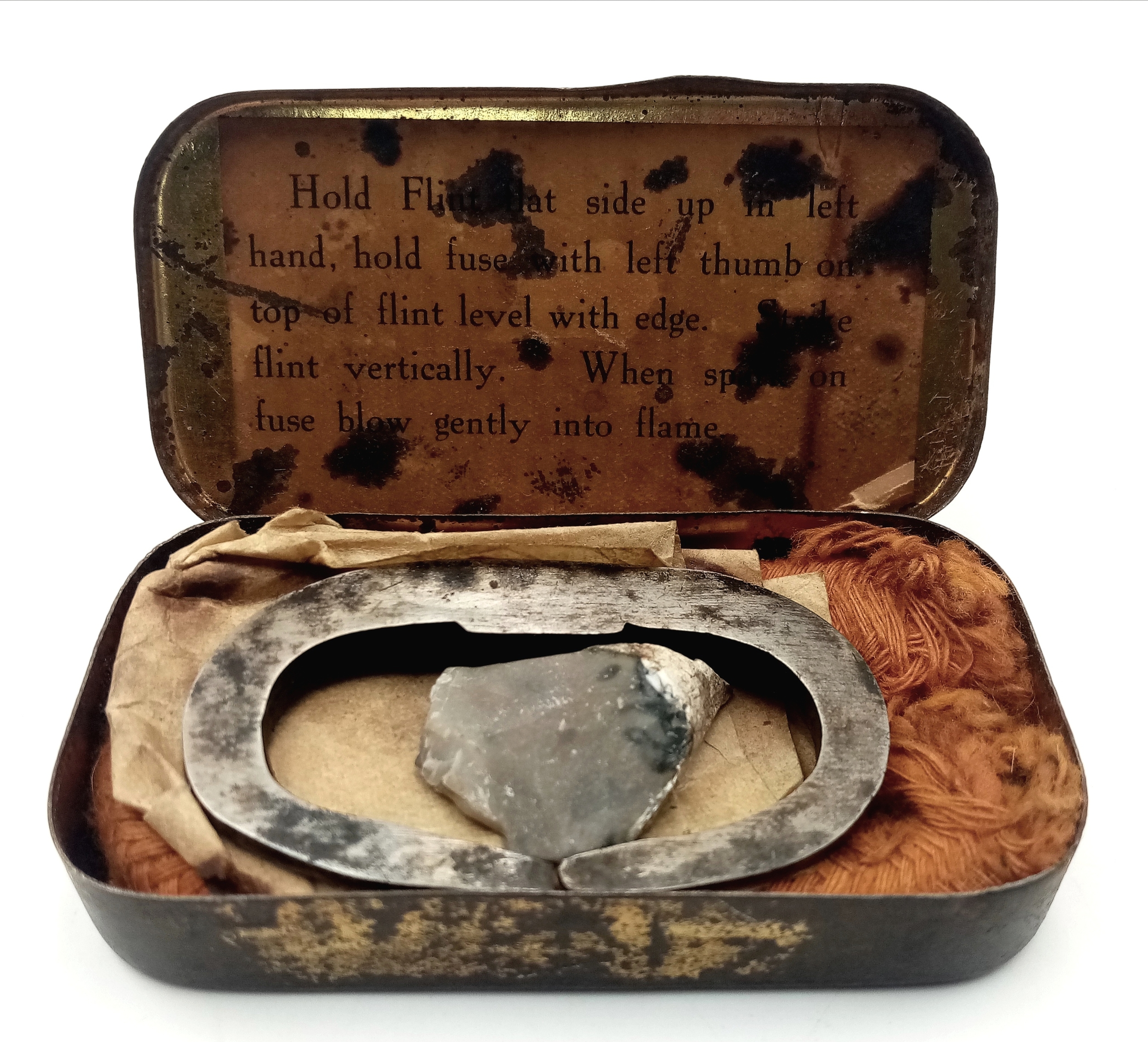 WW1-WW2 Period “The Allies Tinder Box” with original iron striker, flint fragment and taper.
