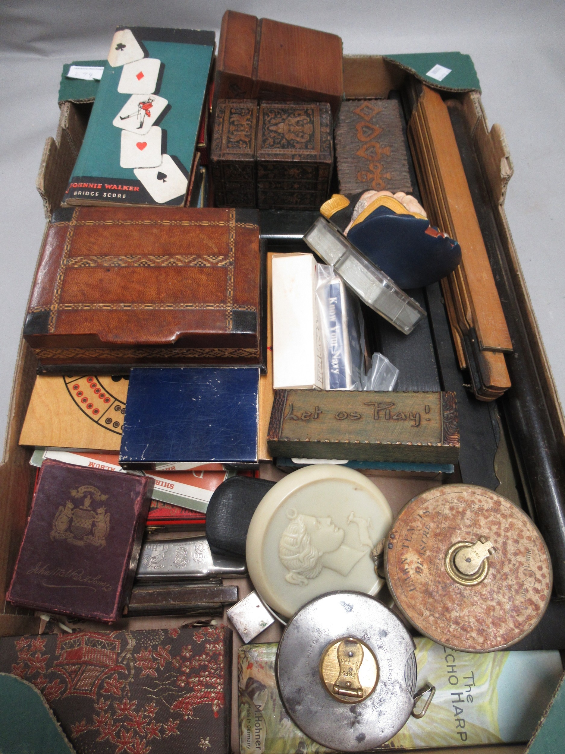 Quantity of various playing cards, drawing instruments, harmonicas and other sundries