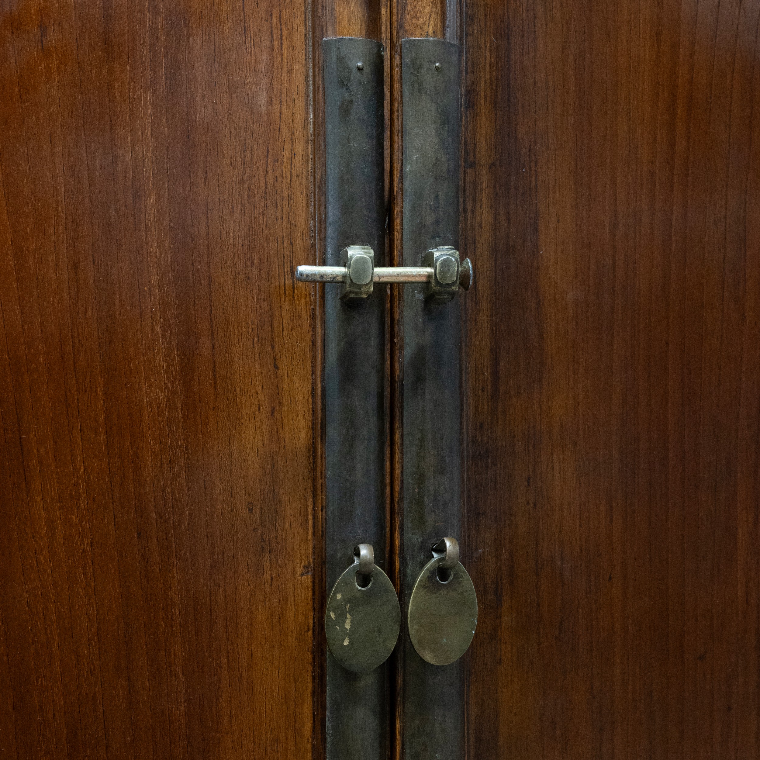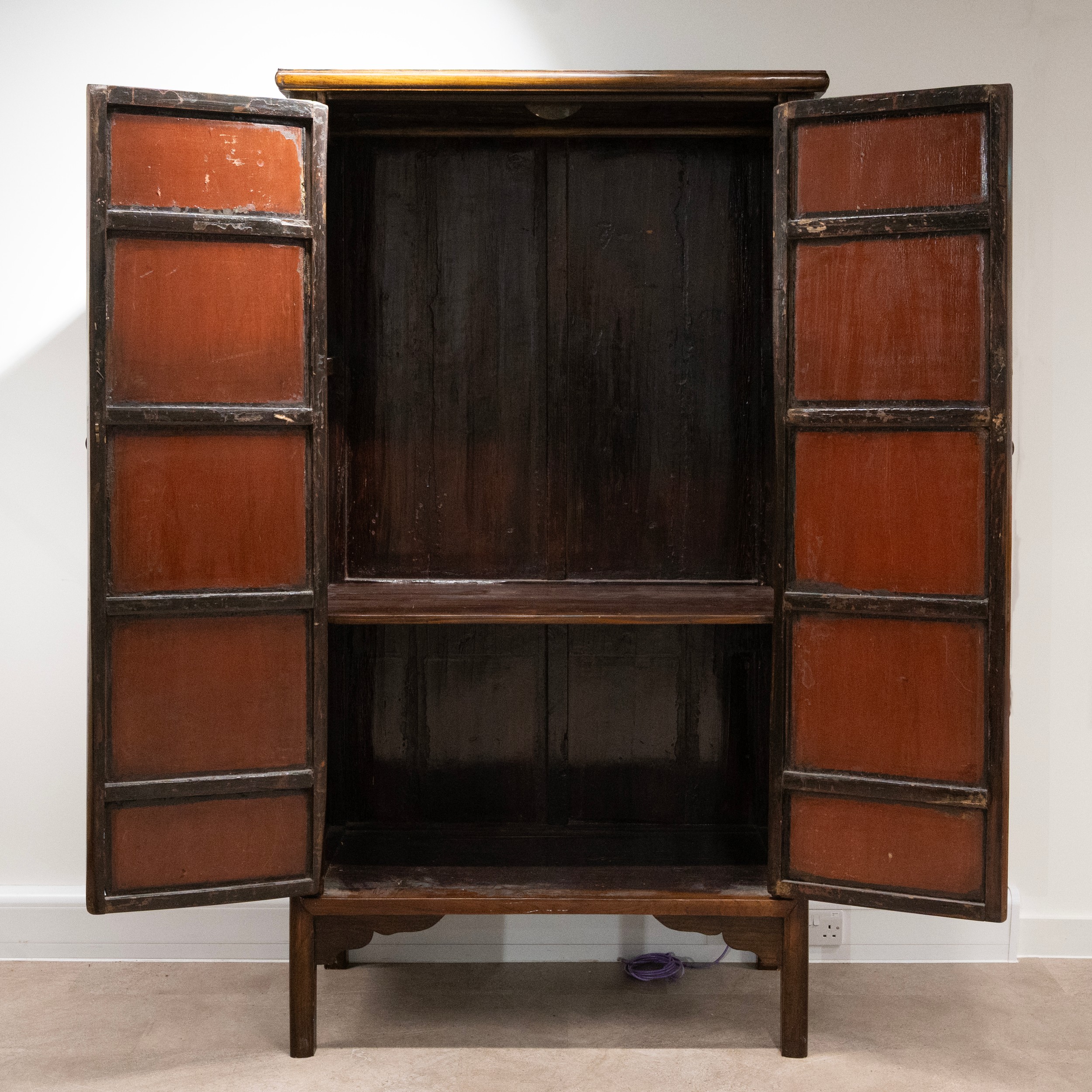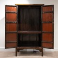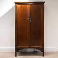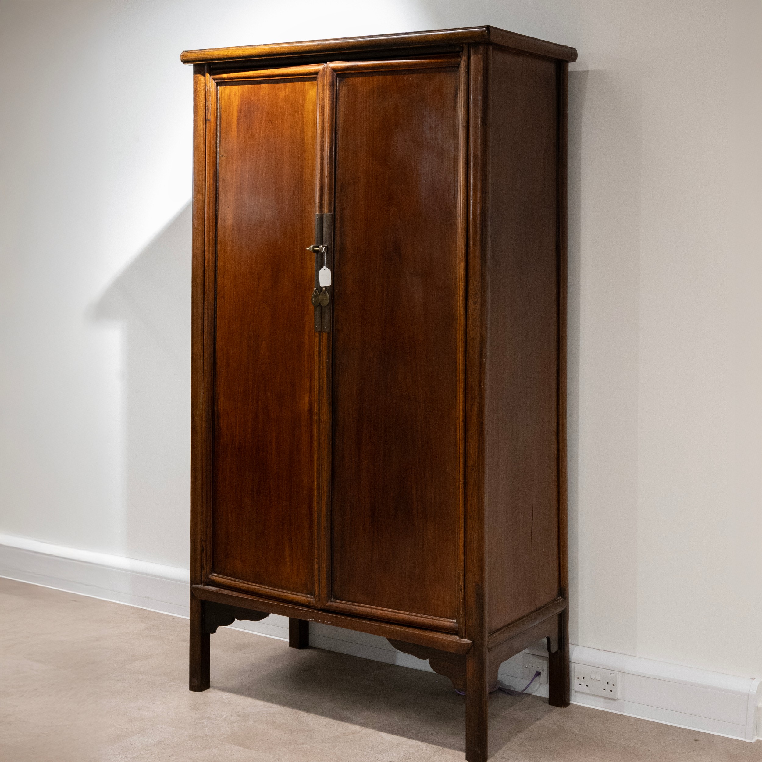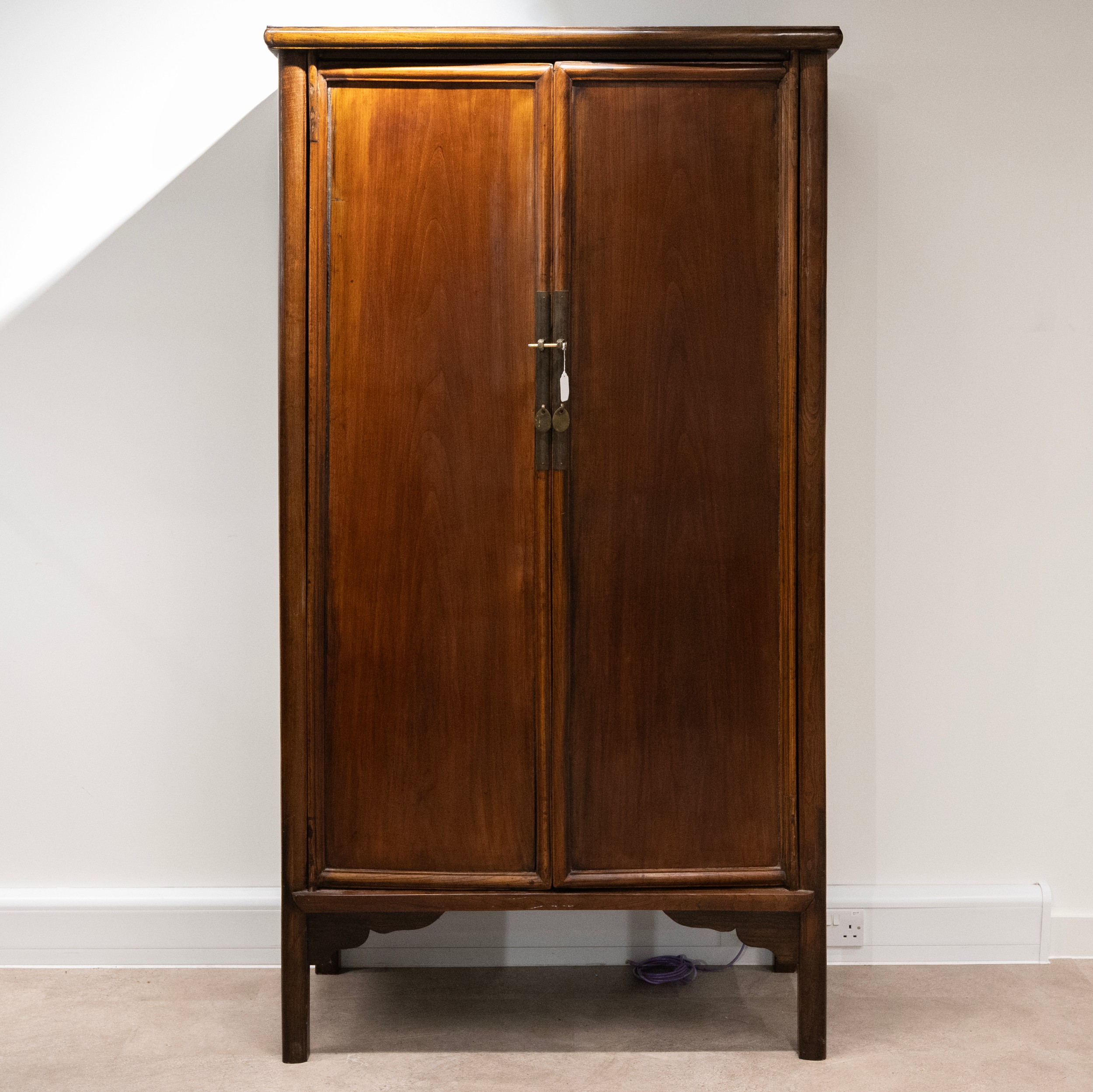 A Chinese huanghuali Qing Dynasty cabinet, the pair of doors with vertical brass lock plates, enclosing a single shelf. 200cm high, 104.5cm long, 52cm deep.