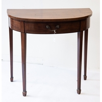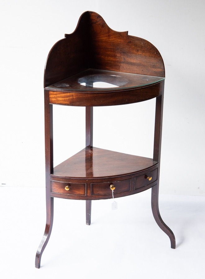 EARLY NINETEENTH CENTURY MAHOGANY CORNER WASHSTAND, the tall galleried quadrant top with three circular cut-outs and later glass protector, raised on square legs tied by a conforming under tier with central, cockbeaded drawer flanked by a pair of matching faux drawers, 42 ½” (108cm) high, 26” (66cm) wide
