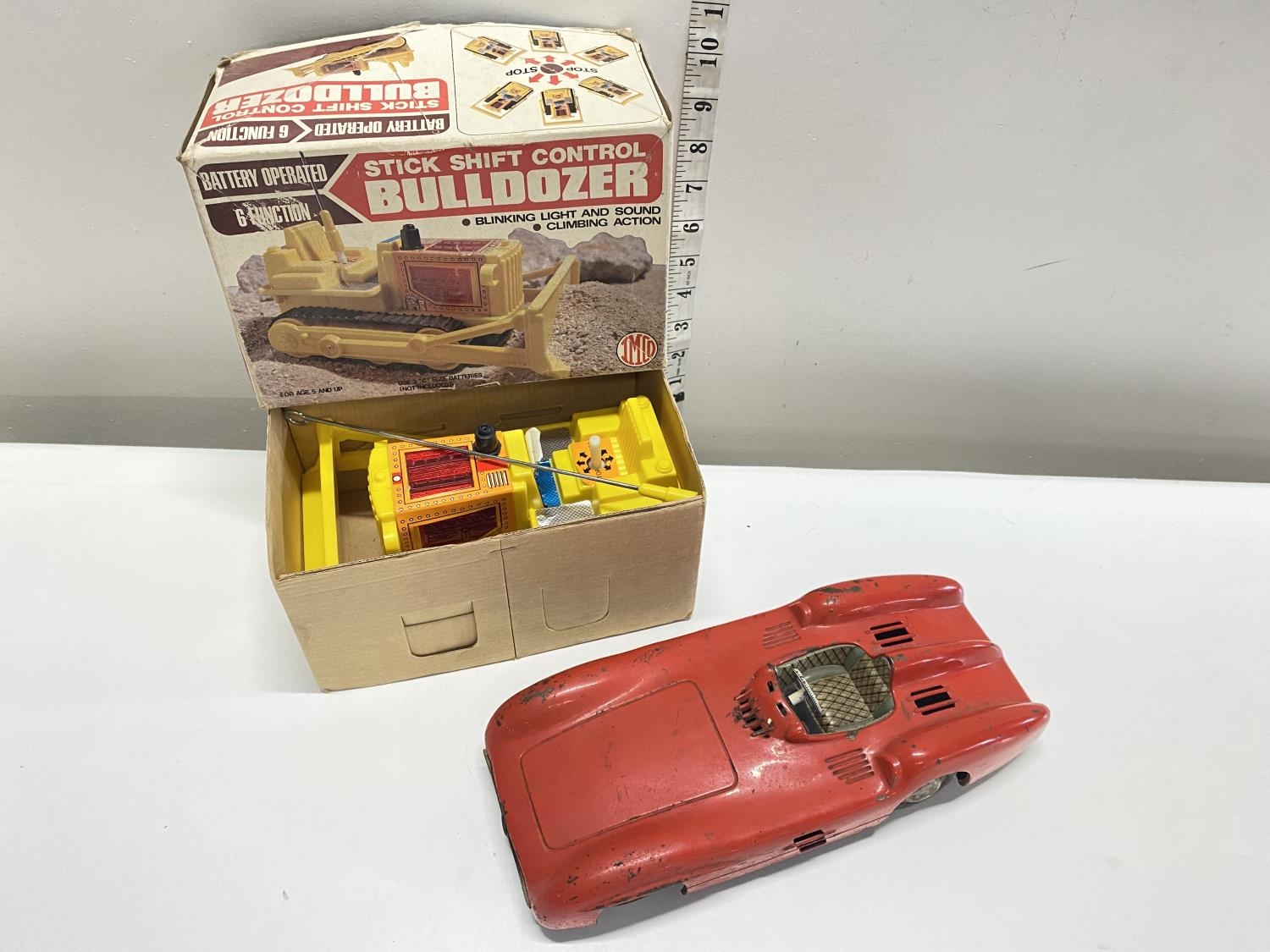 A vintage mid-century West German tin plate car and a boxed Imco bulldozer