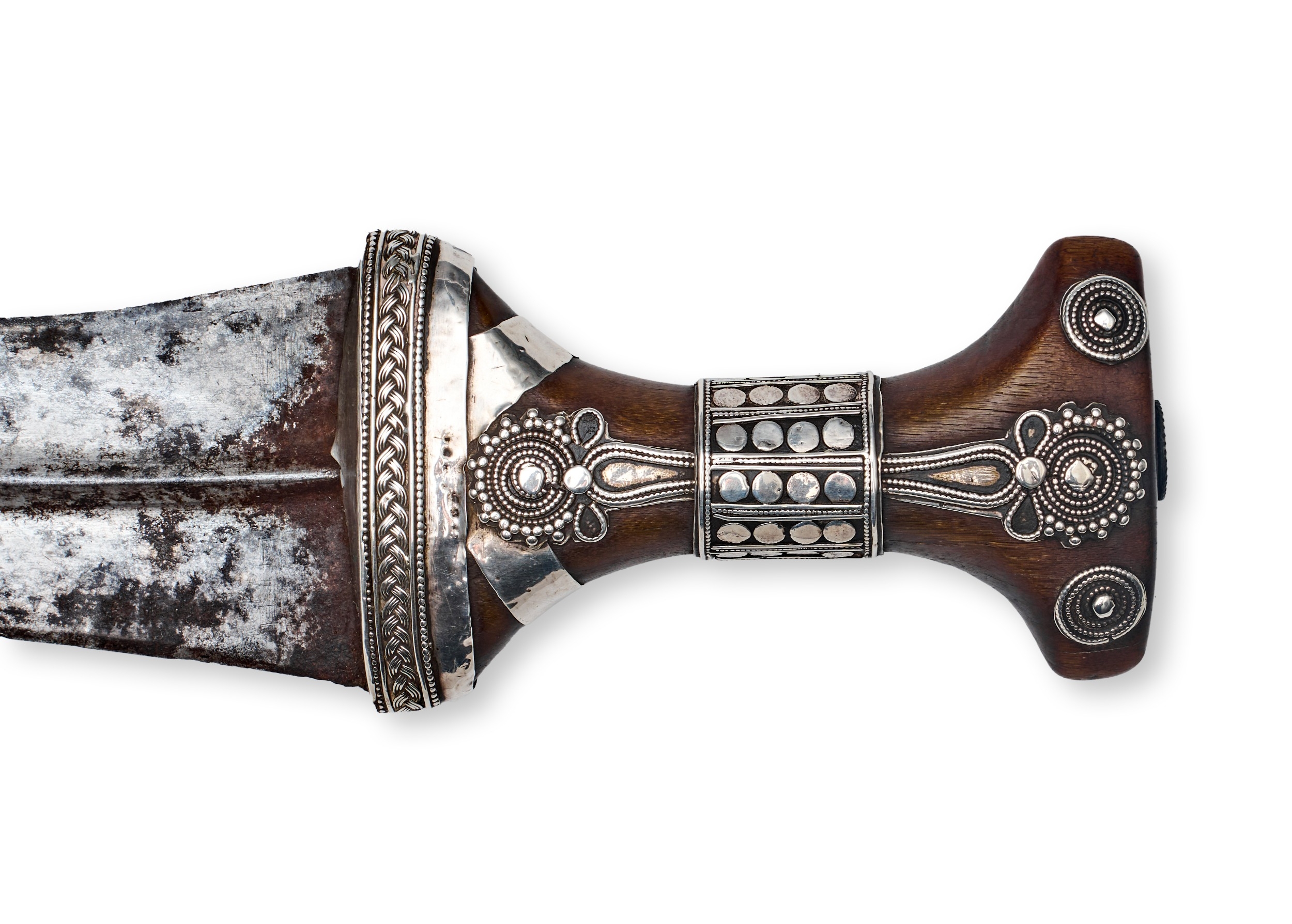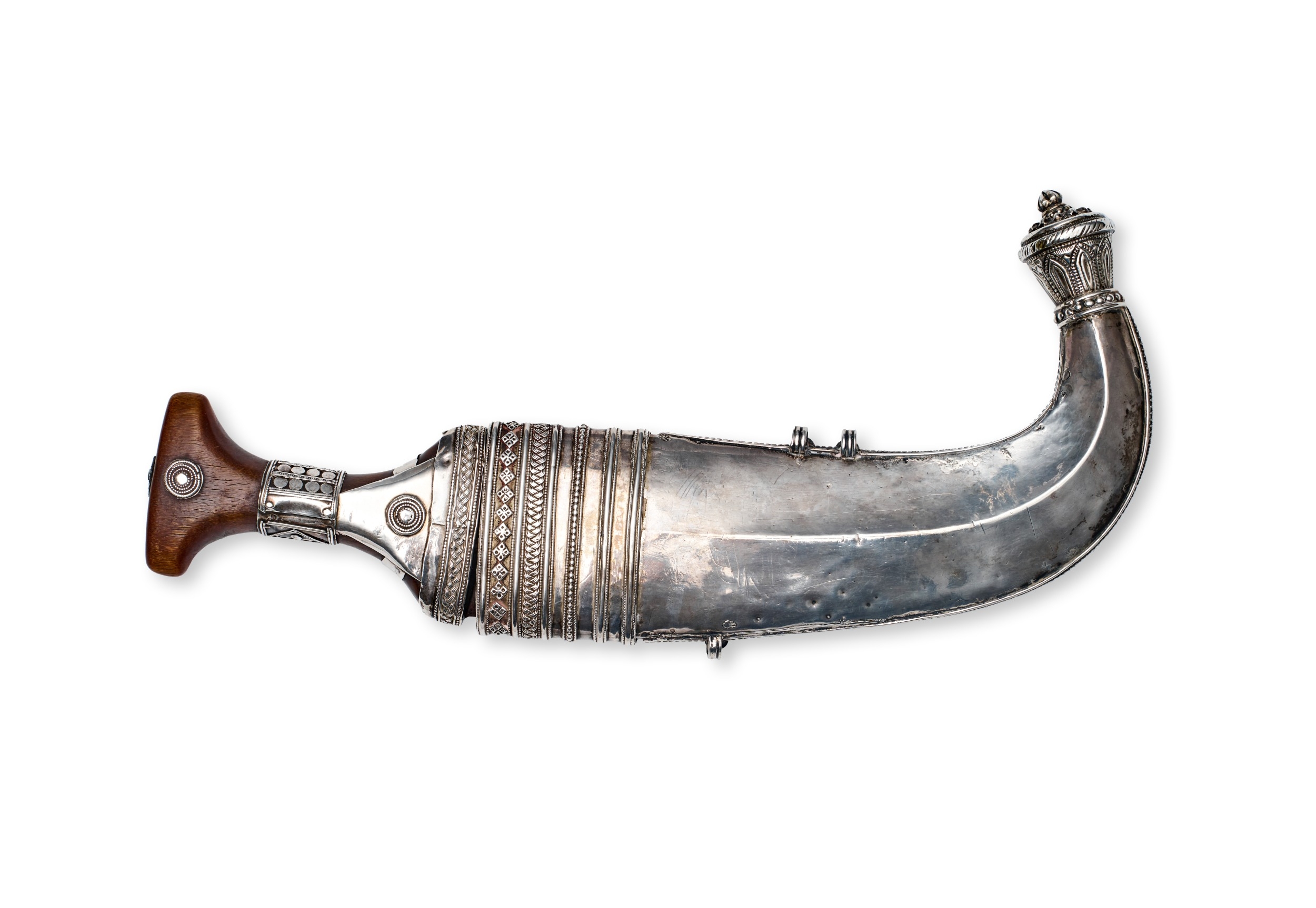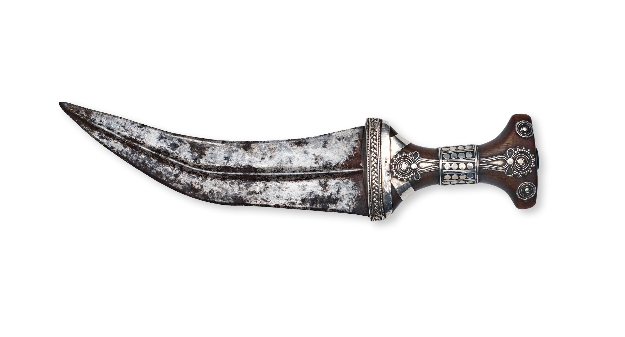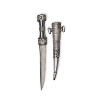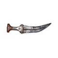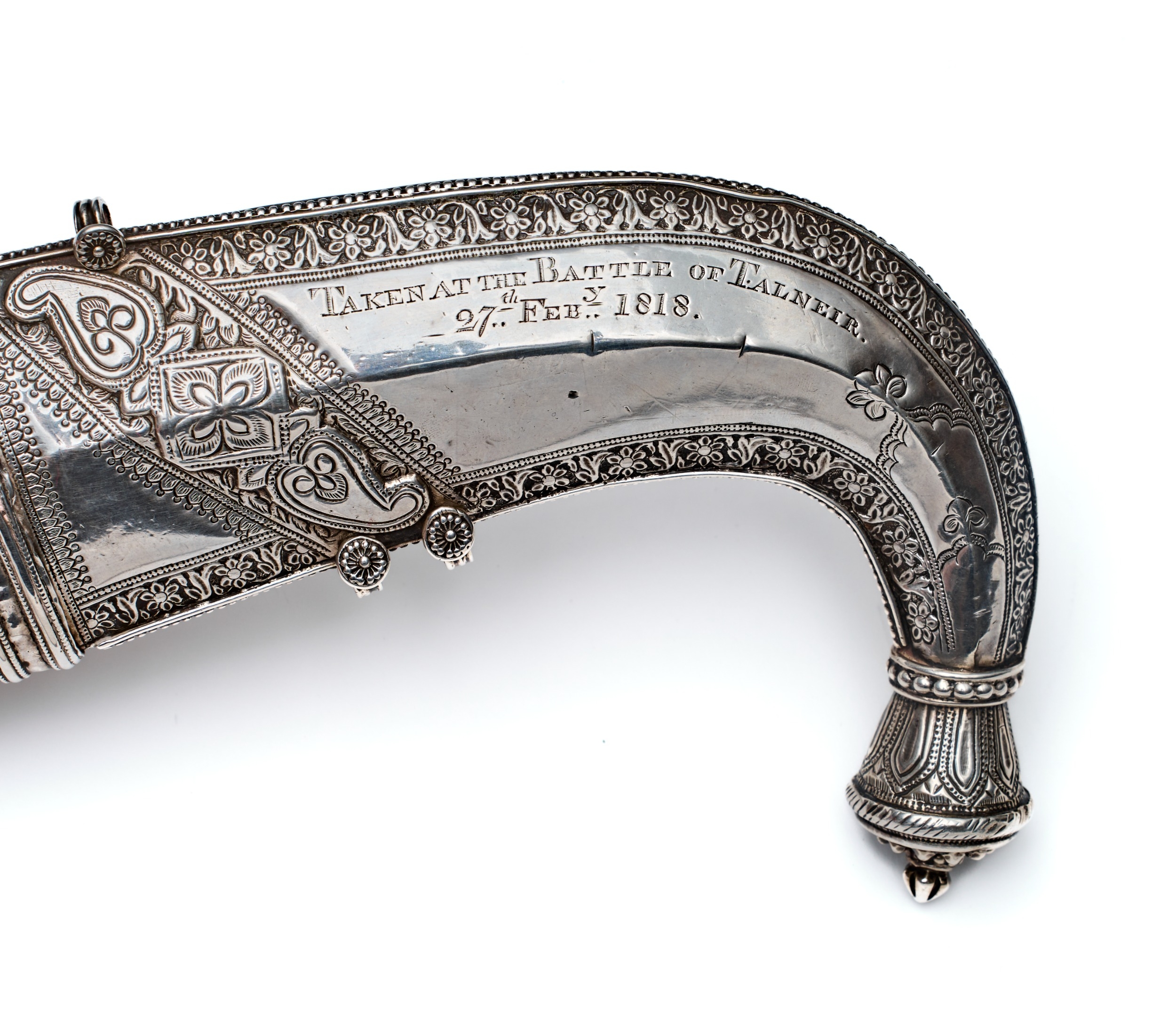 This lot features a Saudi Arab Janbiya dagger and its matching scabbard, serving as a documented war trophy from the Third Anglo-Maratha War. The upper face of the scabbard bears a crisp commemorative engraving in a formal serif script that reads: TAKEN AT THE BATTLE OF TALNEIR. / 27th Feby 1818. This inscription refers to the capture of the Talneir fort in Maharashtra, India, by British forces under Lieutenant-General Sir Thomas Hislop. The dagger consists of a curved, double-edged steel blade with a prominent central medial ridge. The I-shaped hilt is constructed from a dark polished horn and is heavily embellished with silver-colored metal mounts featuring intricate filigree, granulation, and chased geometric designs. The pommel and guard sections are secured with decorative silver pins. The wooden-core scabbard is entirely encased in silver-colored metal, decorated in registers with repousse floral motifs, chased borders, and fine filigree work. The mid-section includes two suspension rings, and the chape is finished with a multi-layered decorative finial.