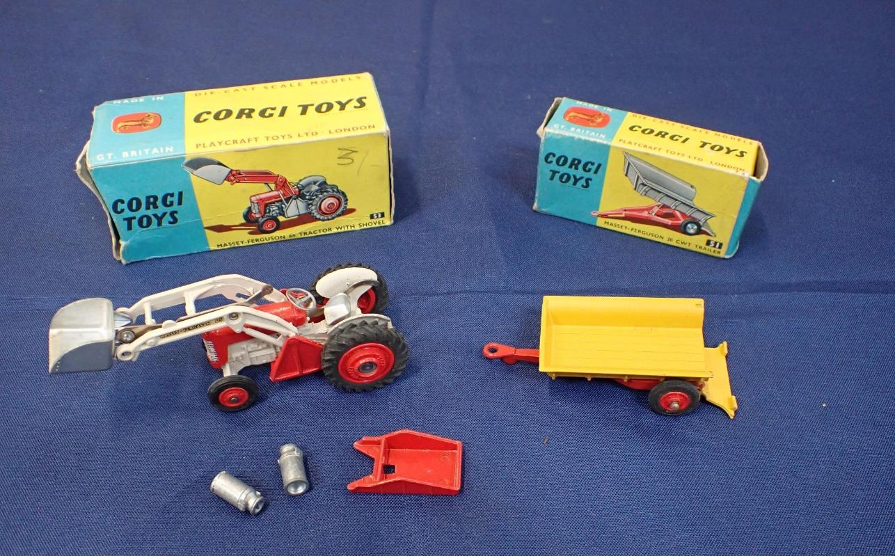 CORGI TOYS MASSEY-FERGUSON 65 TRACTOR WITH SHOVEL, MODEL 53 and 30 cwt trailer, model 51, both boxed (2)