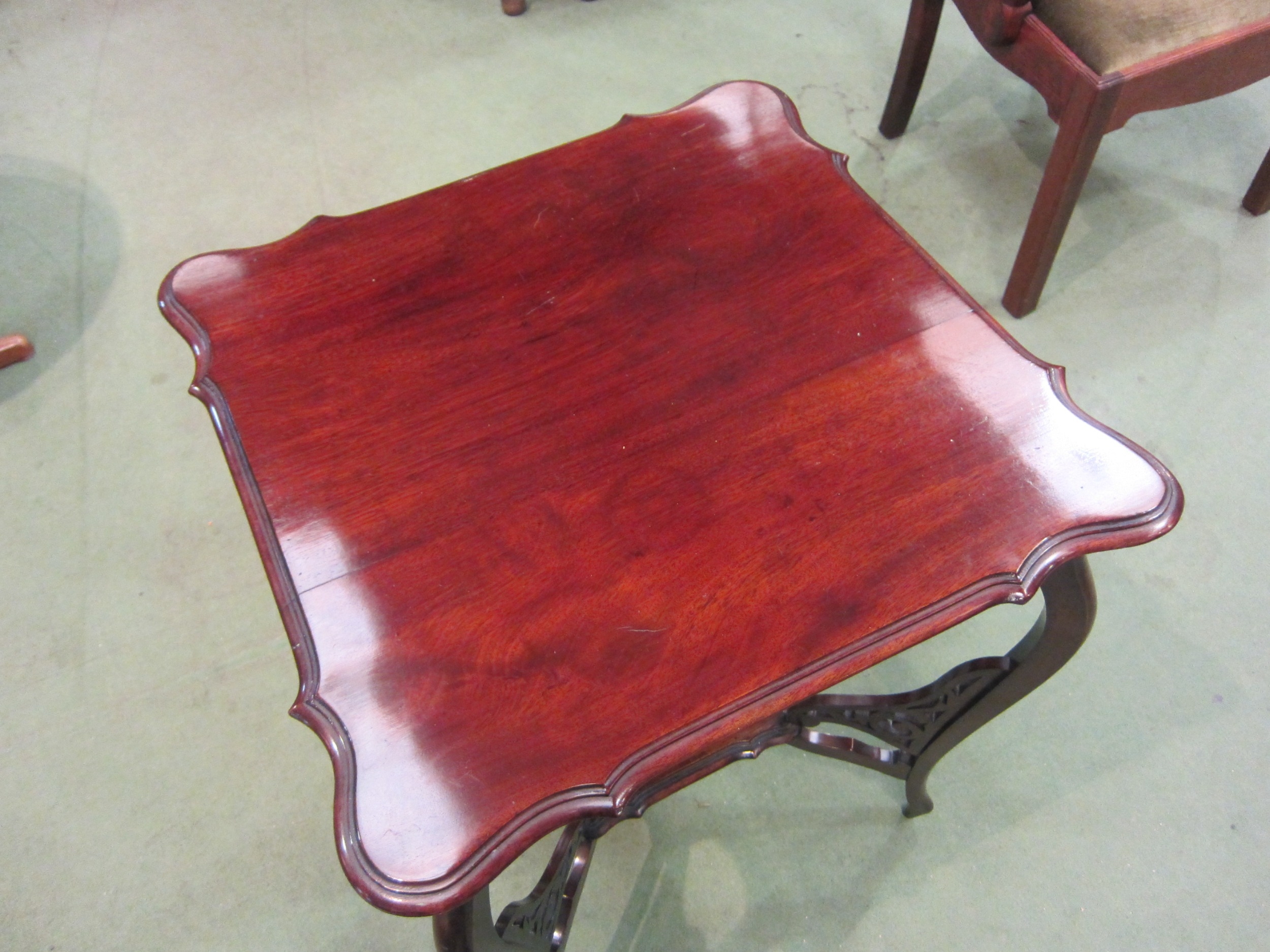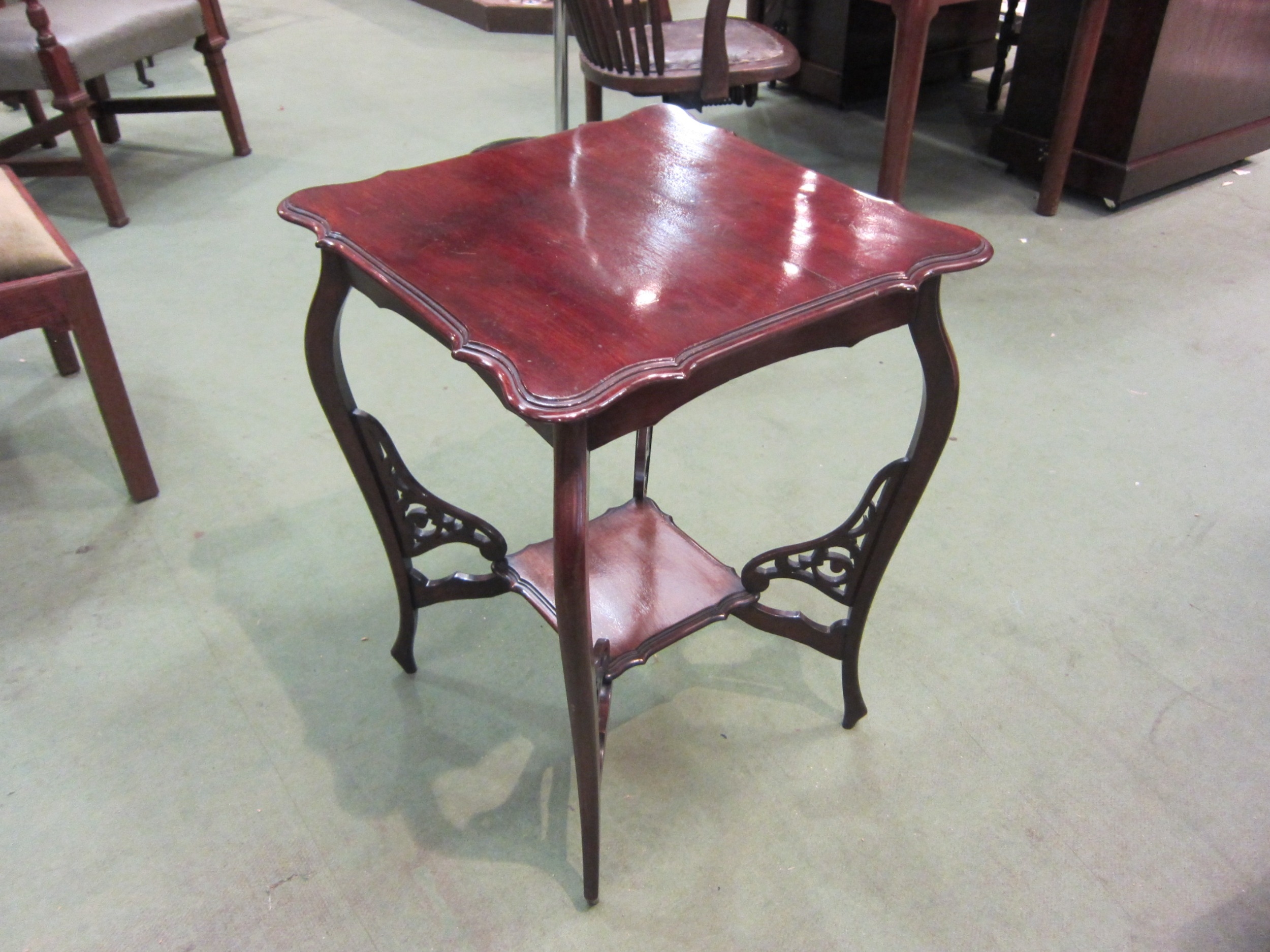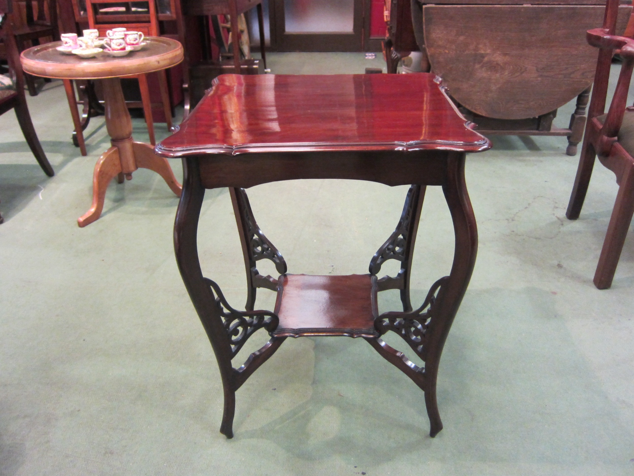 A mahogany occasional table with under-tier, carved fretwork detailing, 70cm tall x 52cm wide