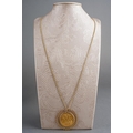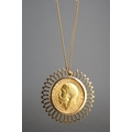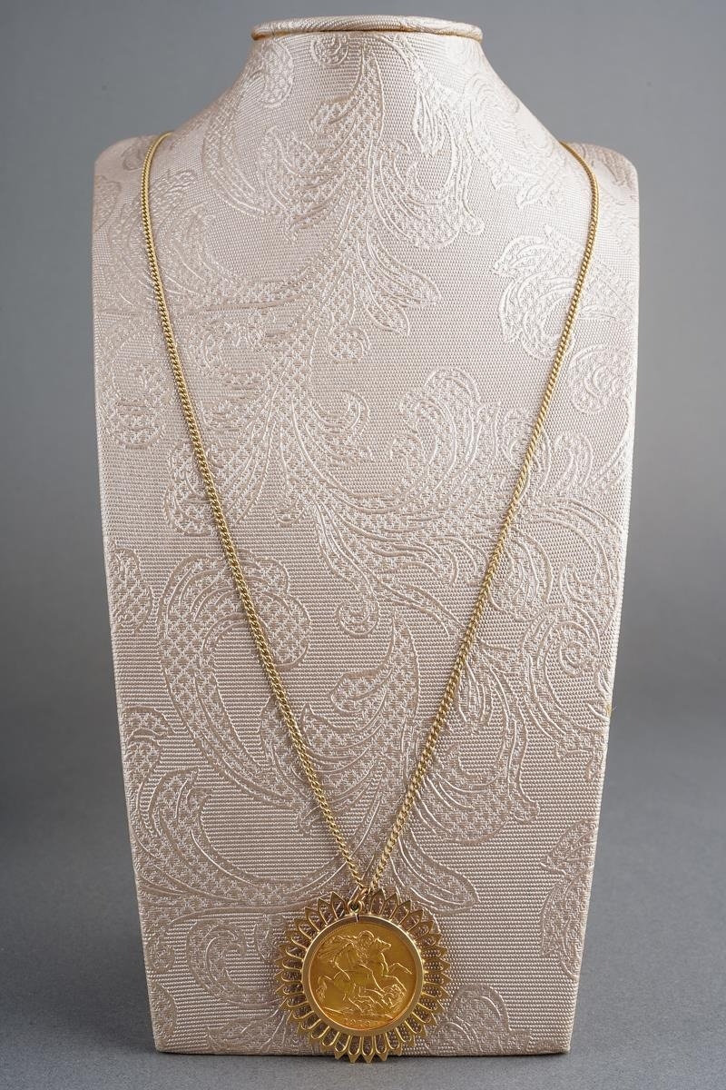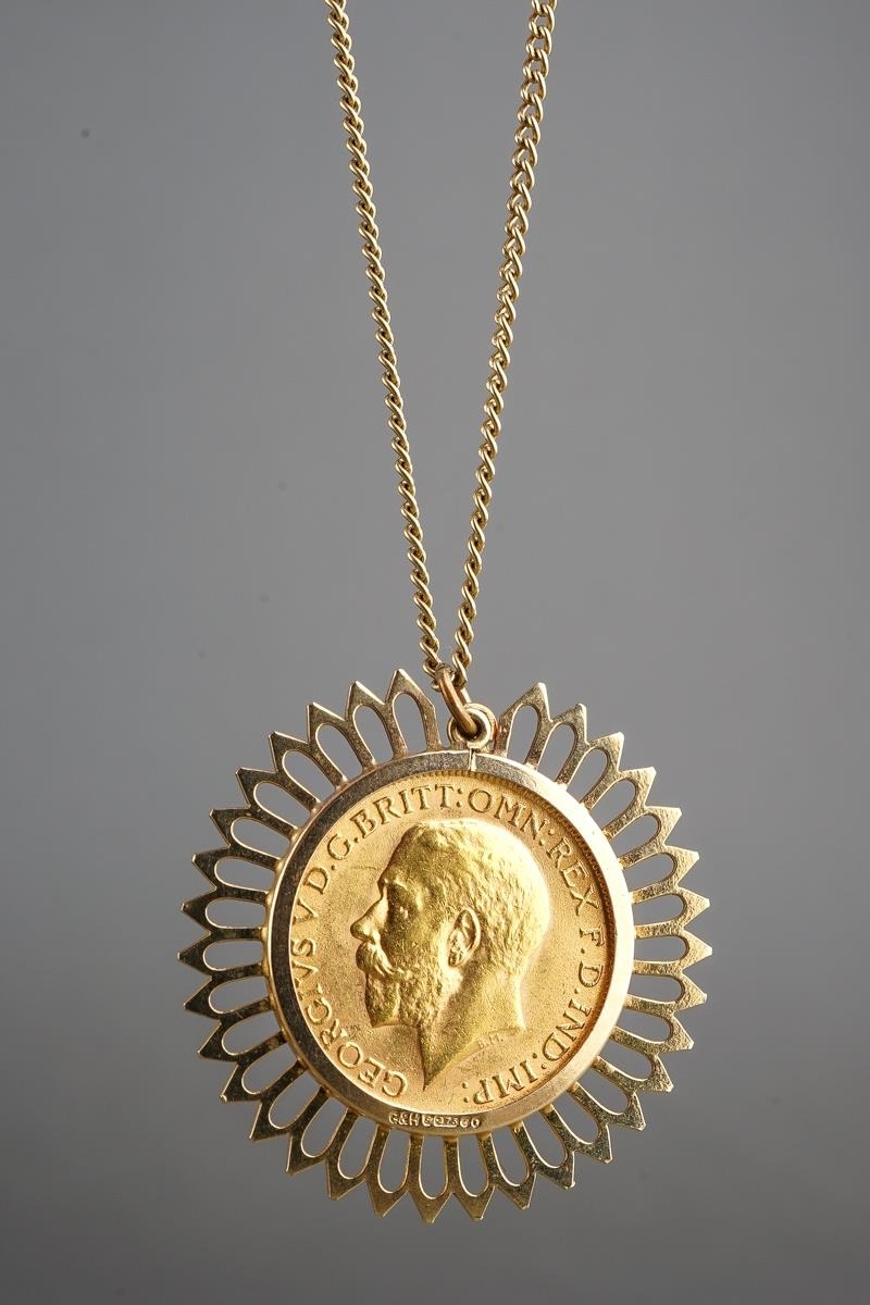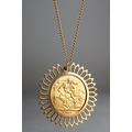 1913 sovereign on 9 ct gold mounts and a yellow metal ( marked 9 ct) chain. Gross total weight approx. 14.7g