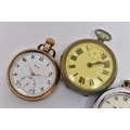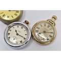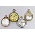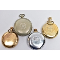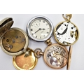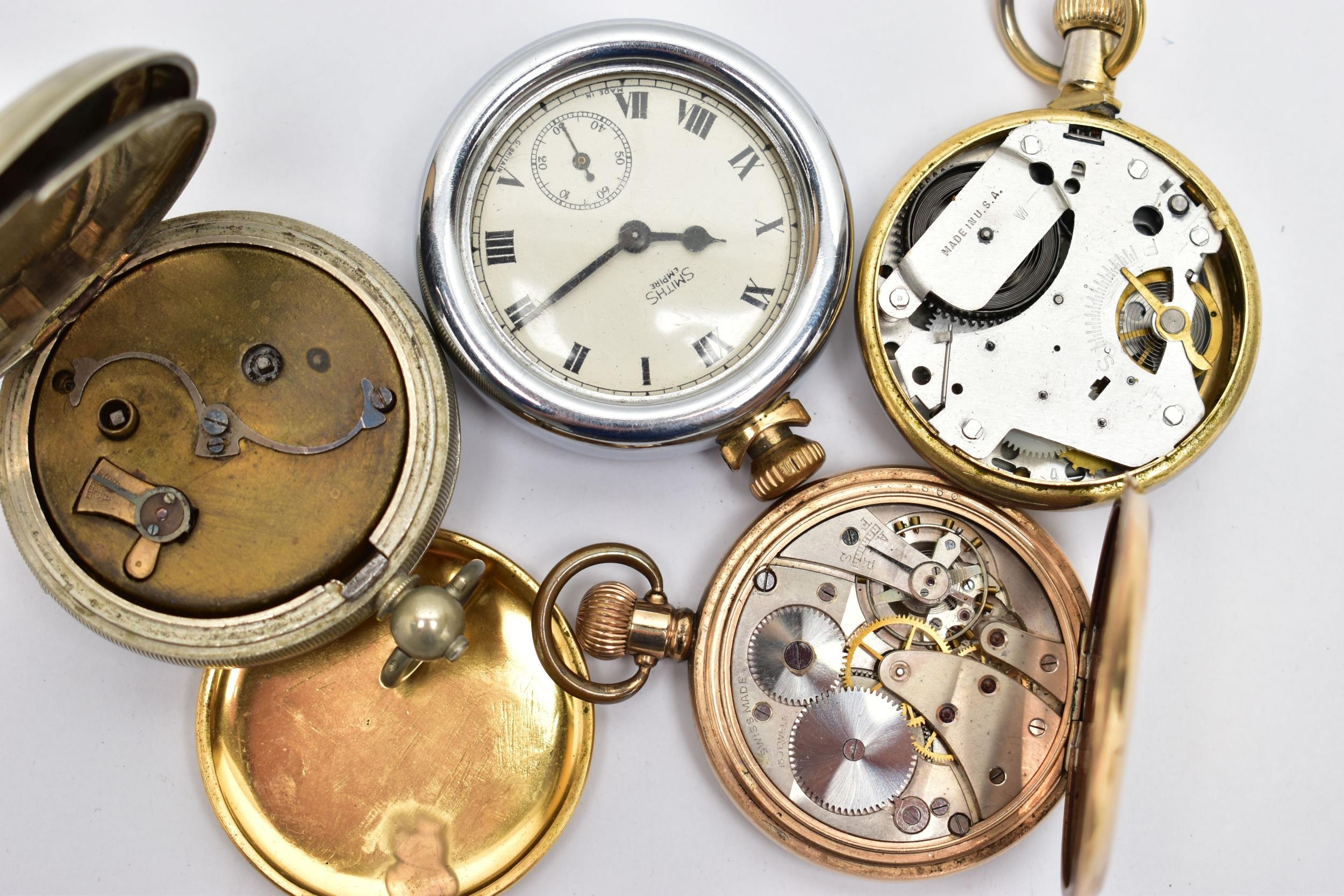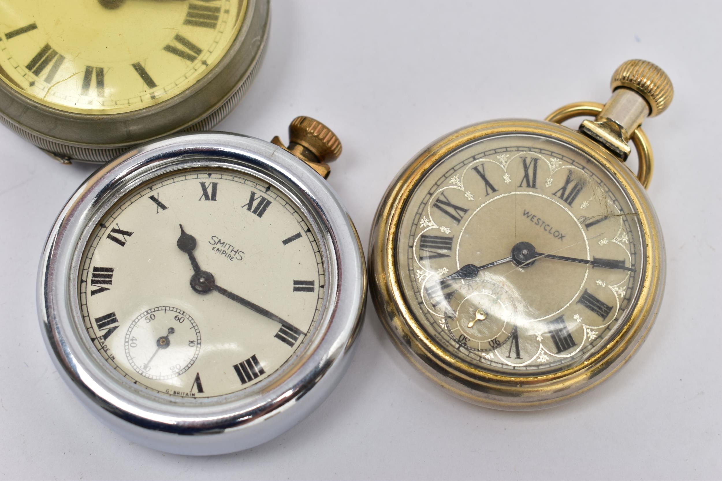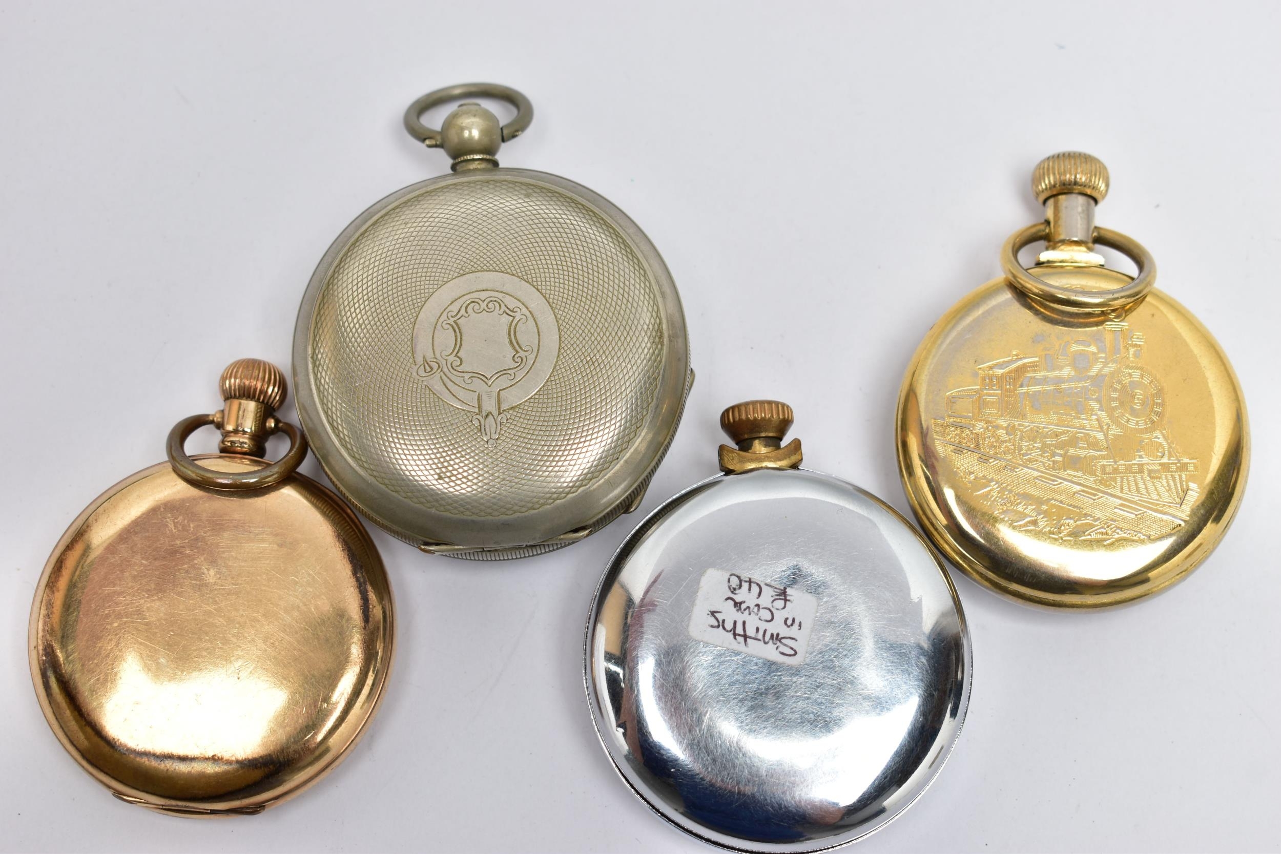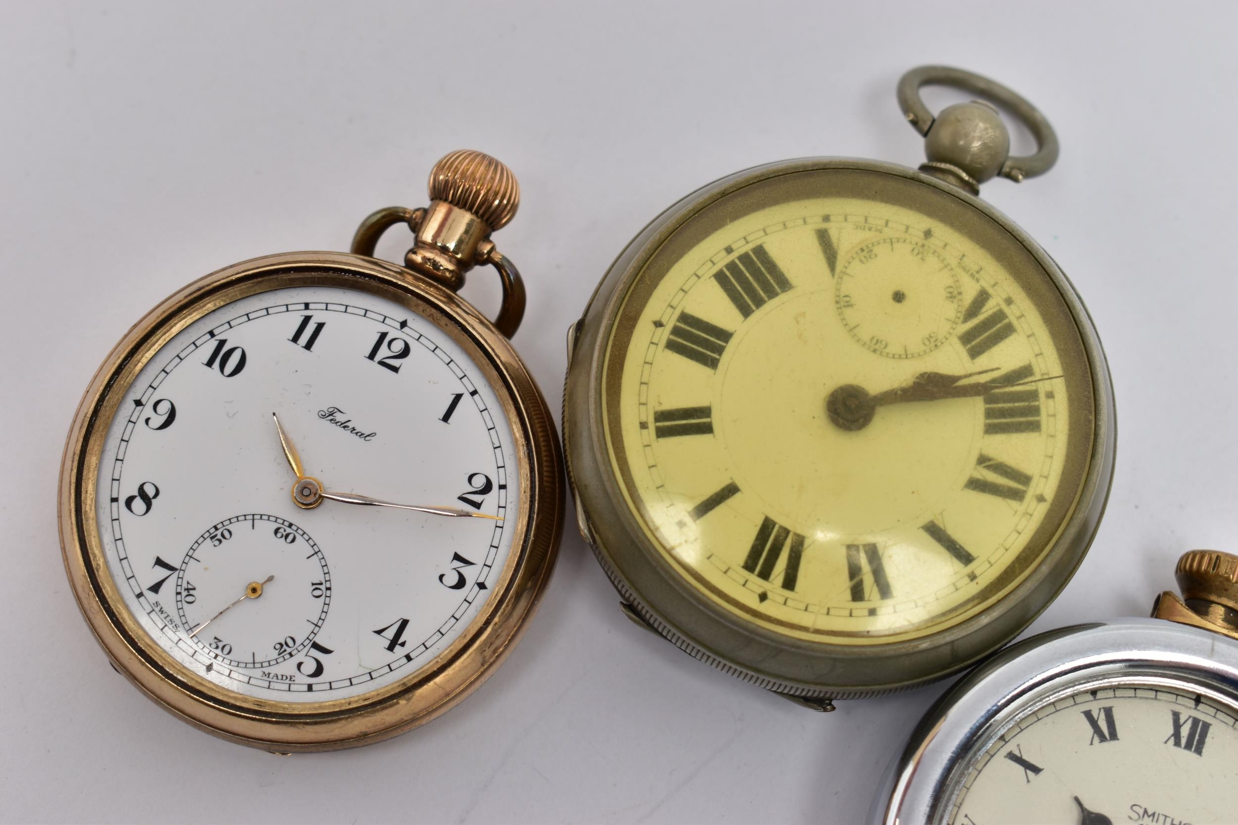 FOUR POCKET WATCHES, to include a gold plated open face 'Federal' pocket watch, white dial, Roman numerals, subsidiary dial at the six o'clock position (missing glass front, broken hands) within a polished case, inside case back signed 'Dennison Star', a gold plated 'Smiths Empire' open face pocket watch with an outer white metal case, a base metal open face pocket watch, and a novelty 'Westclox' open face pocket watch (condition report: not tested, some wear and damage)