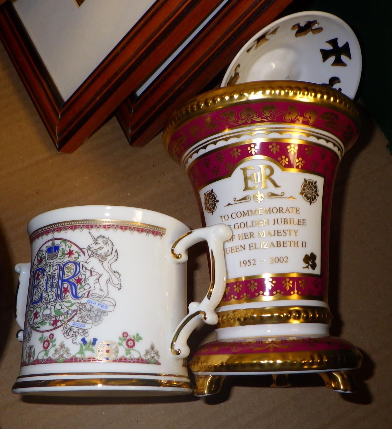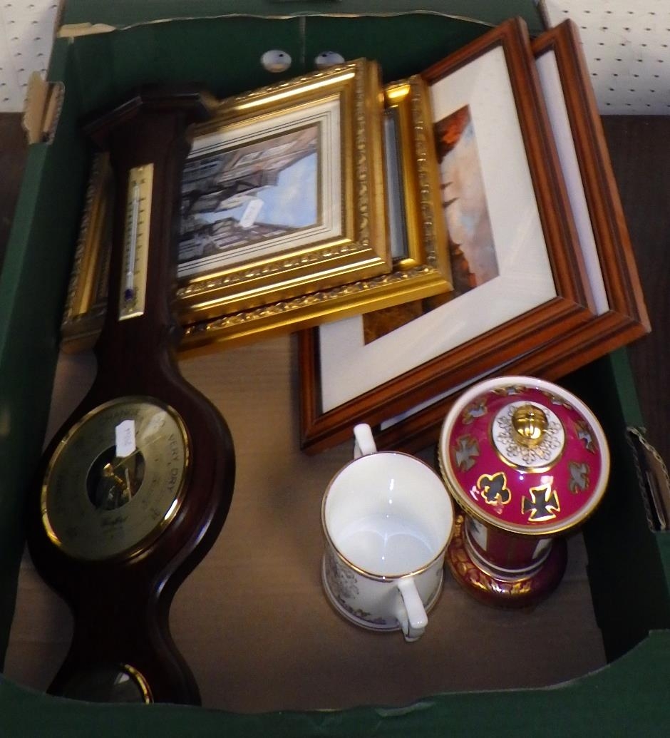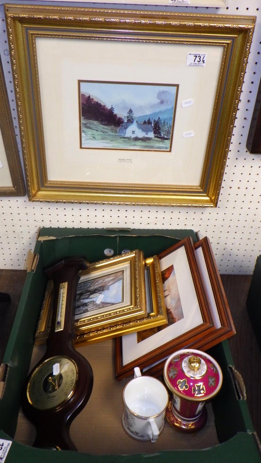A Balmoral Cottage H.R.H Prince of Wales print together with further prints, a Spode ER II Golden Jubilee lidded vase and a Platinum Jubilee cup etc