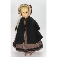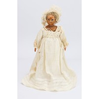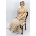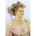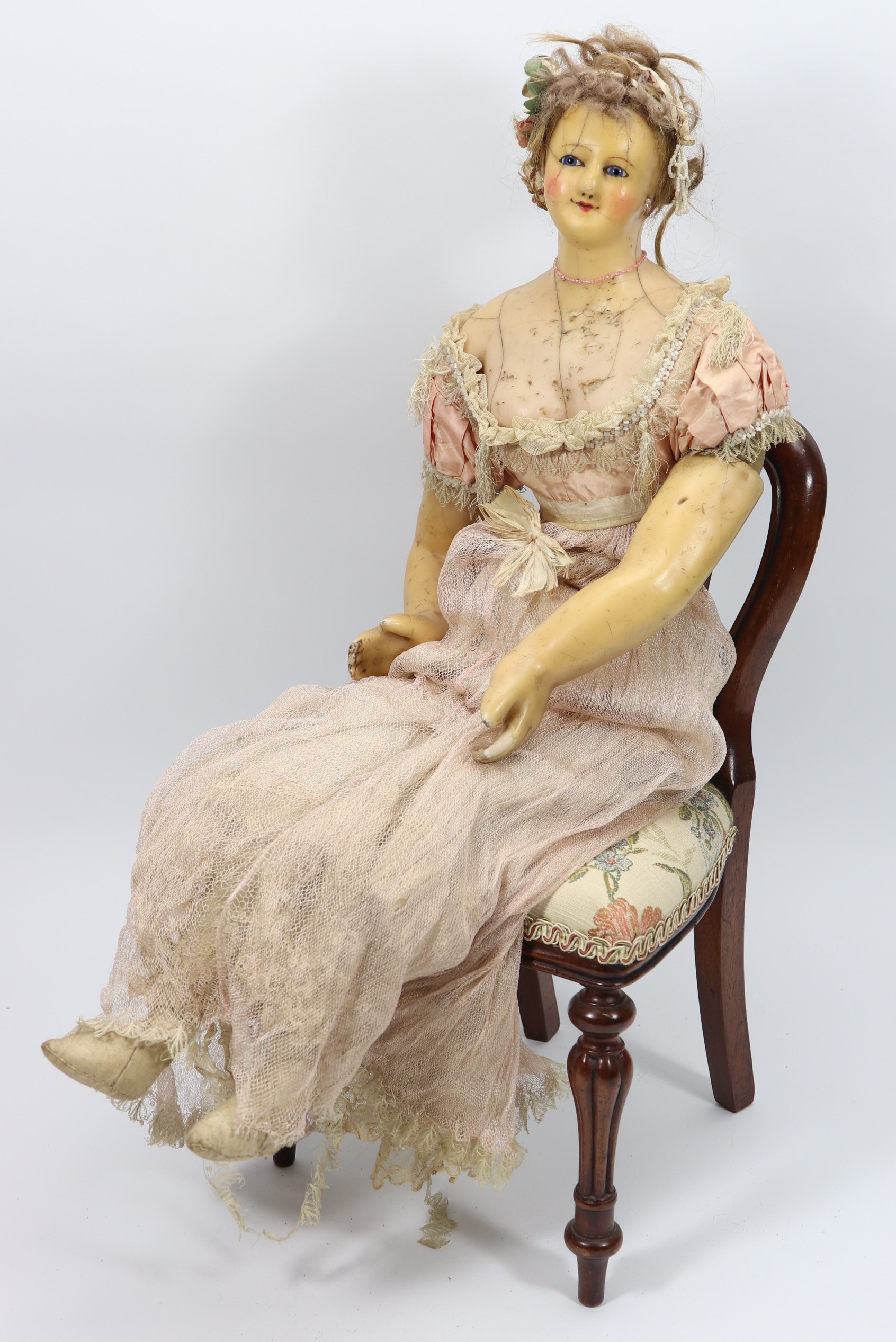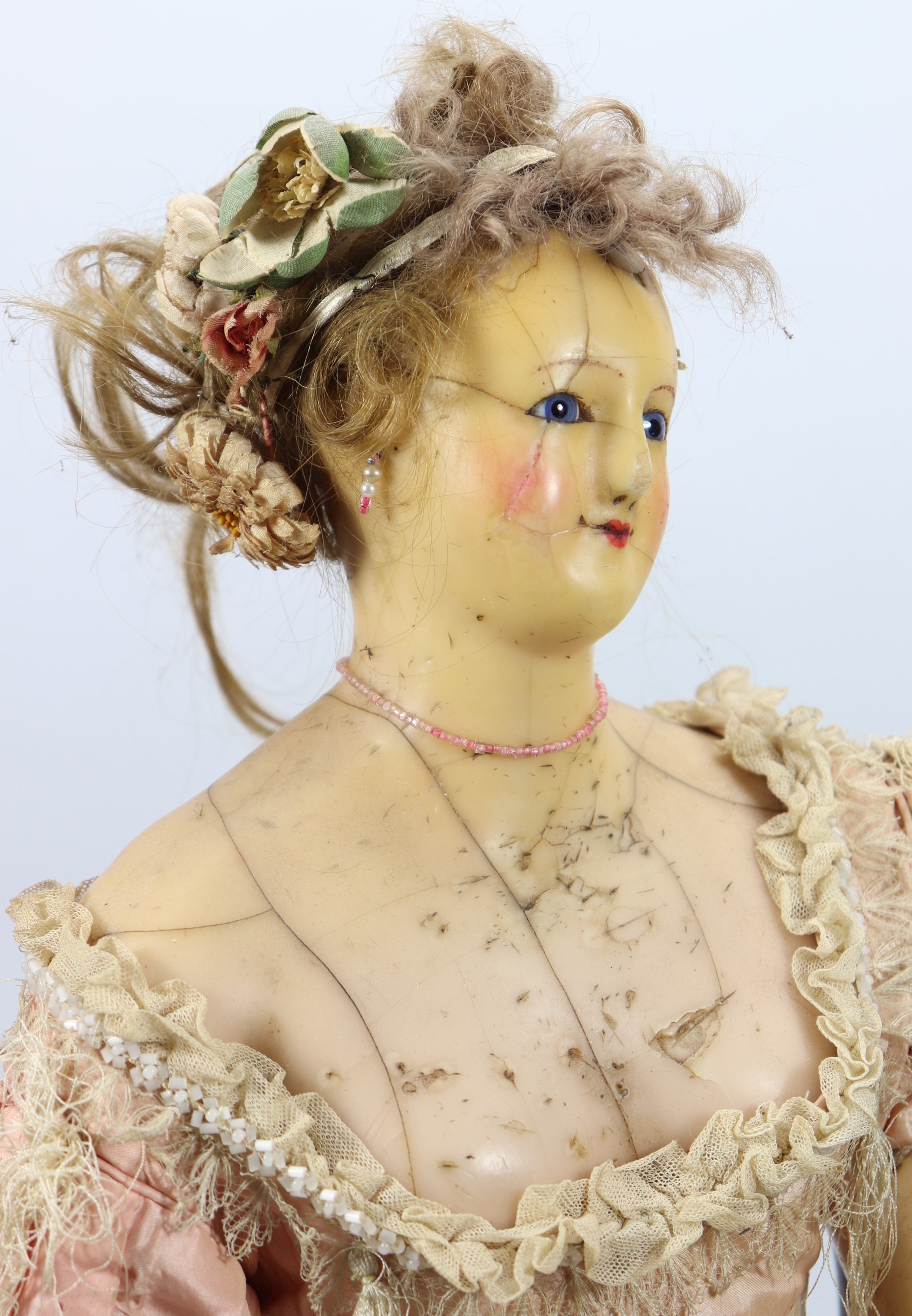 A rare large all original wax over composition lady doll, English circa 1860, the elongated face with fixed blue glass eyes, painted brows and smiling mouth, pearl earrings and brown wig in bun, decorated with garland of cloth flowers, moulded bosom and on a cloth body with wax over lower arms, wearing a high waisted pink silk dress with low neckline, netting to skirt, bodice laced at back, and white bloomers, 30" (76cm) tall, (condition: some cracks to head, slight loss to hands).