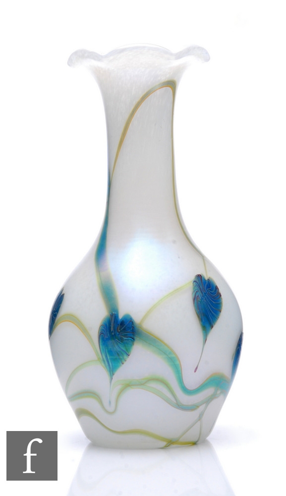 Okra - A later 20th Century studio glass vase of ovoid form with tall collar neck and frill rim, decorated with iridescent stylised leaves in green and blue against the mottled opal ground, engraved signature, and dated 1989, height 22.5cm.