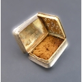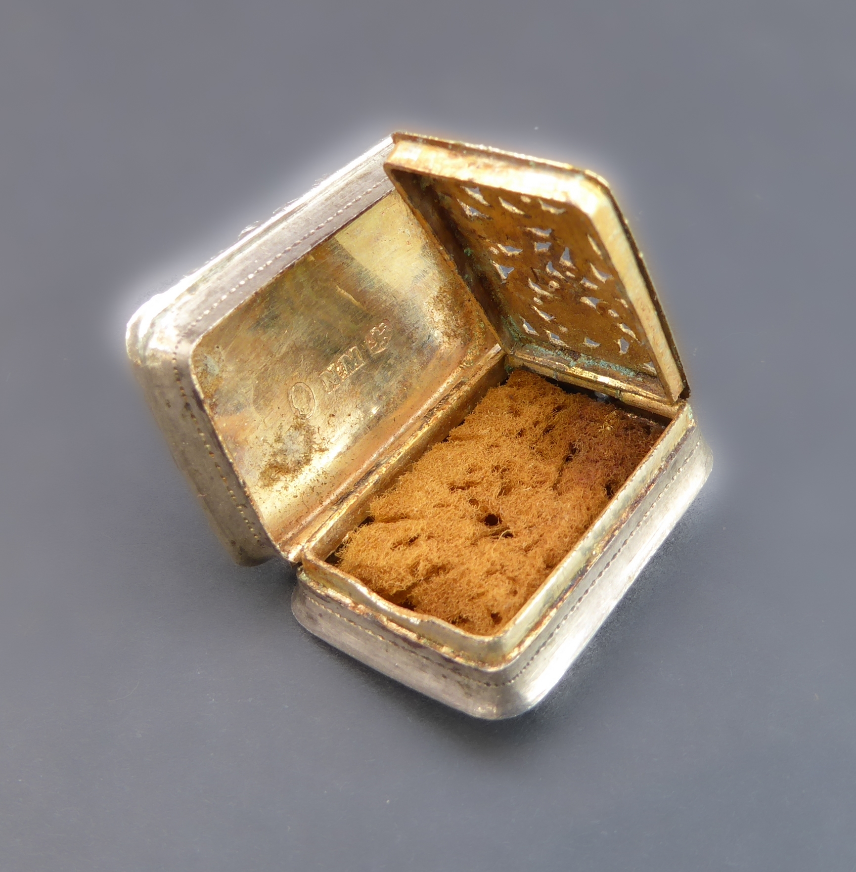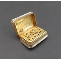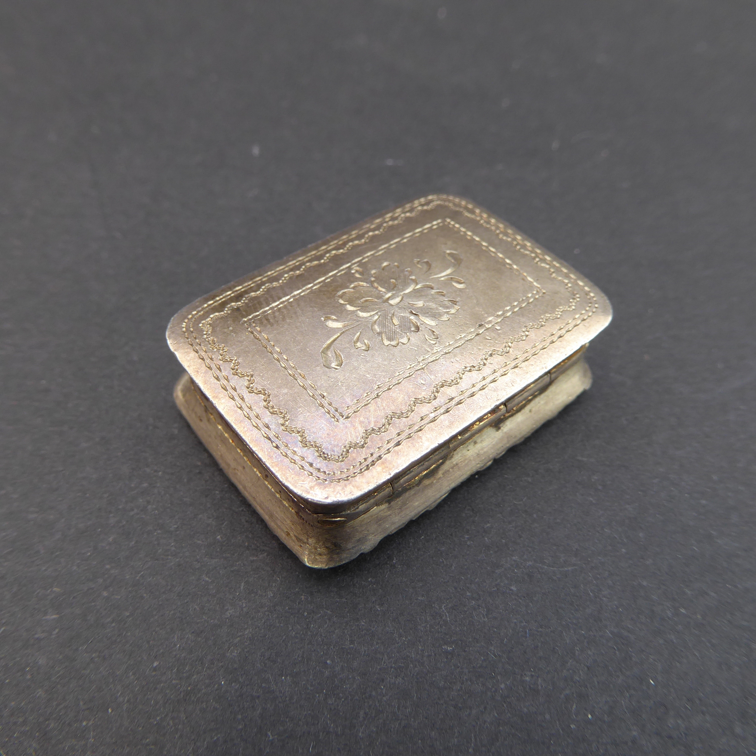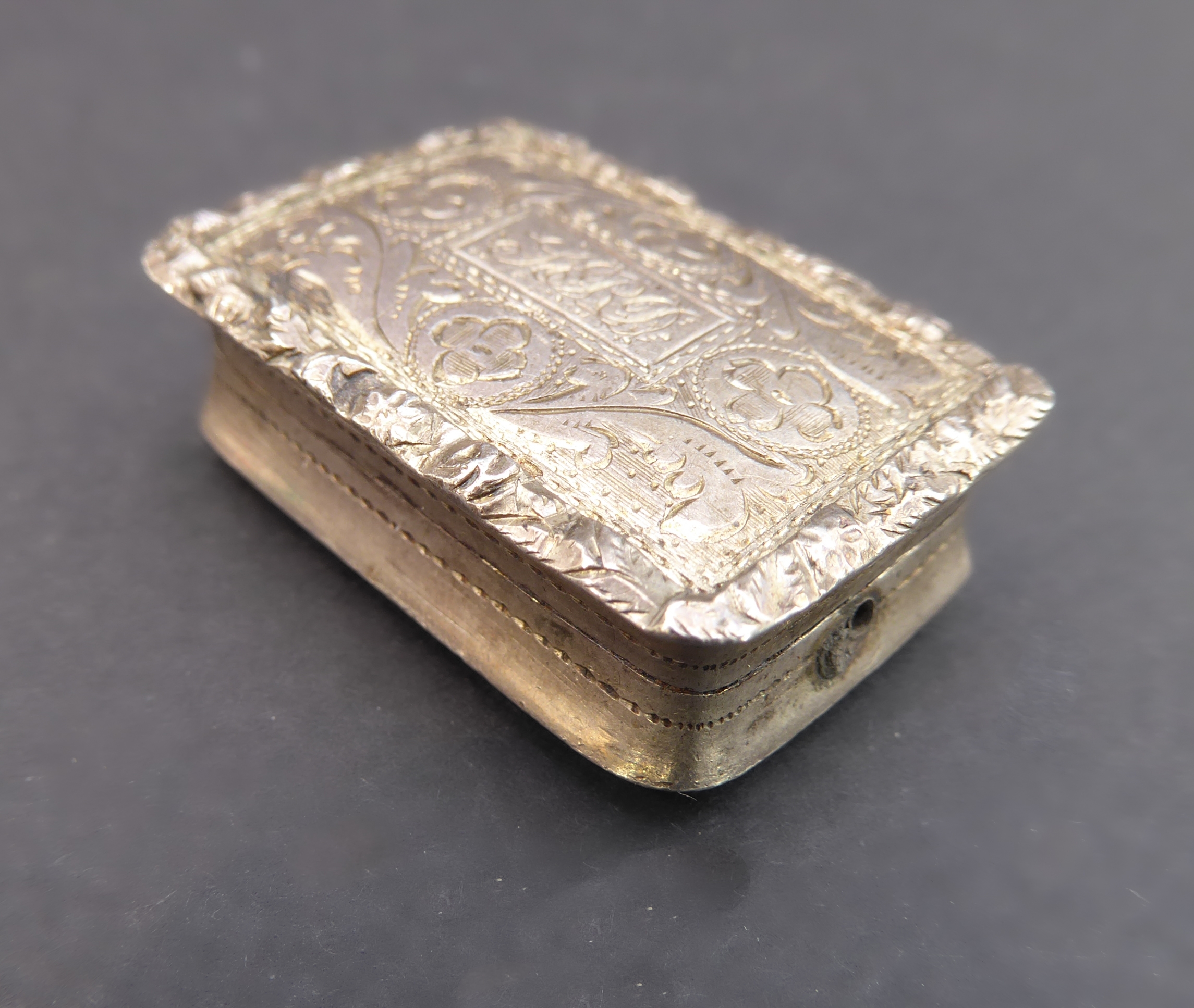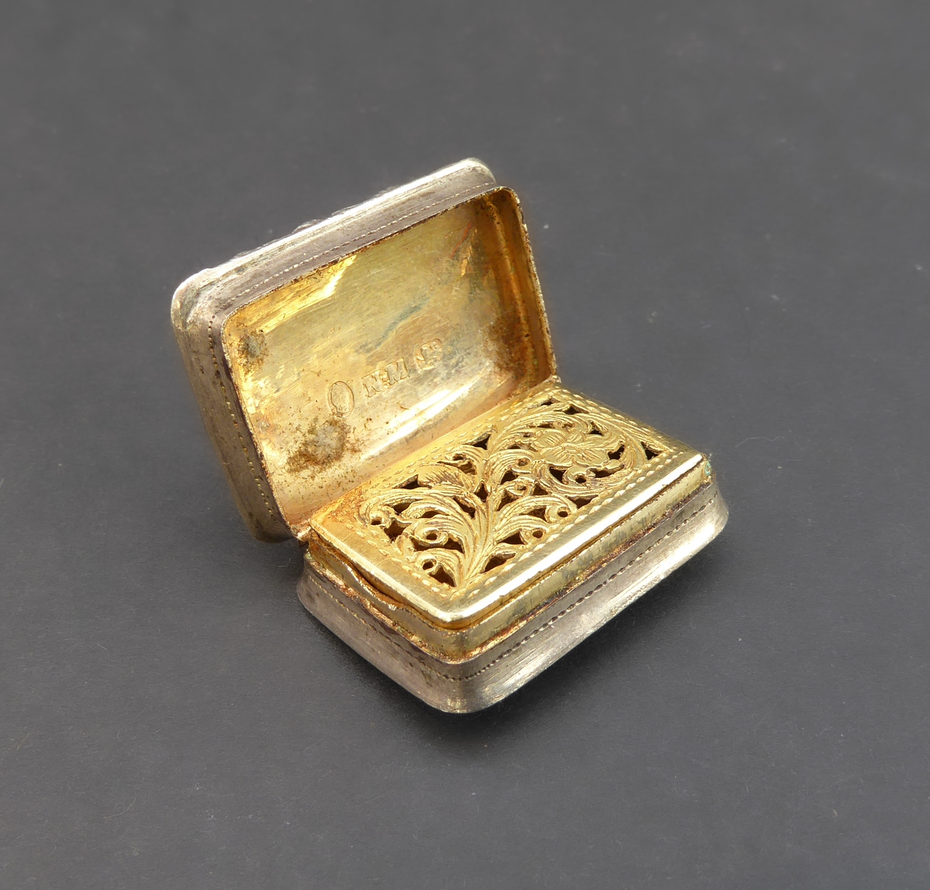 A William IV period silver vinaigrette by Nathanial Mills: the finely engraved lid with central monogrammed cartouche and slightly raised border opening to reveal gilded interior with foliate-style pierced hinged grill and (probably original) sponge; bright-cut decoration to the underside; assayed Birmingham, probably 1836.