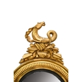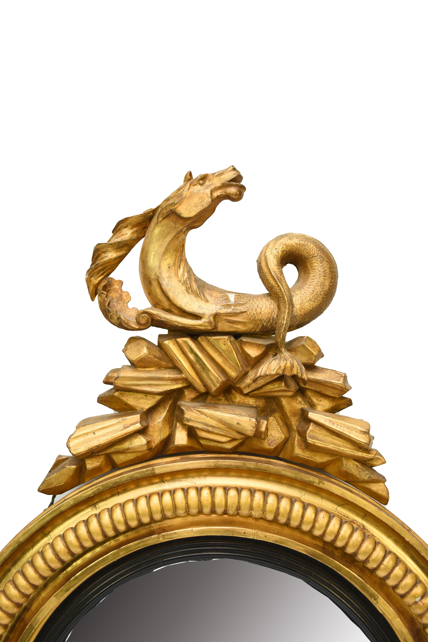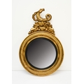 A Regency giltwood and parcel ebonised convex mirror Circa 1820, the circular frame surmounted by a hippocampus on rockwork. 117cm high (plate 53cm dia.) Wirswall Hall, Whitchurch, Shropshire. Footnote:A very similar mirror was sold at Christie's New York rooms, Rooms as Portraits: Michael S. Smith; A Tale of Two Cities, New York & Los Angeles, 26 September 2018, lot 13.