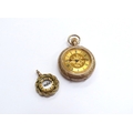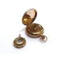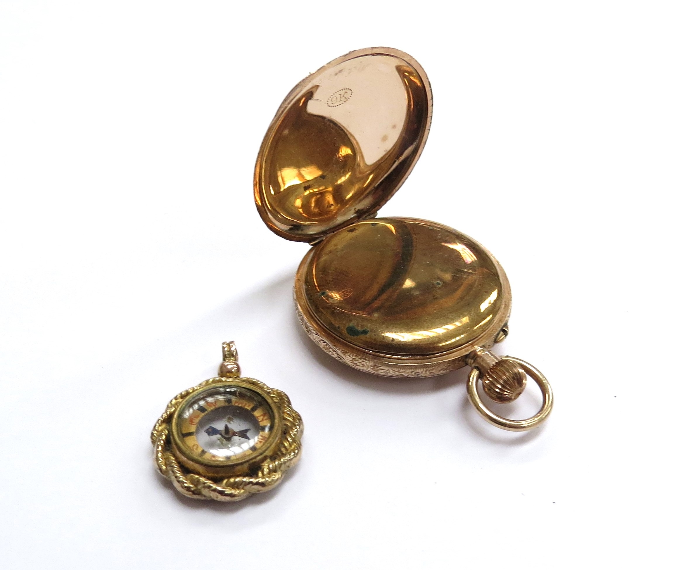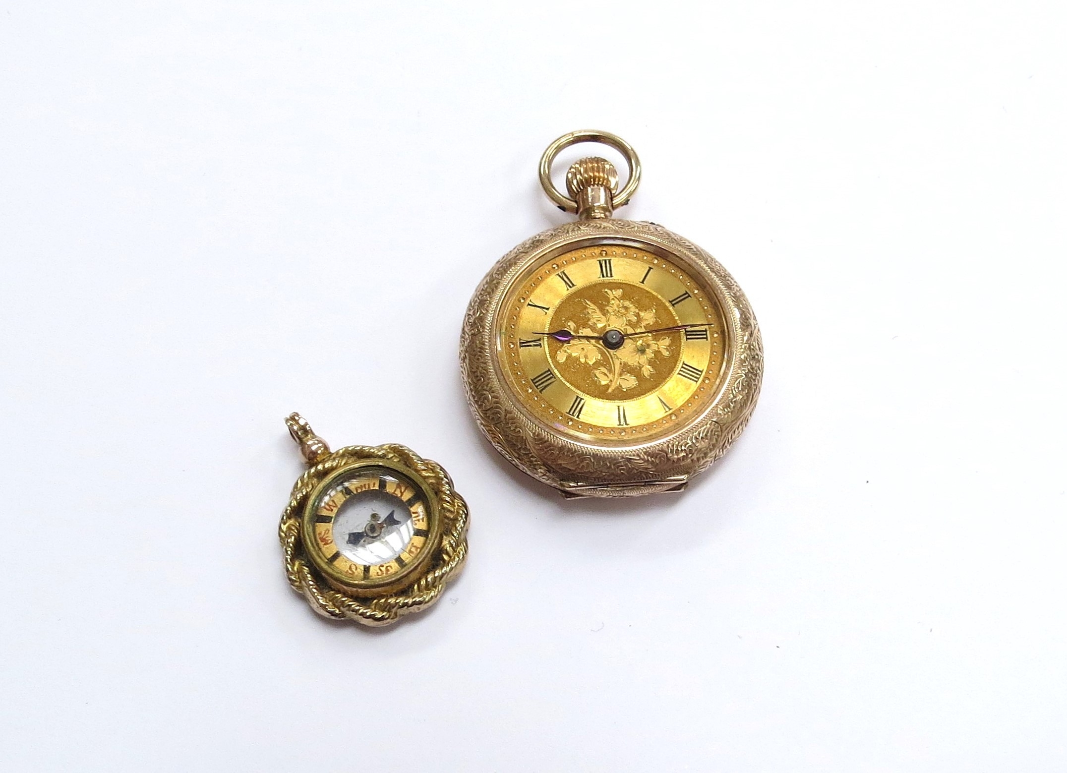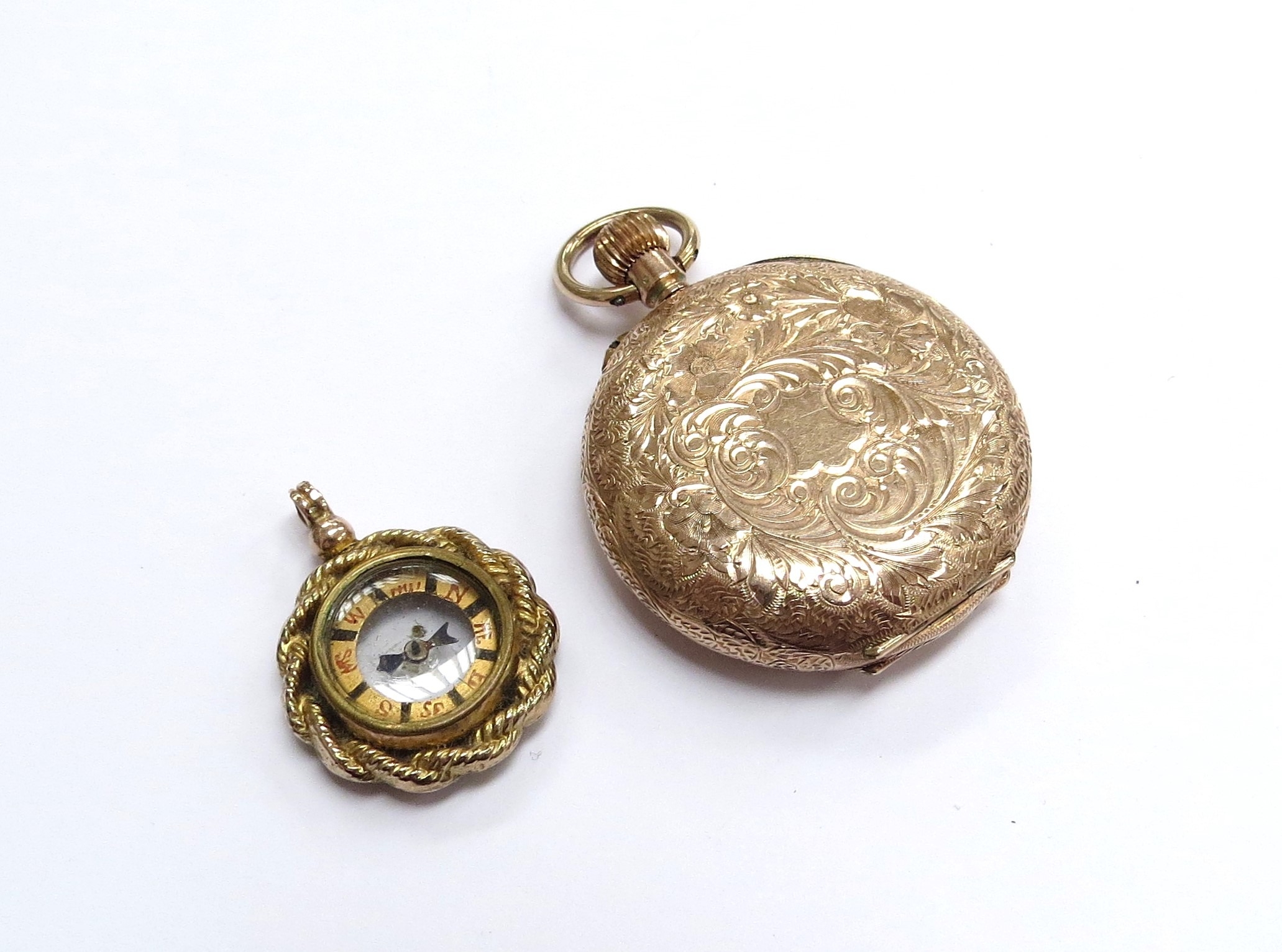 A gold fob watch with engraved back marked 9k and a gold compass fob, unmarked (a/f), 31.7g total
