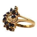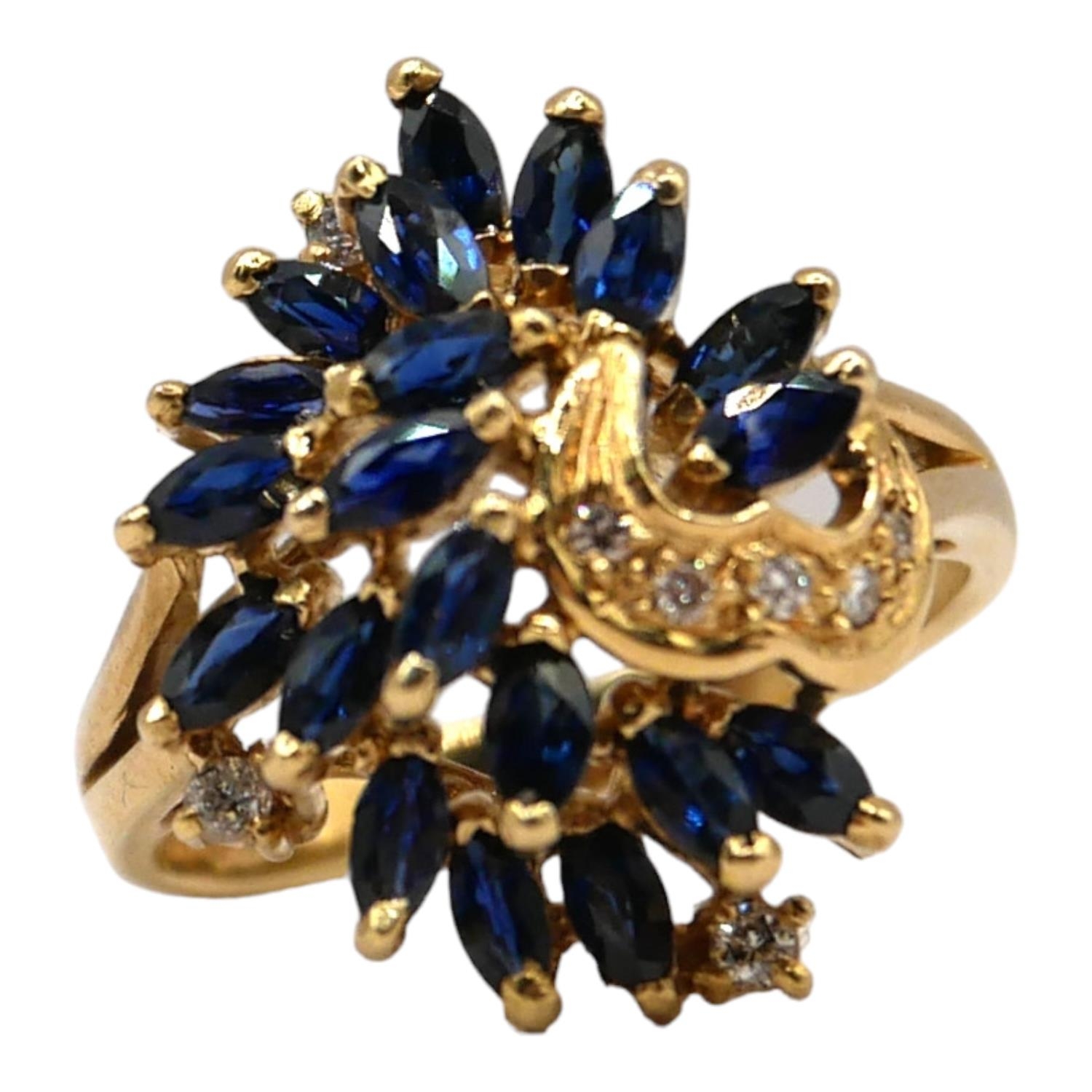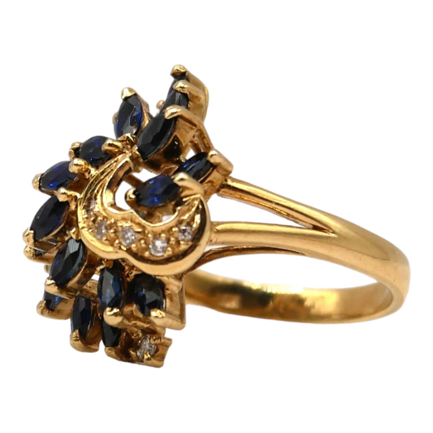 A 14CT GOLD, DIAMOND AND BLUE SPINEL CLUSTER RING
