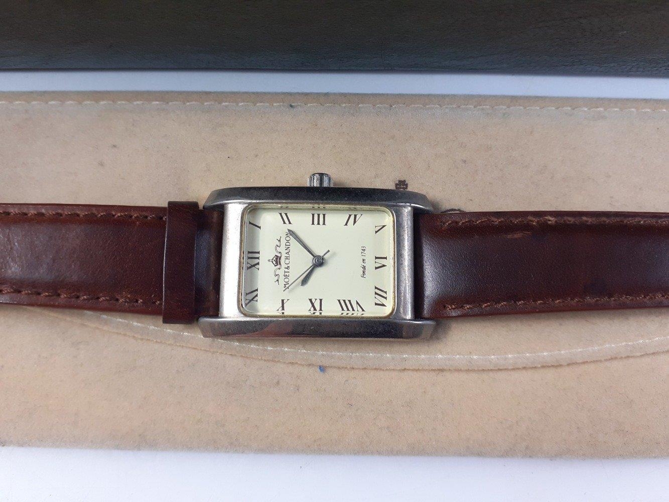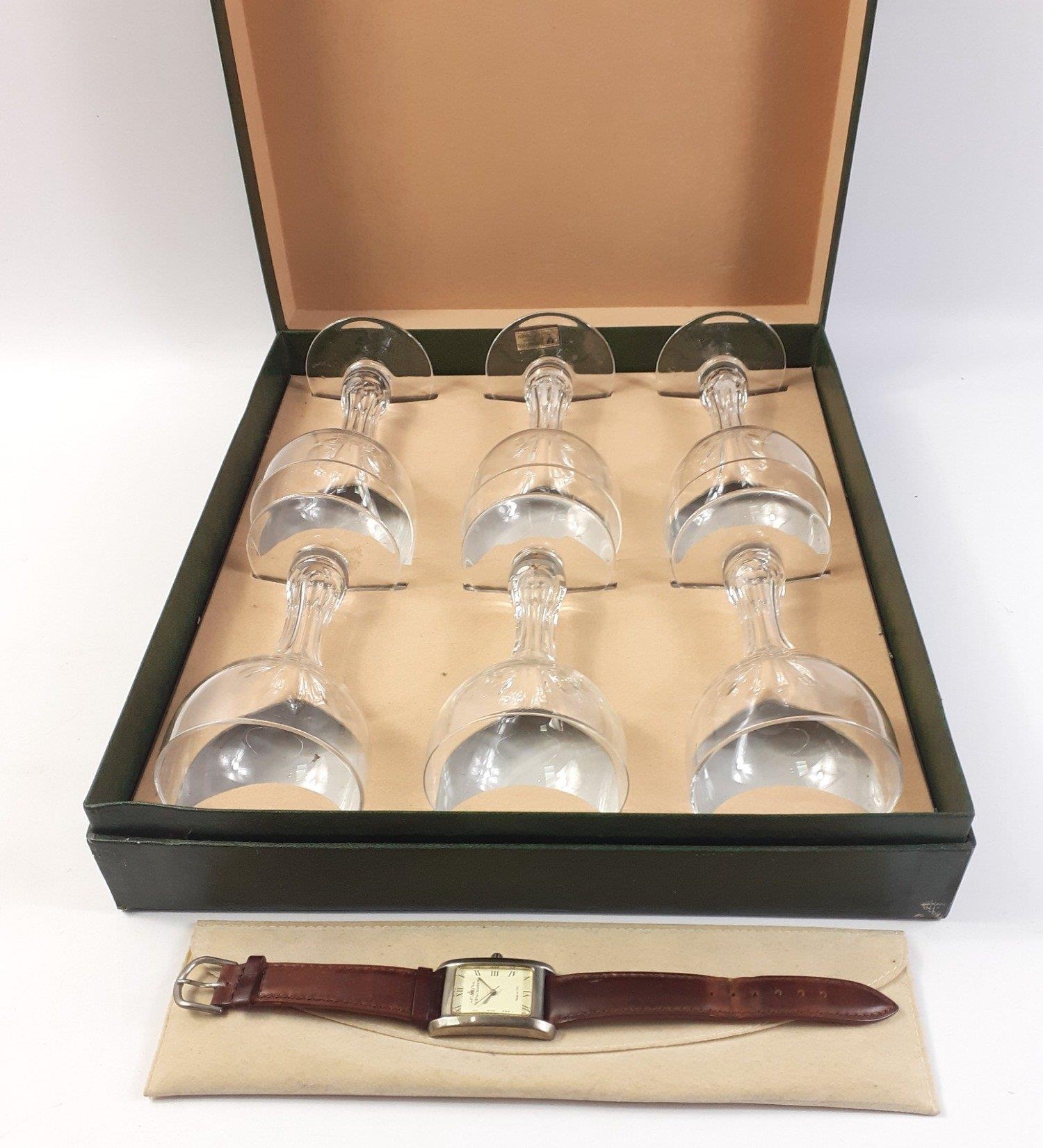Direct to you from THE HOTEL PARIS IN MONTE CARLO via PEEBLES AUCTION HOUSE. A set of six MOET & CHANDON crystal wine glasses and a MOET & CHANDON watch in plush sleeve (not running, suspect a new battery is required). Purchased from the hotel by the vendor.