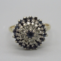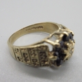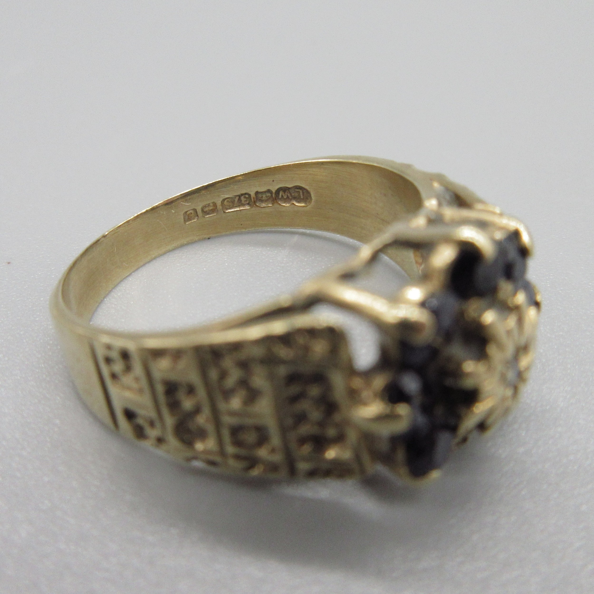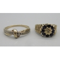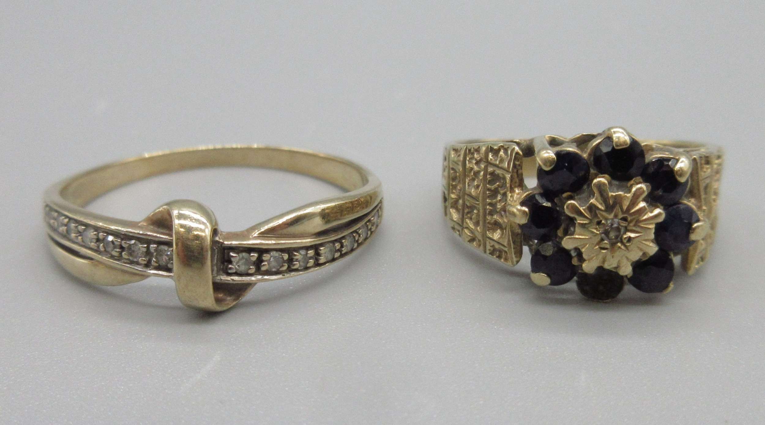 9ct yellow gold flower ring set with sapphires and diamond, stamped 375, size L, 9ct yellow gold twist half eternity ring set with diamonds, stamped 9k, size U, 5.0g