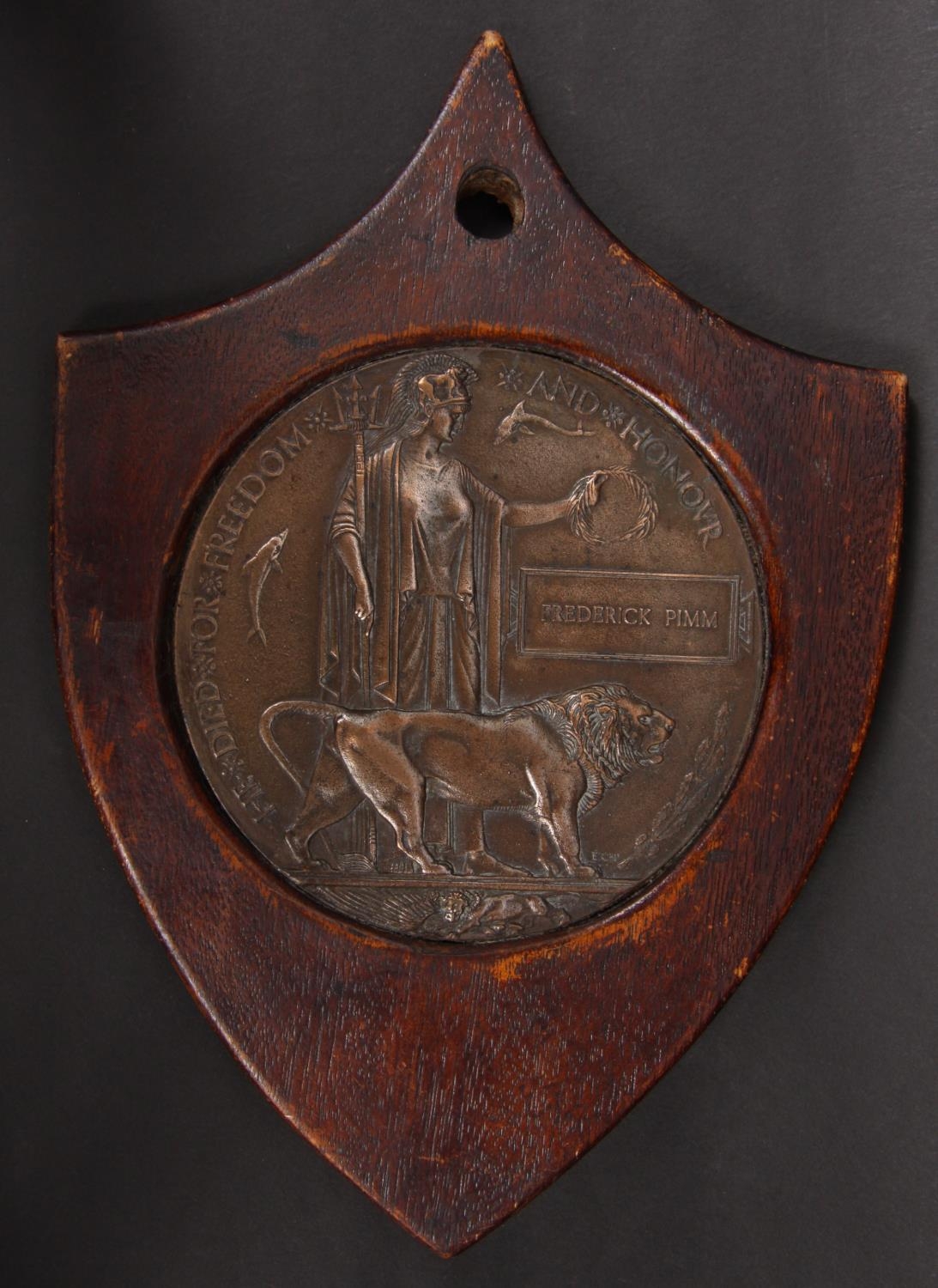 Medal, World War One, Death Plaque, Frederick Pimm, in wooden shield frame, 26913 L/Corporal Frederick Percival Pimm, 6th Battalion, Prince Albert's (Somerset Light Infantry), (Formerly 25711, Wiltshire Regiment), born Witney, Oxon, Killed in Action 16th Sep 1916
