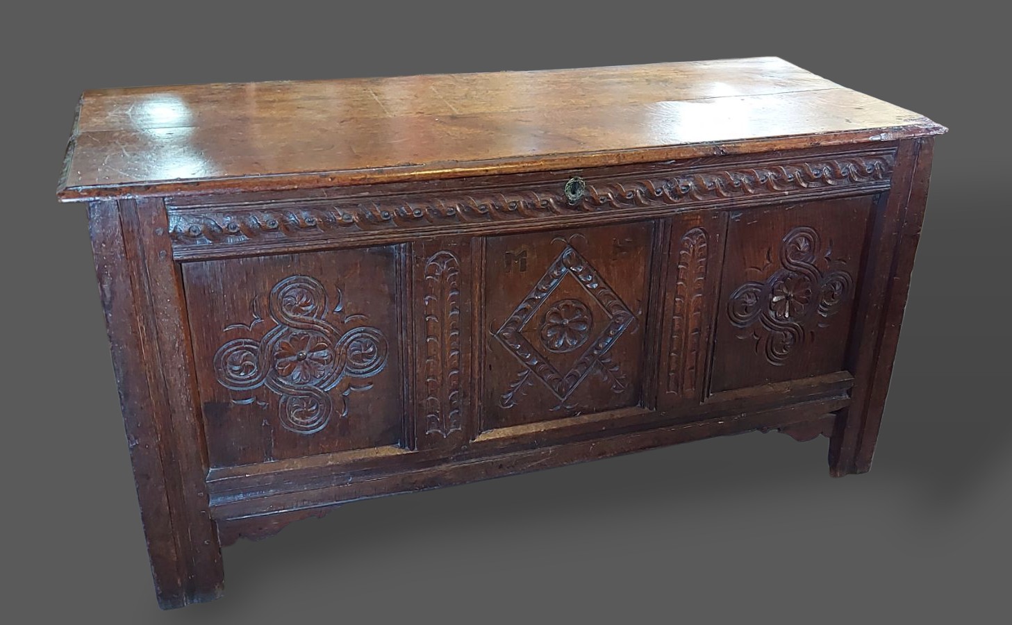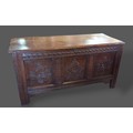 An 18th Century oak Coffer, the hinged top above a triple carved panel front flanked by stiles, 141cms wide, 58cms deep and 71cms tall