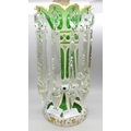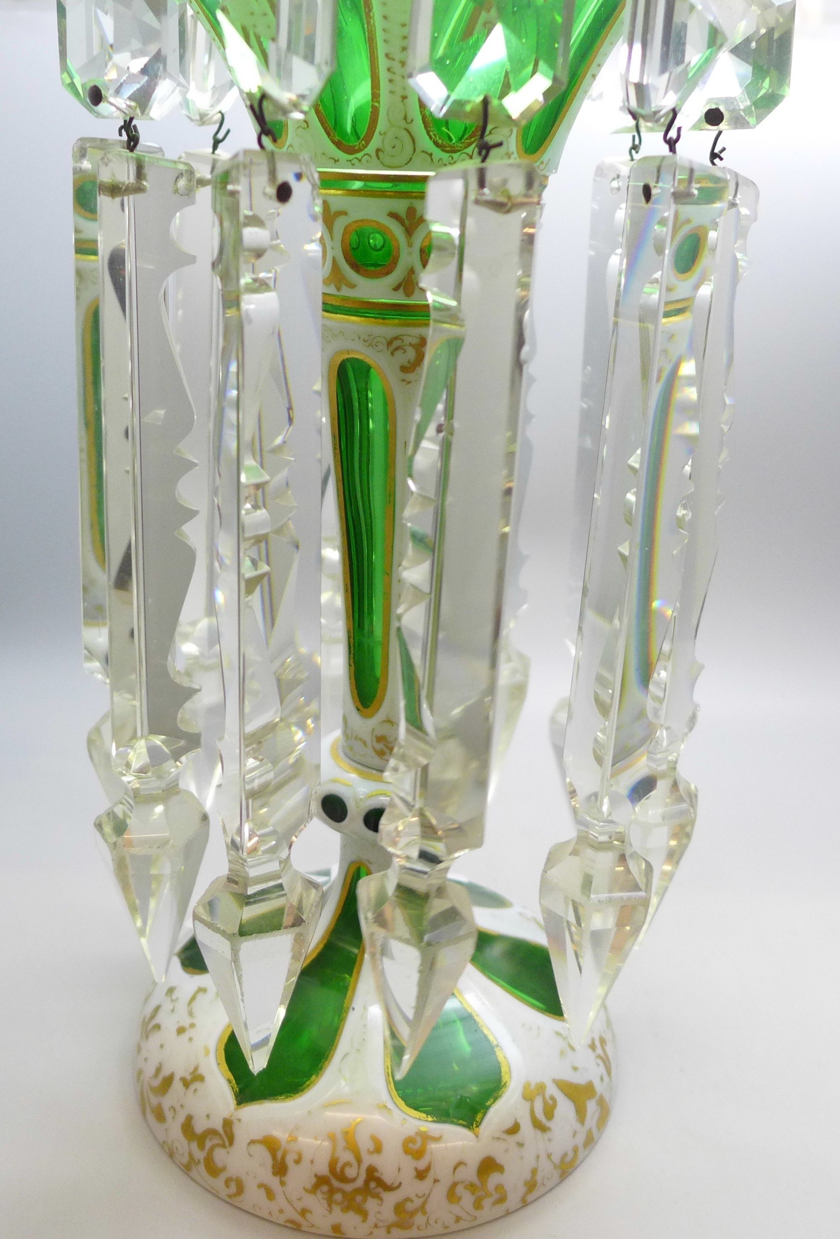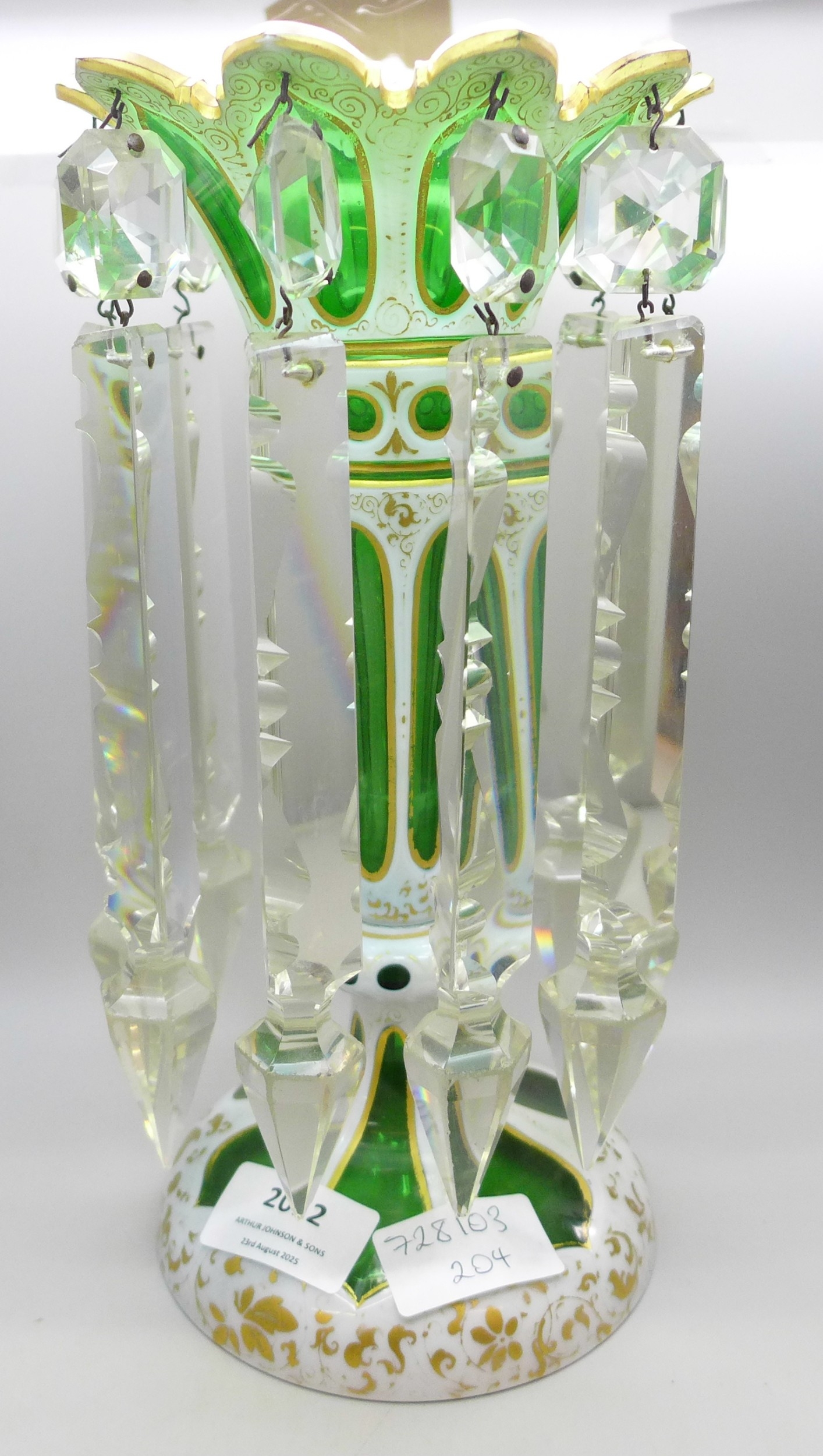 A 19th century Bohemian green and white glass lustre with gilt detail and clear glass droplets, 26cm *THIS LOT IS NOT AVAILABLE FOR PACKING AND POSTING