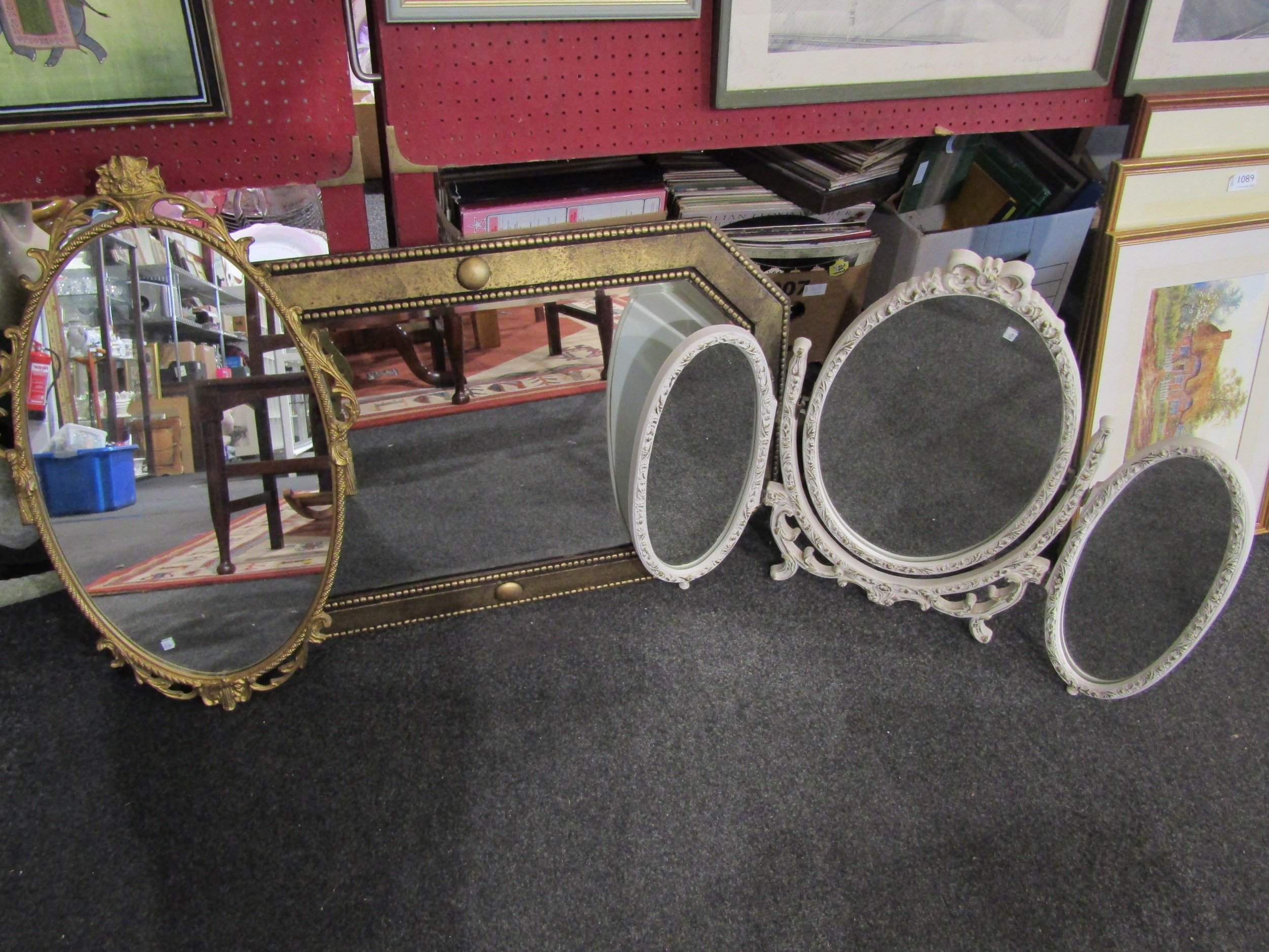 A bevelled octagonal wall mirror, an oval gilt wall mirror and an ornate folding dressing table triptych mirror with removable central panel (3)