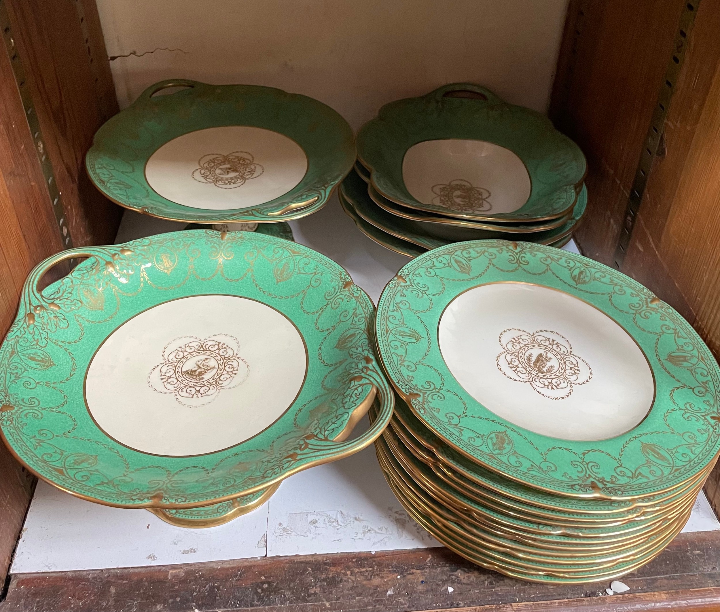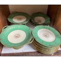 A collection of 18 pieces of Wedgwood W1505 pattern wares including plates, dishes and two comports, each decorated with gilt harp players and scrolling designs to a cream and green ground (SECTION 24)