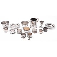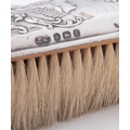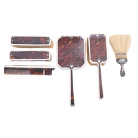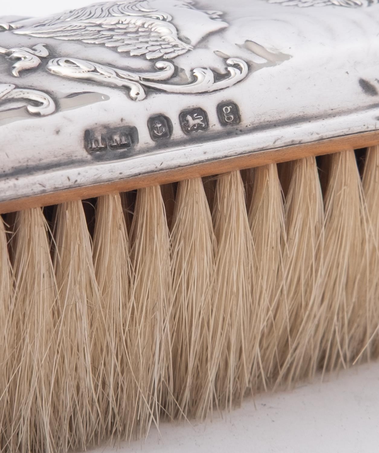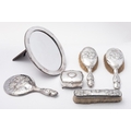 An Edward VIII silver four piece dressing table set by Henry Matthews, 1906, comprising a hand mirror, two long handled hair brushes and a clothes brush, embossed decoration of angel and cherubs, an oval silver and oak backed dressing table mirror by A & J Zimmerman Ltd , Birmingham 1906 and a dressing table casket marks rubbed, probably Birmingham 1910, of shaped form with a hinged lid opening to reveal a lined interior, (6)