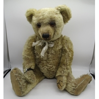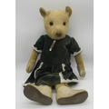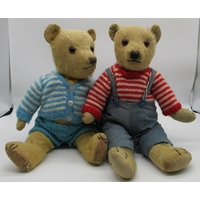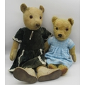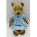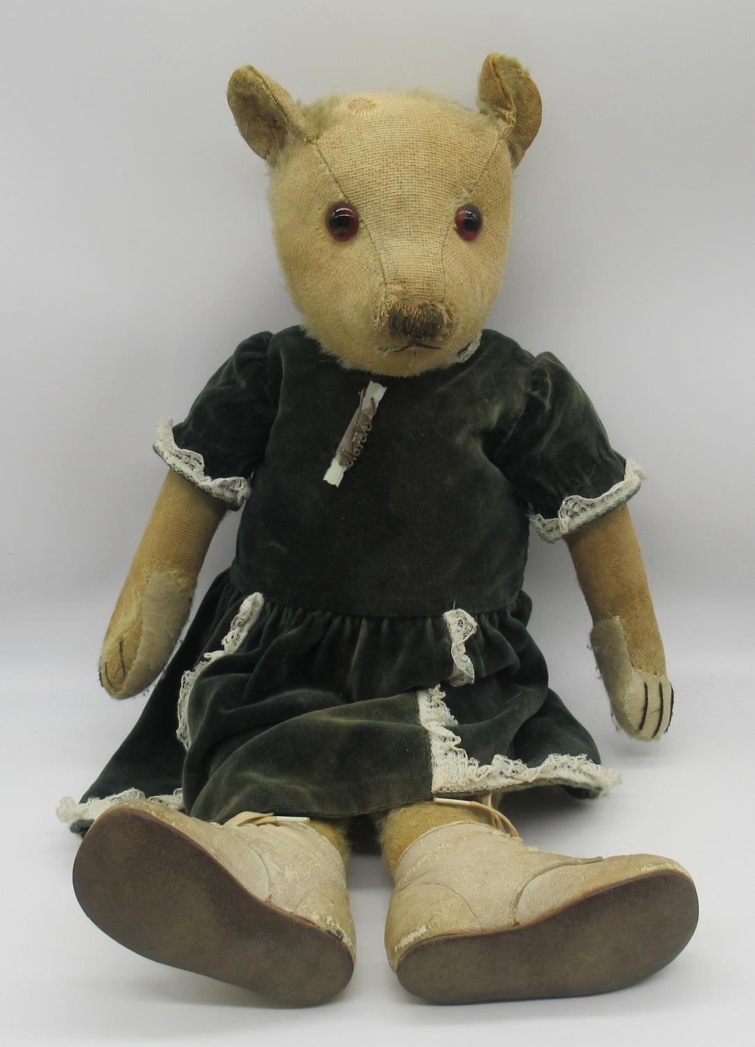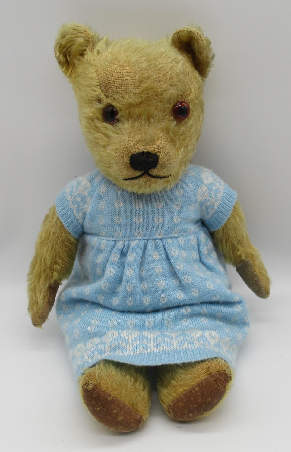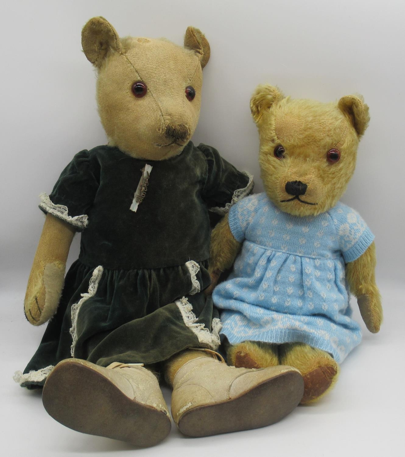 Chiltern c. 1920/30's teddy bear with glass eyes, jointed arms and legs and swivel head, wearing green velvet dress, white leather boots and mother of pearl brooch, H53cm, and one other Chiltern c. 1940's teddy bear, wearing a blue knitted dress, H40cm (2)
