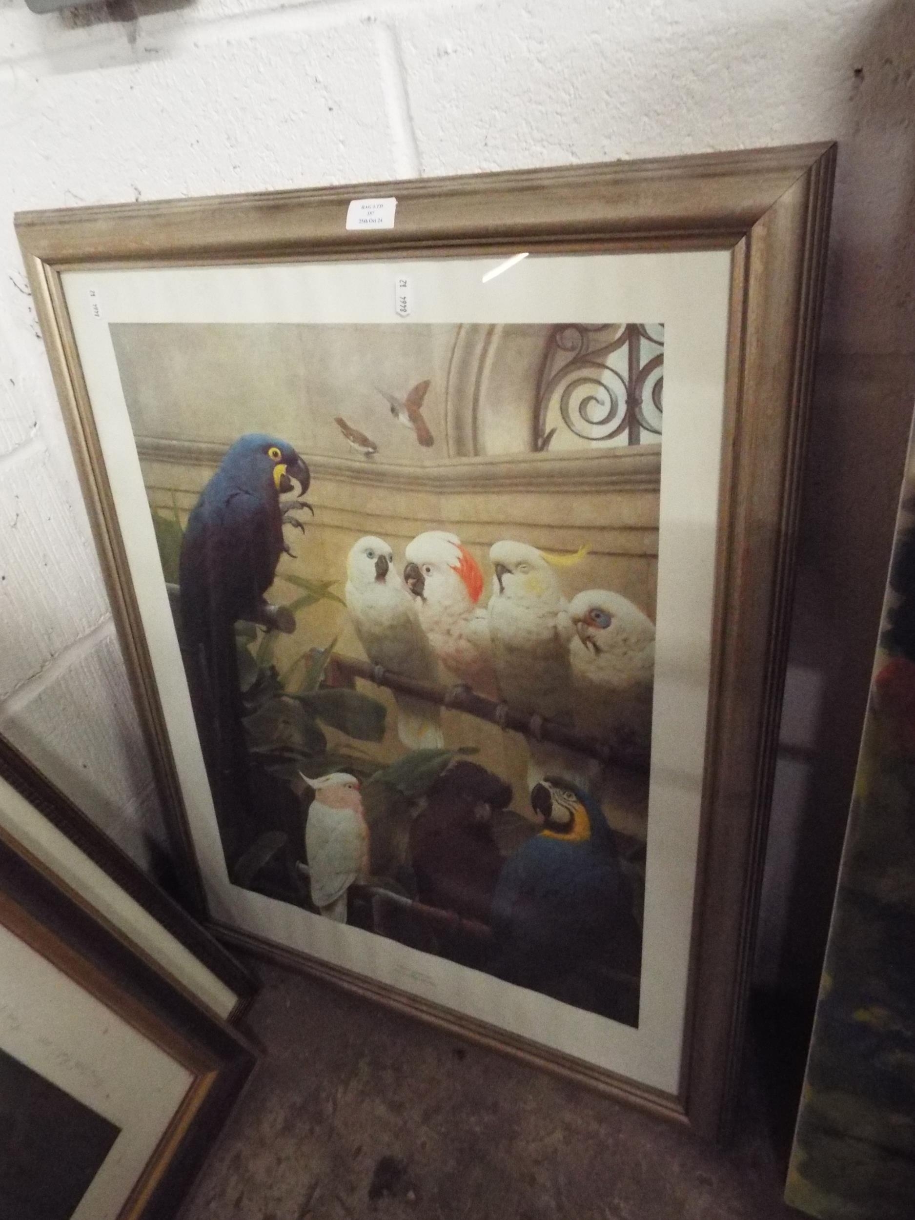 A framed print of Parrots 'A Select Committee'