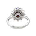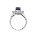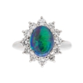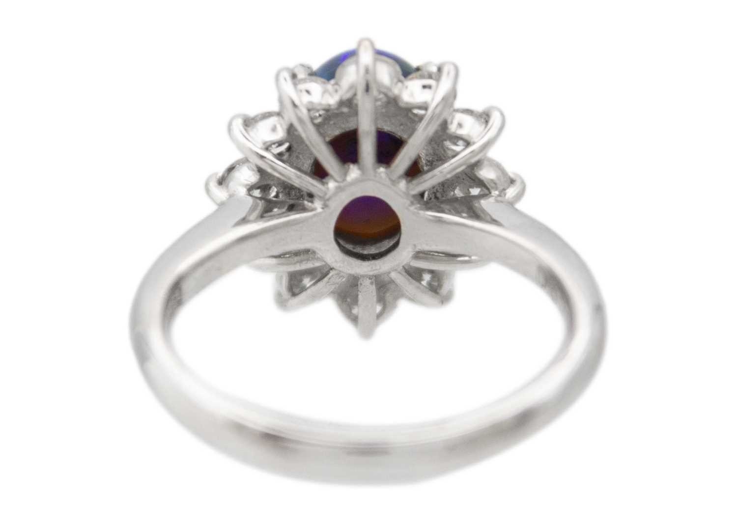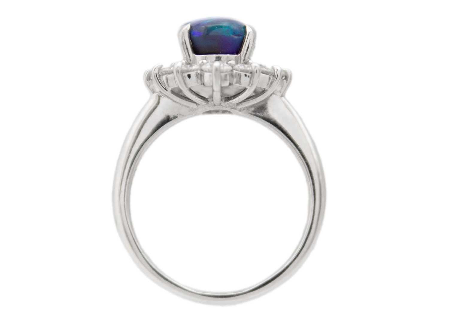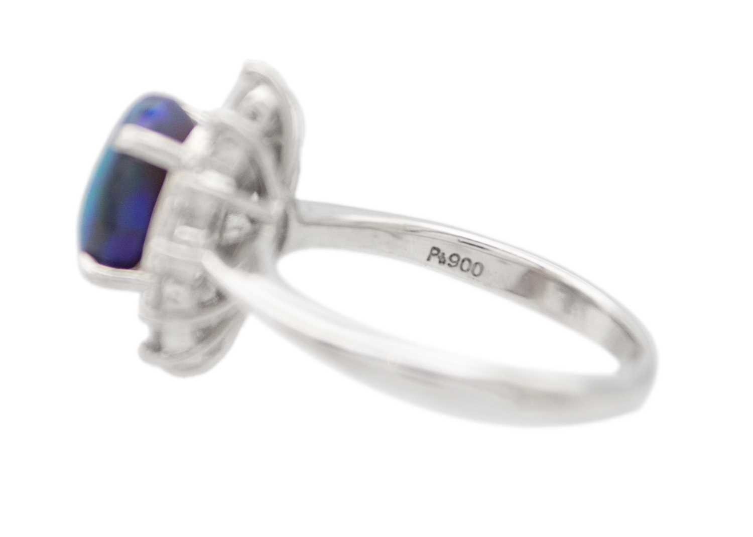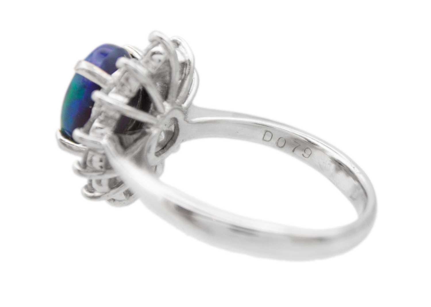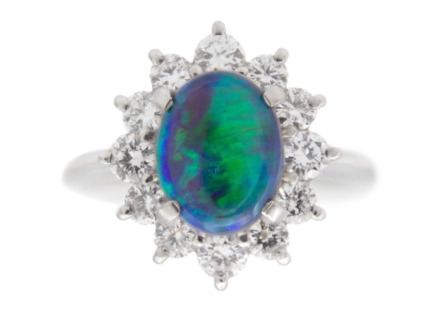 A good black opal diamond ring, set in platinum. The oval-shaped cabochon opal is 9 x 7mm and depth 4.8mm, predominantly green with electric blue flashes, surrounded by twelve brilliant cut diamonds including four slightly larger diamond points, 0.79ct total in weight, all of white colour and clear, evenly matched, stamped Pt900 and D 0.79.