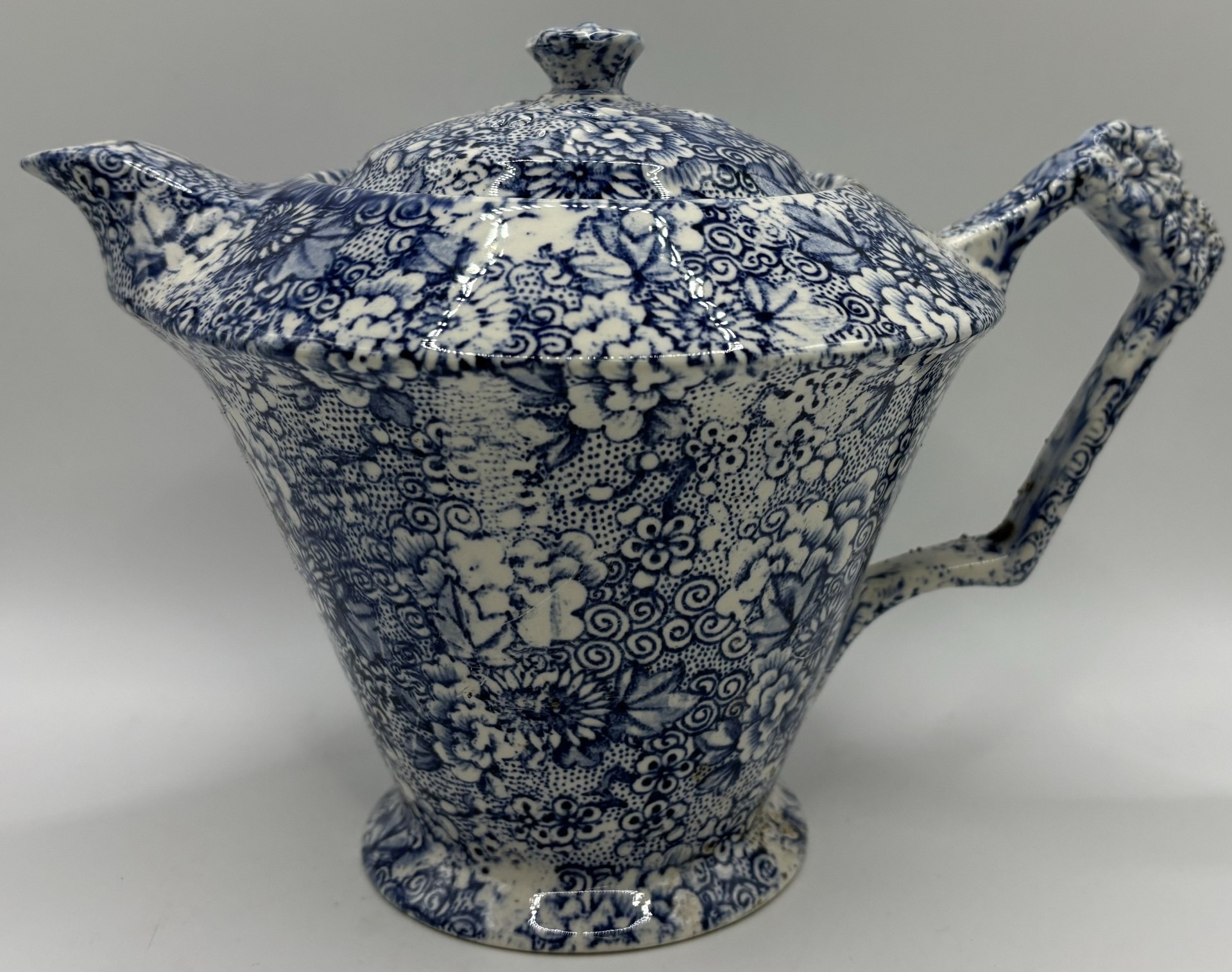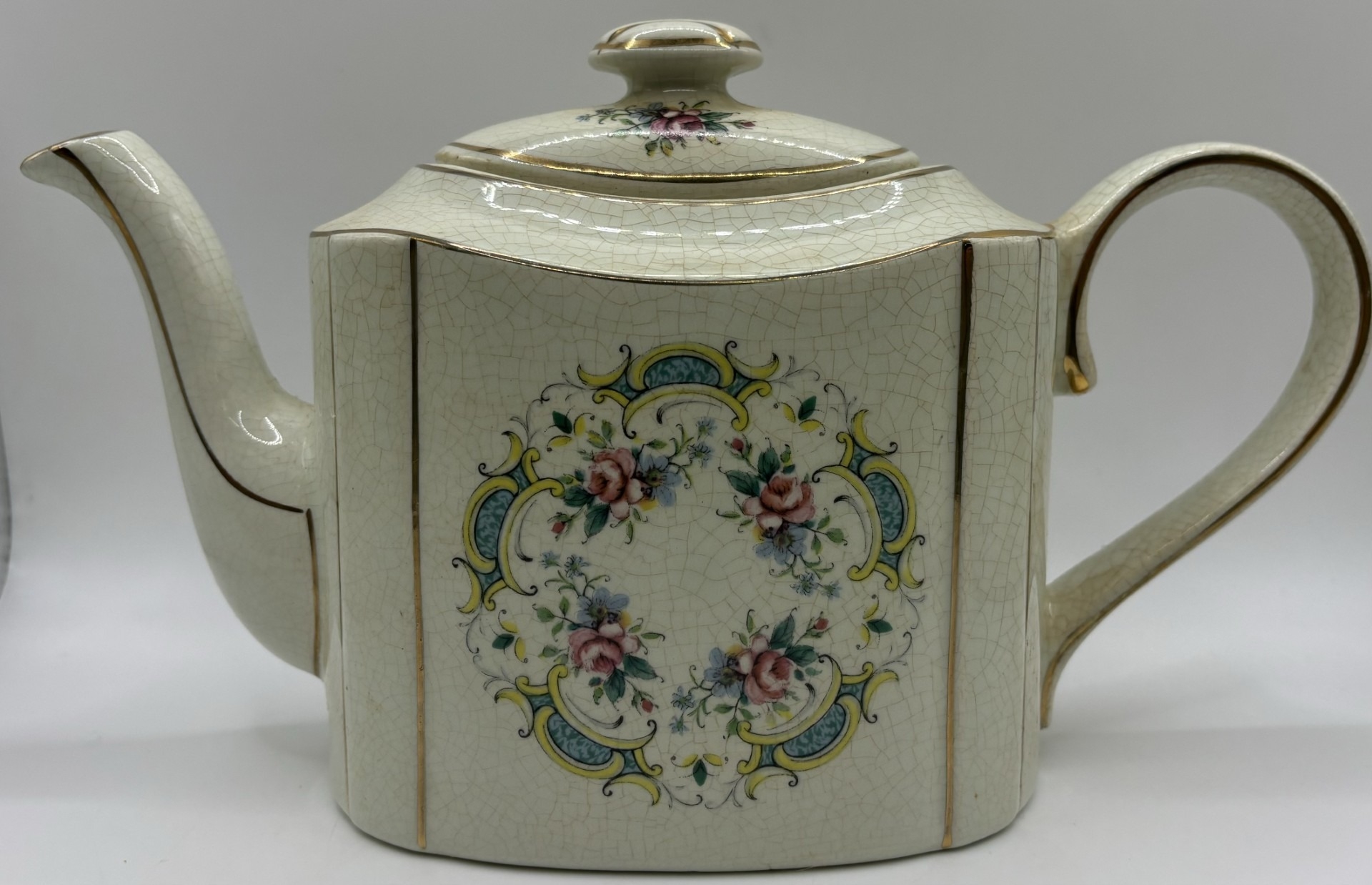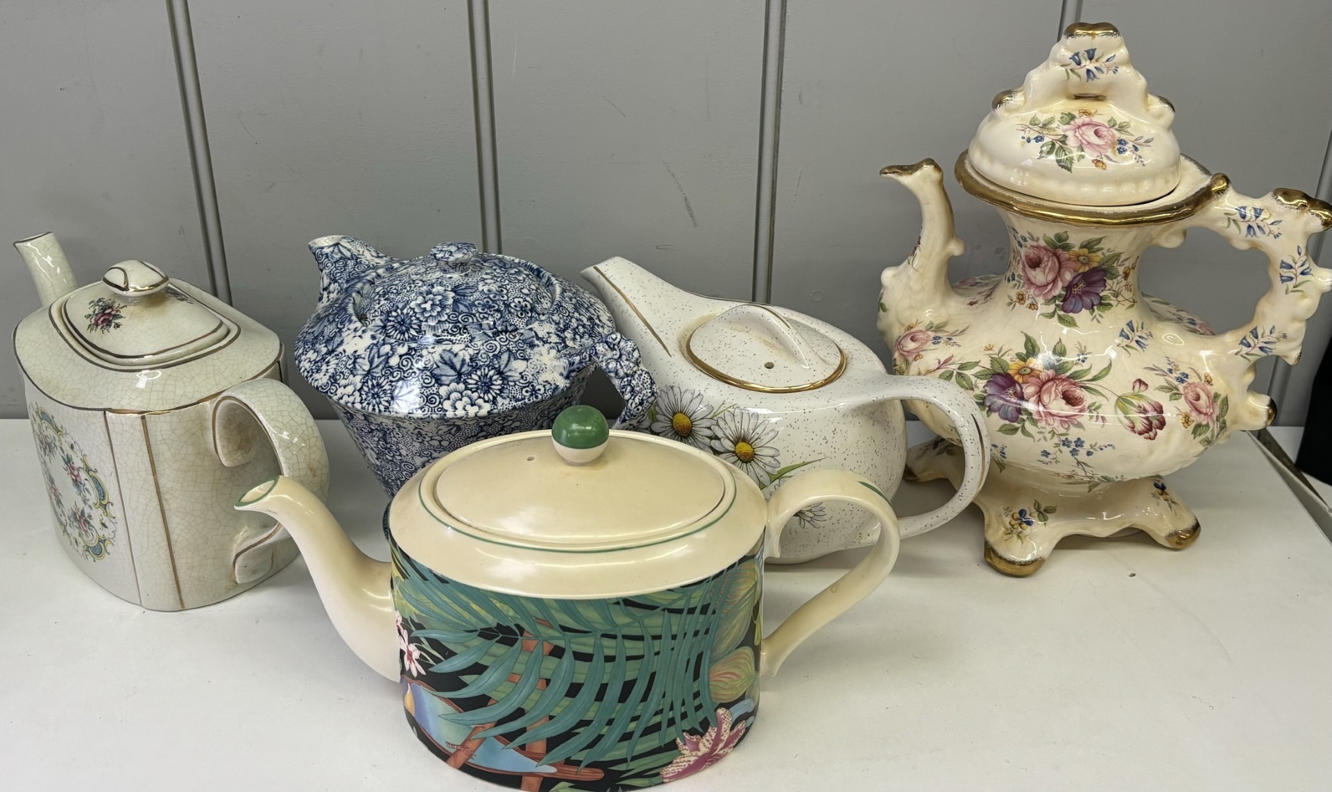 Collection of 5 vintage teapots. Makers include James Kent Old Foley, Arthur Wood, Astbury & Kernewek. Tallest 28cm.