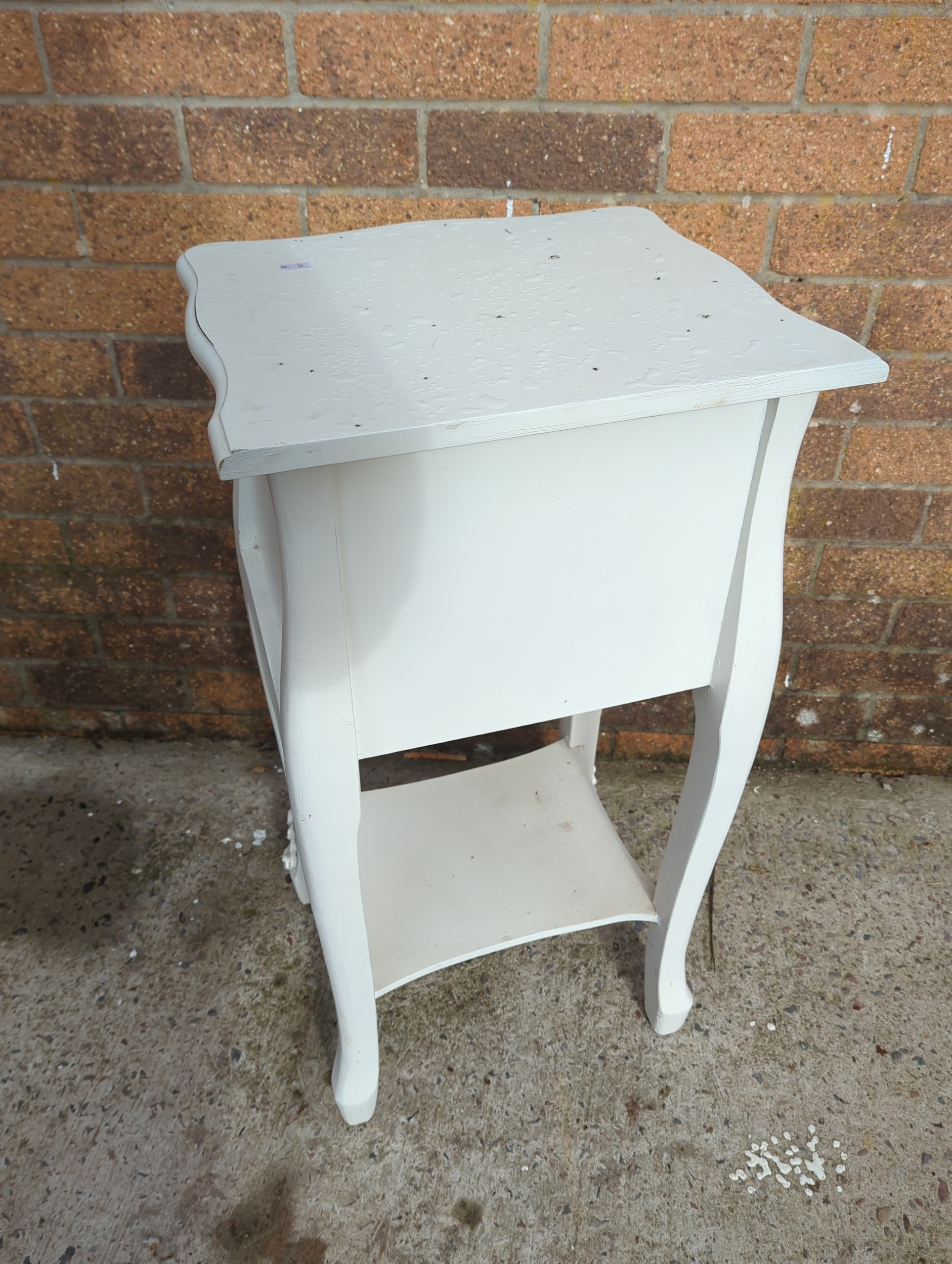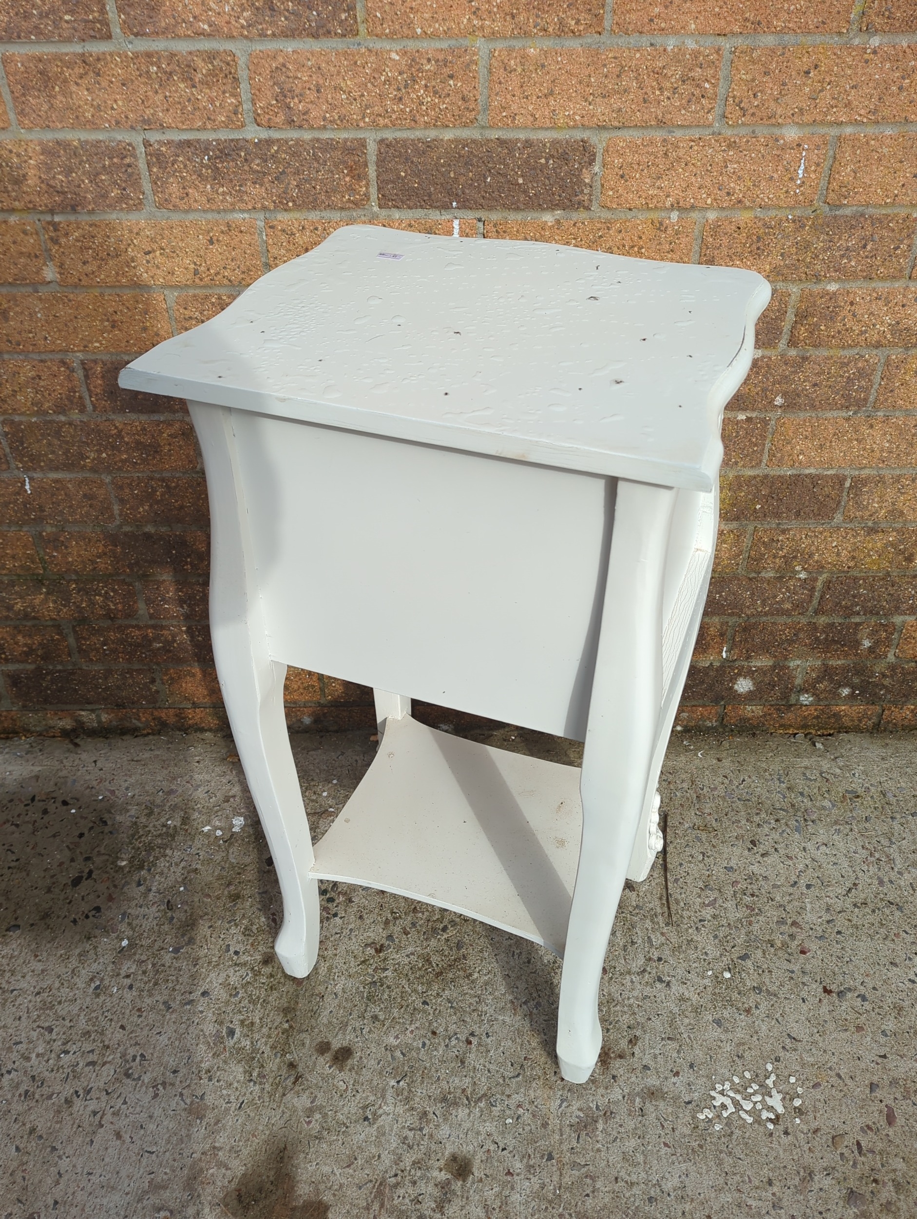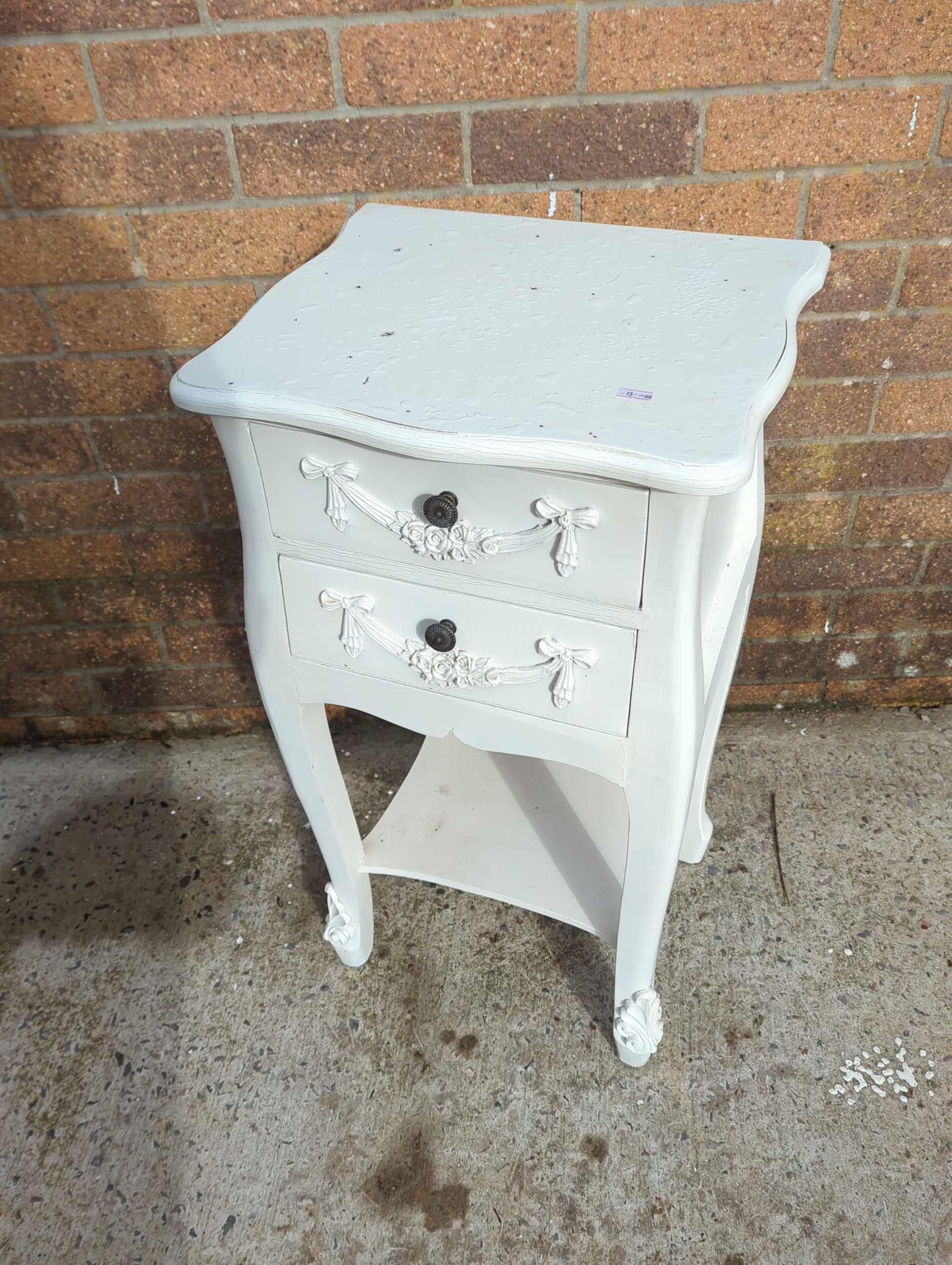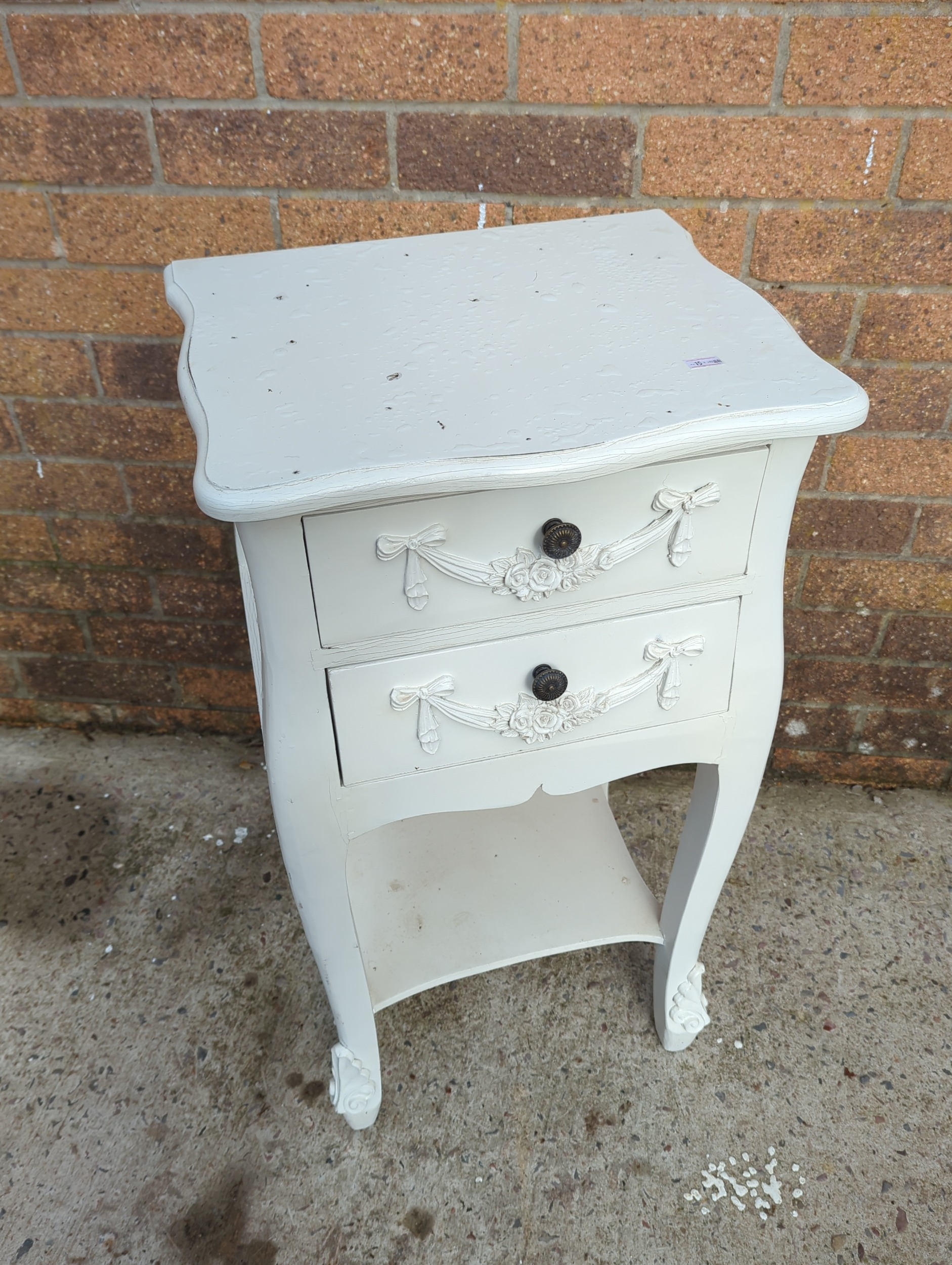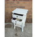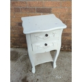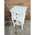 This painted side table features two drawers with decorative floral and ribbon motifs. The piece is painted in a white finish and includes traditional-style embellishments on the legs and drawers. It is compact and suitable for various interior spaces, adding a touch of classic charm.