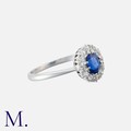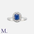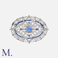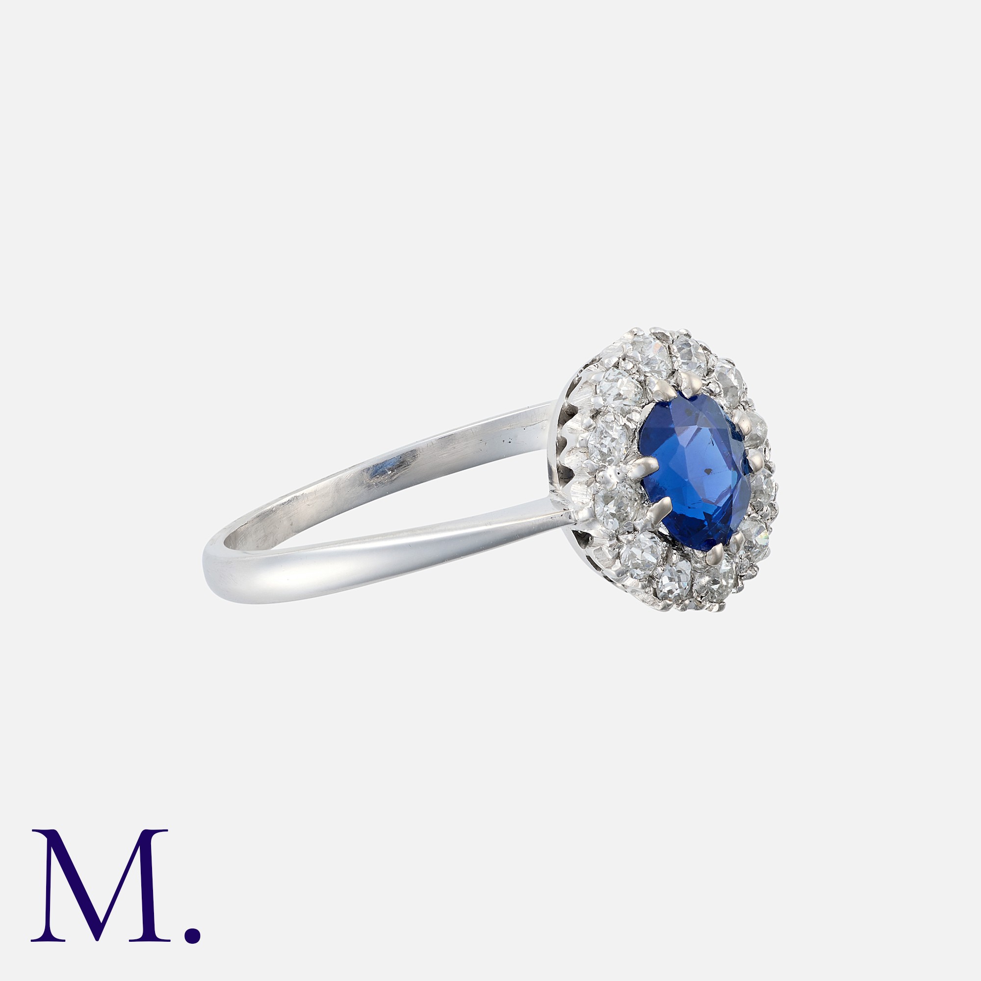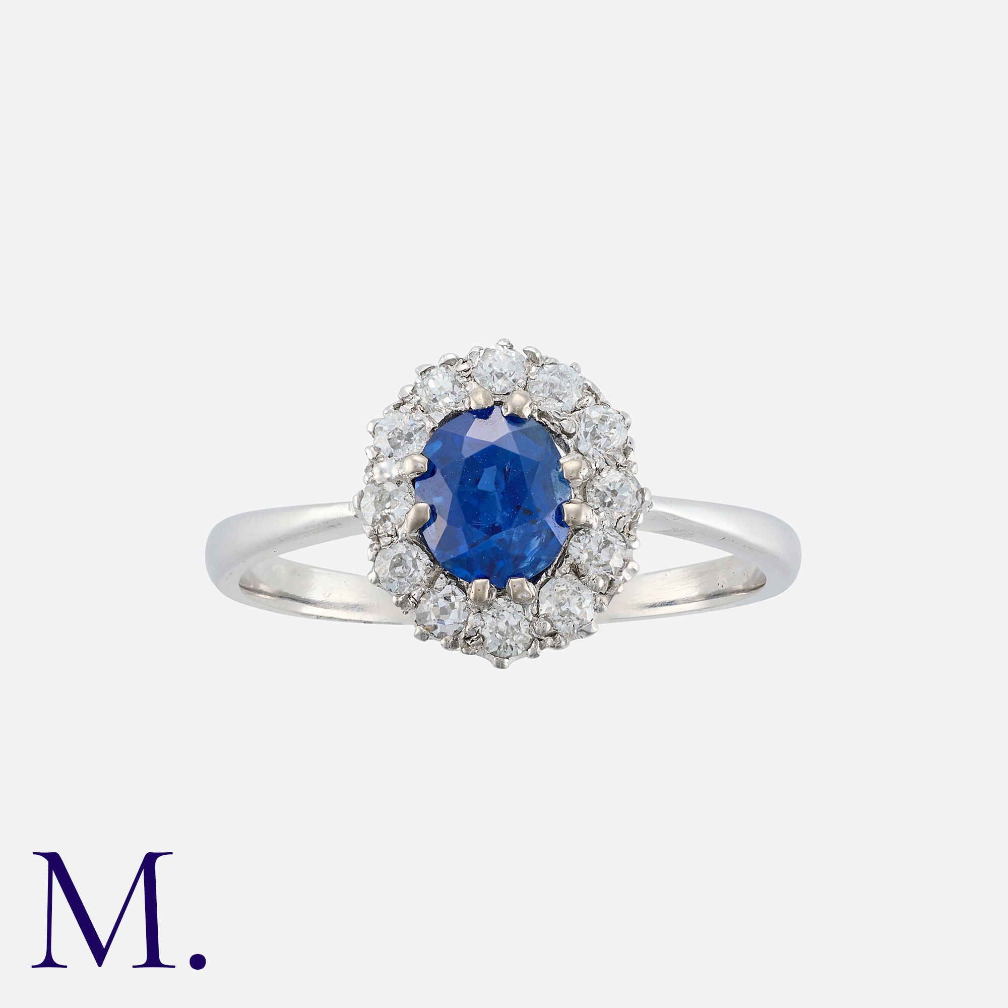A Sapphire and Diamond Cluster Ring in platinum, comprising a cushion cut sapphire of approximately 1.00 carats, within a border of old cut diamonds. Unmarked, tests indicate platinum.
