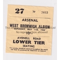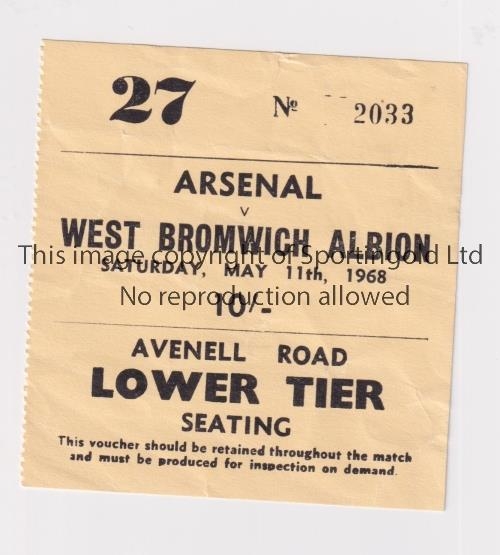 ARSENAL Ticket for the home League match v West Bromwich Albion 11/5/1968. Generally good