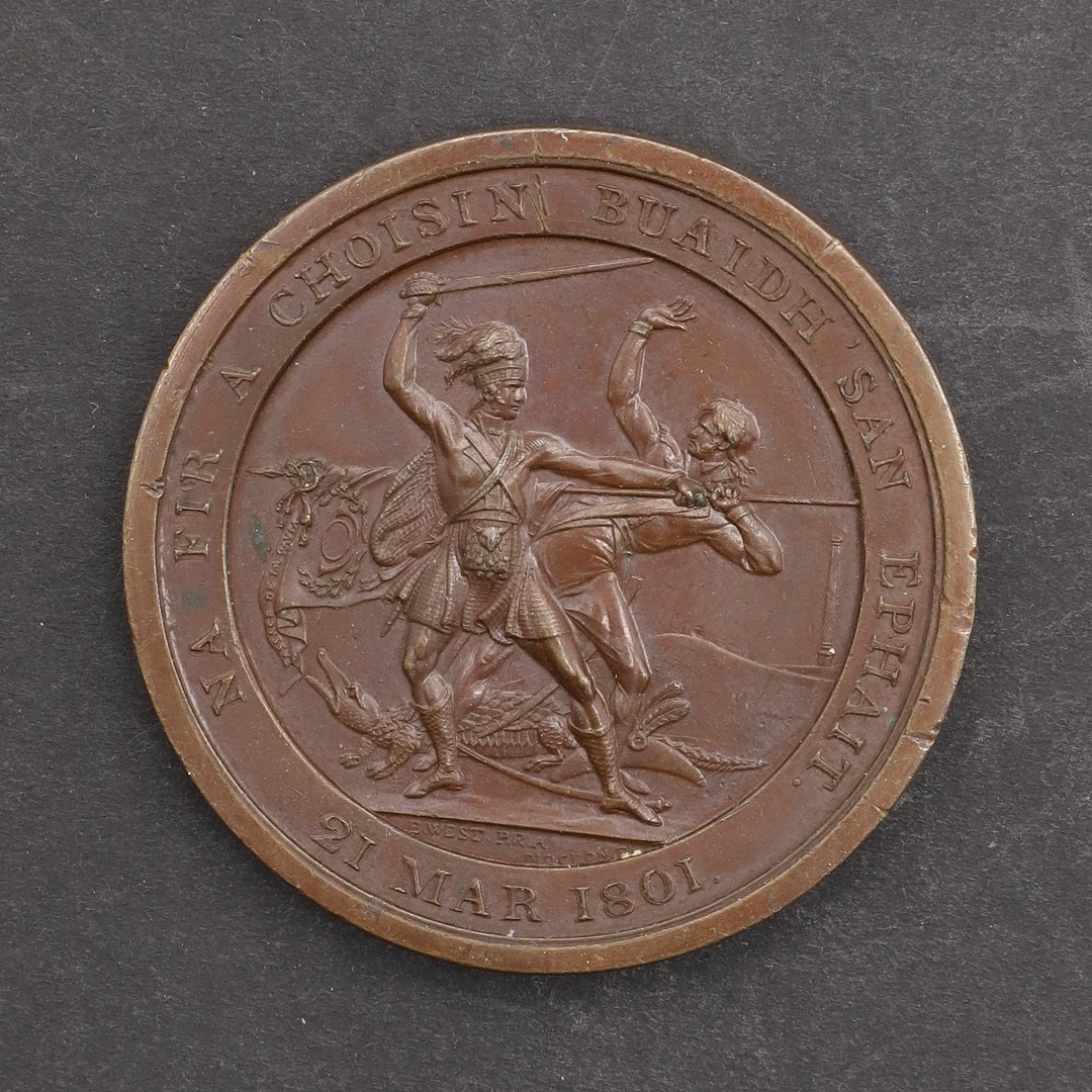 THE HIGHLAND SOCIETY MEDAL FOR EGYPT, 1801. A Highland Society Medal bronze medal, portrait bust of General Sir Ralph Abercromby, dated 28th March 1801, the reverse with a Highlander in combat, the rim engraved in Gaelic 'Na Fir a choisin Buaidh San Ephait (there are the heroes who achieved victory in Egypt'. 4.8 cm. The design by Pidgeon.