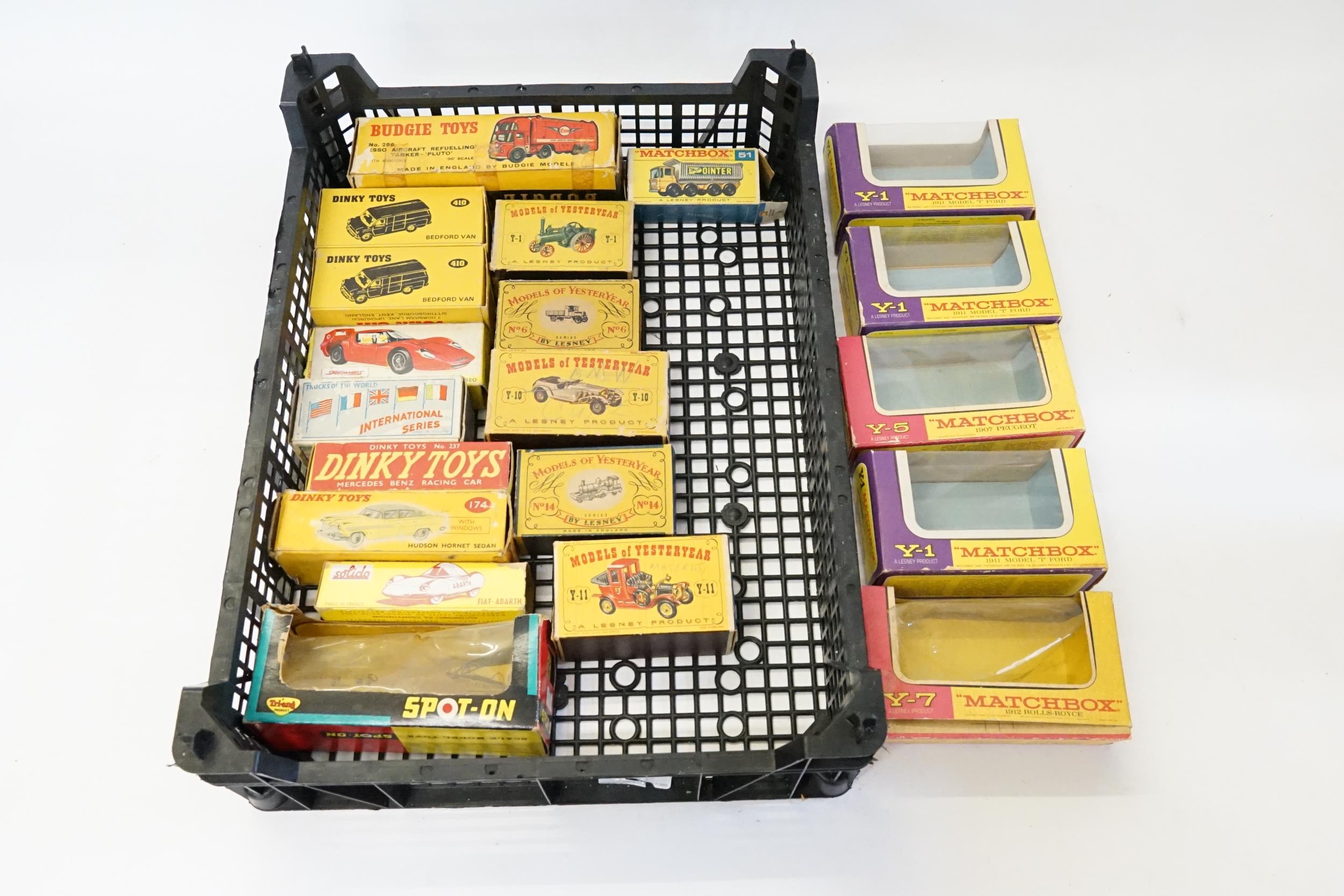 A Collect of Original EMPTY Dinky & Matchbox Boxes to include Dinky No: 174, 237, 217, 2 x 410's, along with a Spot-On No: 279 Box Only, a Budgie Toys Esso Tanker Box Only & various Matchbox models of Yesteryear Boxes. All in Poor to Good Condition.