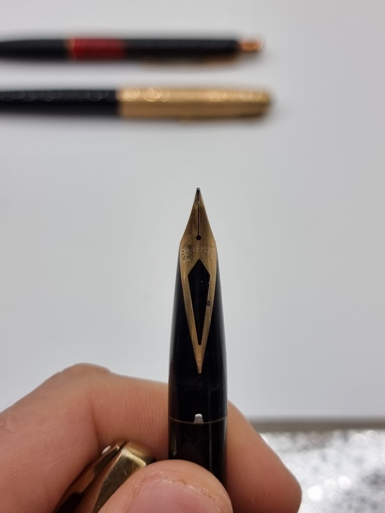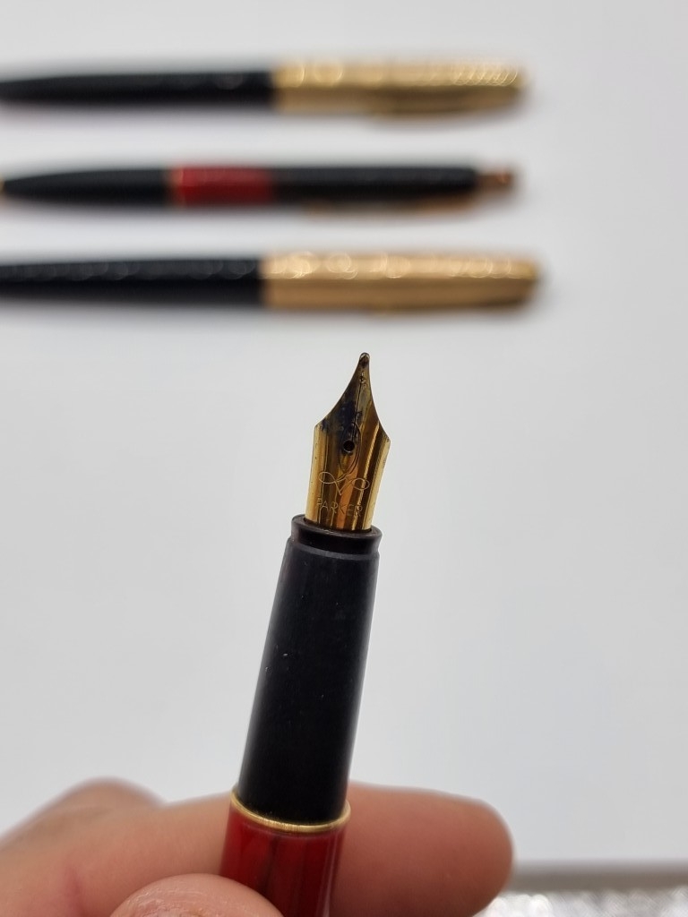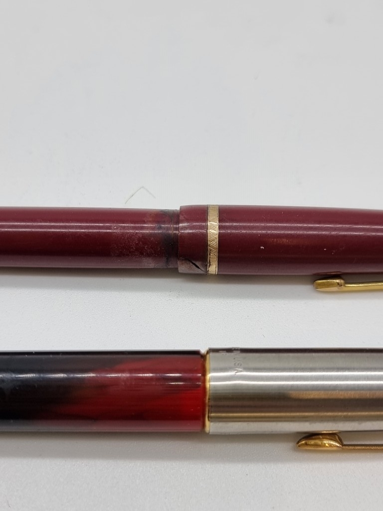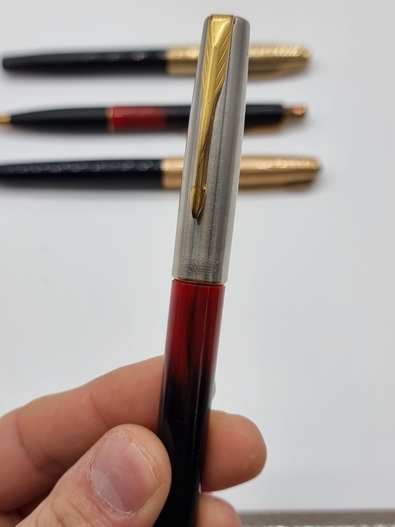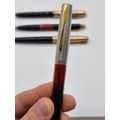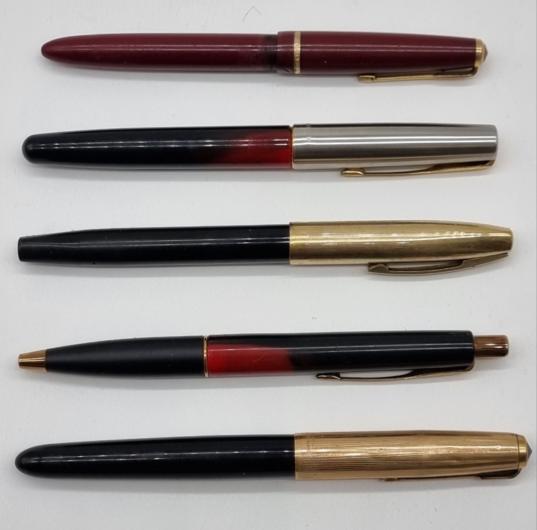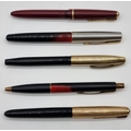 Four Parker pens, to include a 51; and a Frontier; together with a Sheaffer fountain pen. (5)
