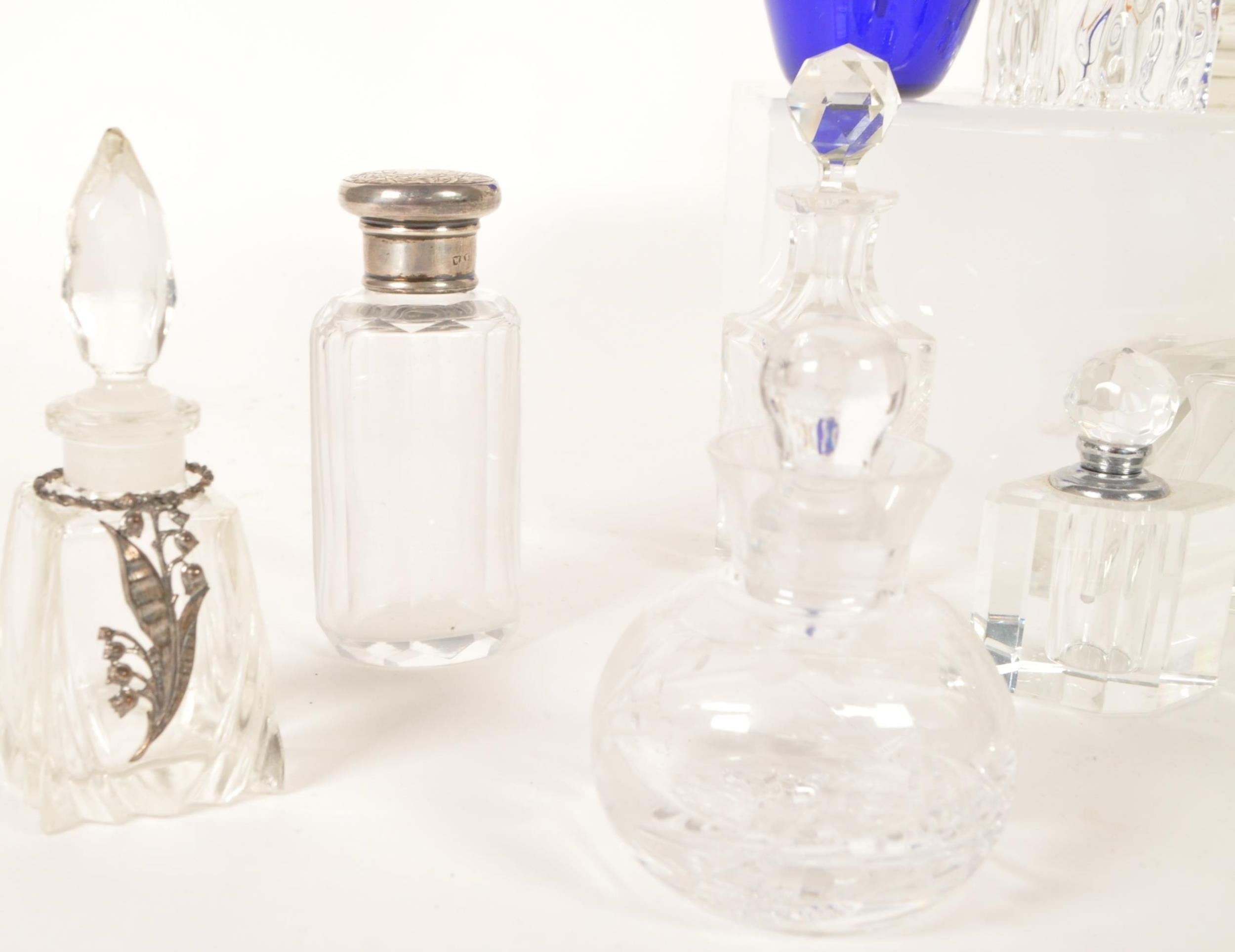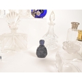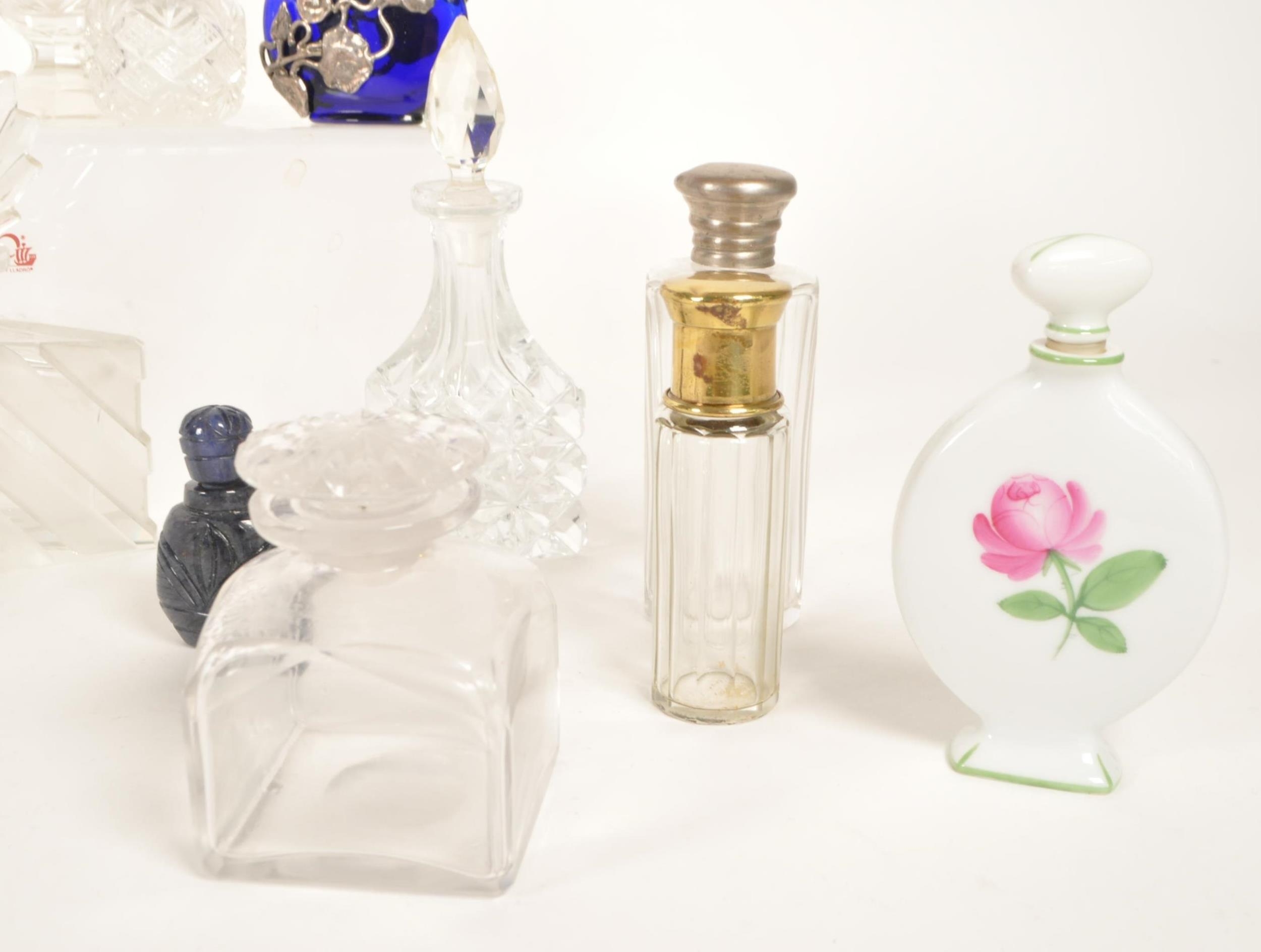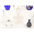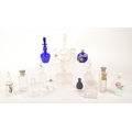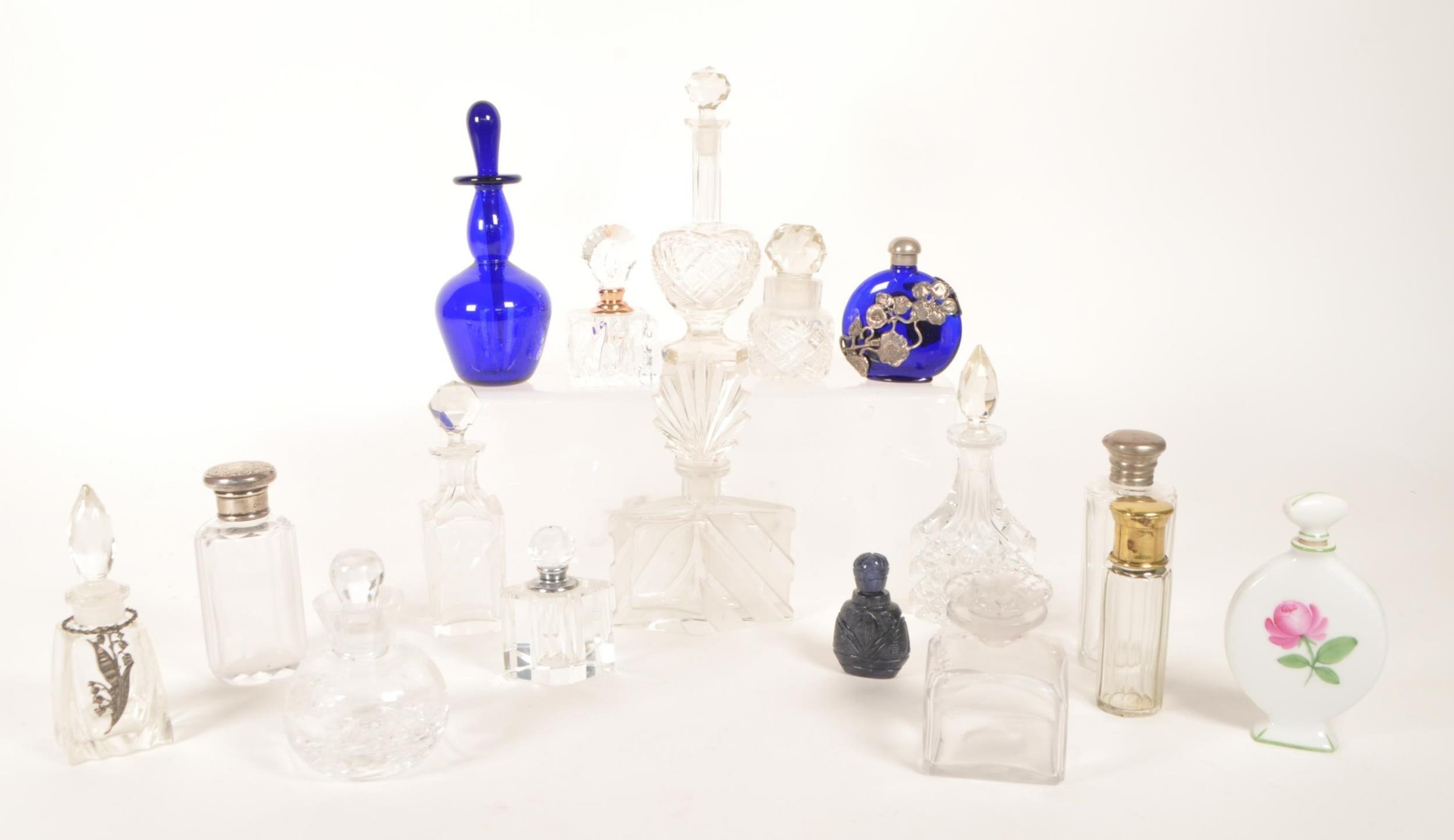 Collection of 19th and 20th century glass perfume bottles. Including crystal cut examples, Bristol blue glass, hallmarked silver topped bottle, an Augarten porcelain Vienna bottle, and more. Most with their stoppers. Largest measuring approx. 13cm tall.
