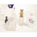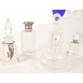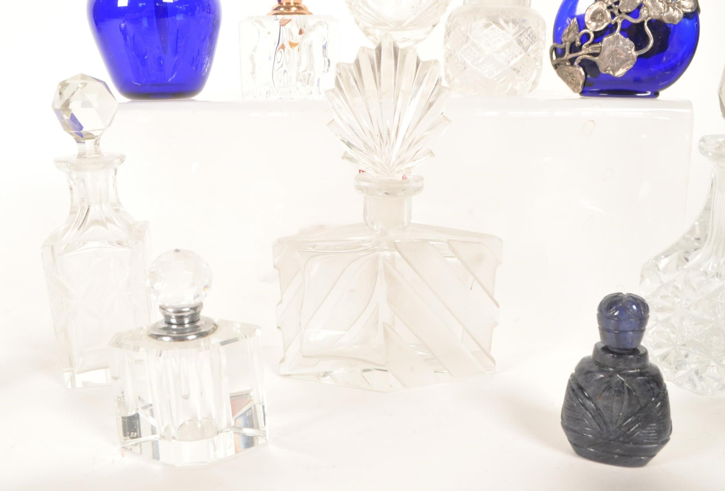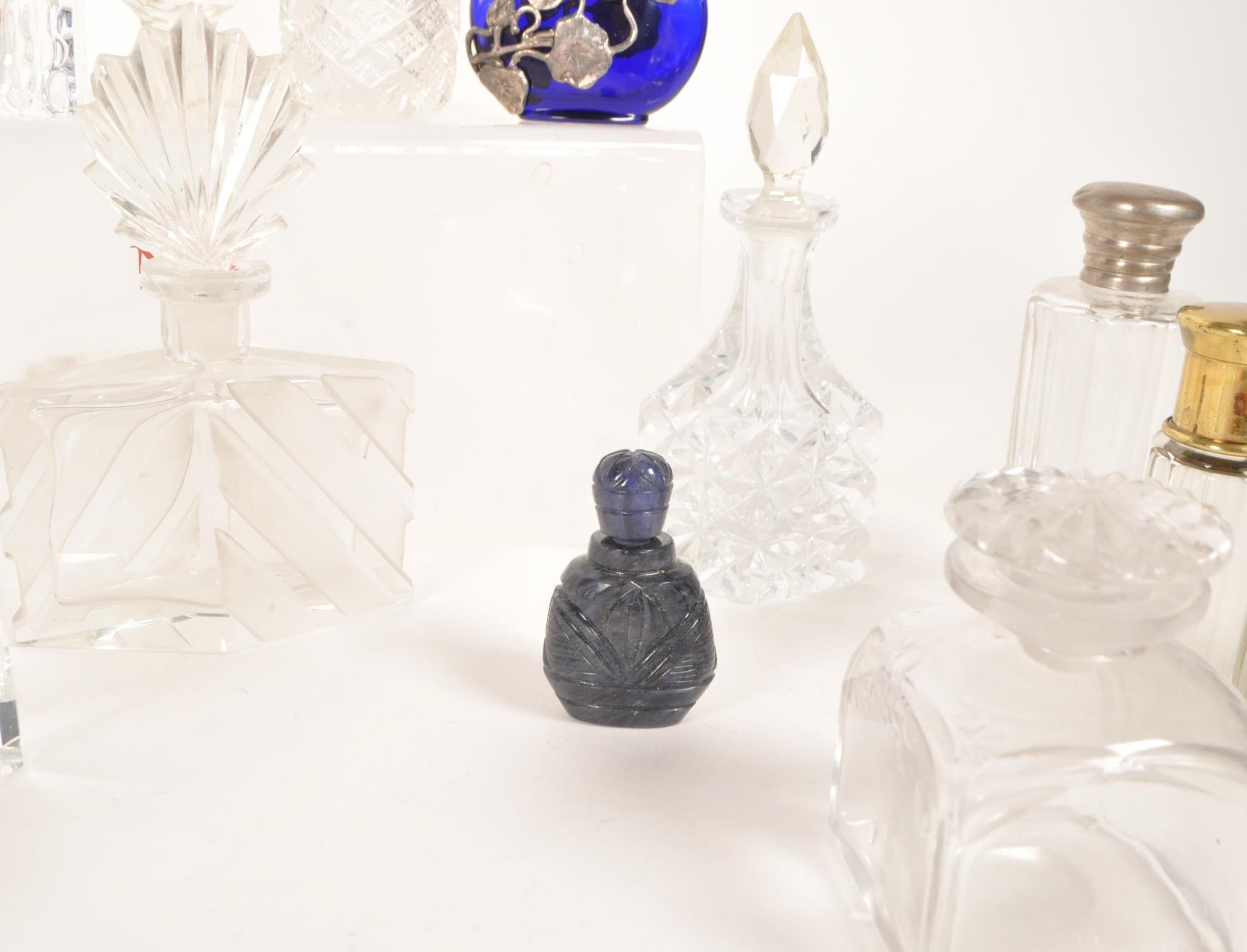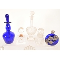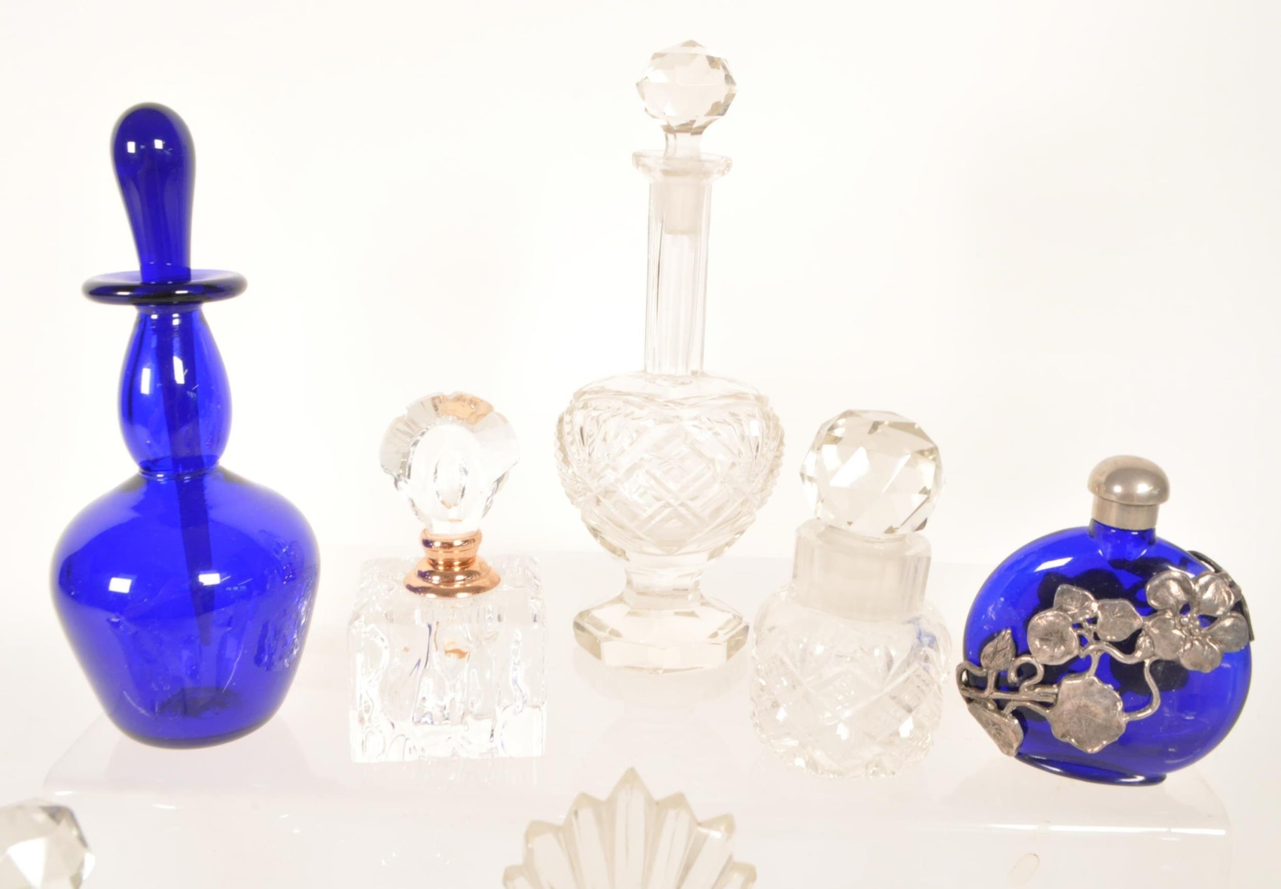 Collection of 19th and 20th century glass perfume bottles. Including crystal cut examples, Bristol blue glass, hallmarked silver topped bottle, an Augarten porcelain Vienna bottle, and more. Most with their stoppers. Largest measuring approx. 13cm tall.