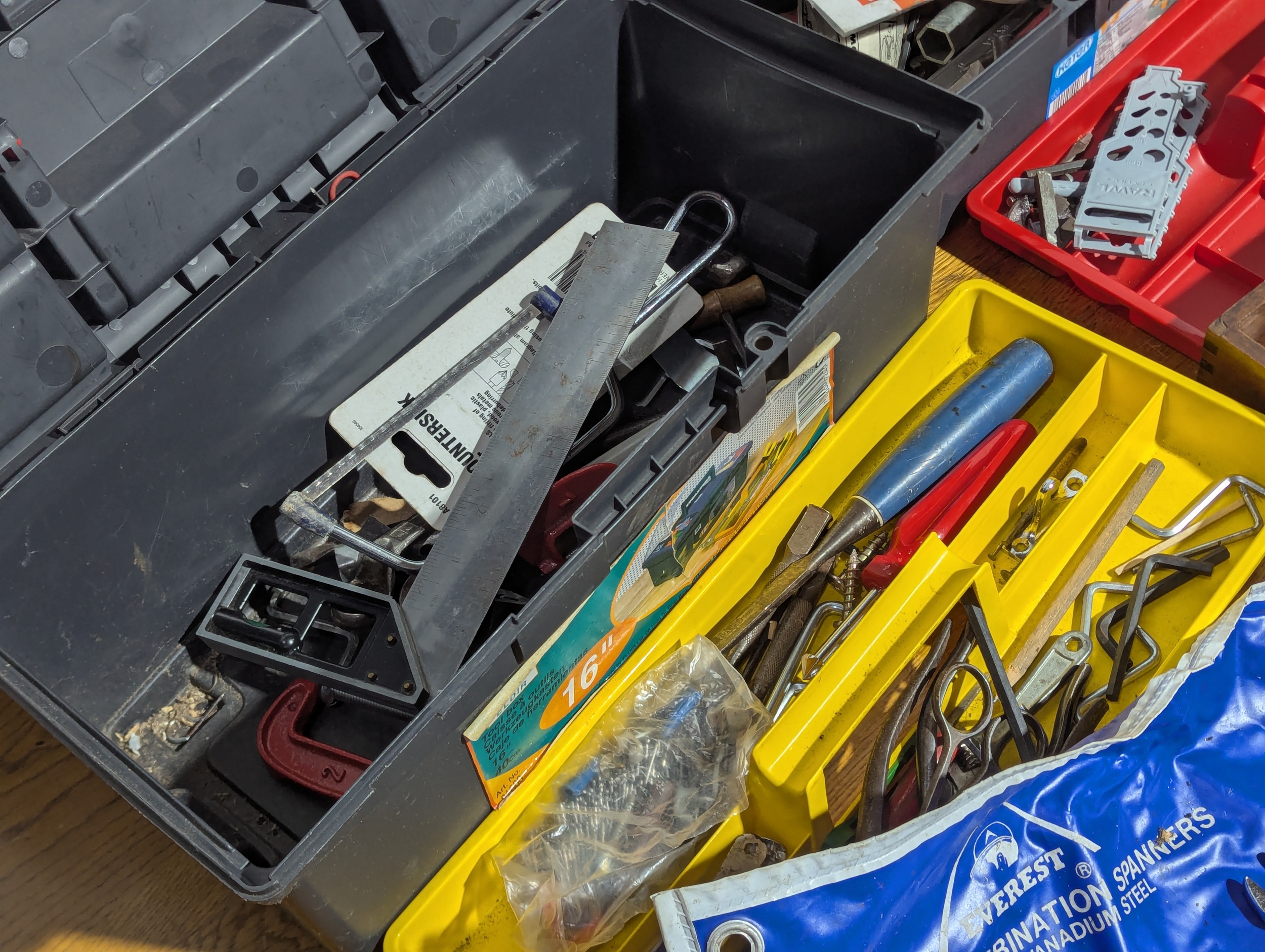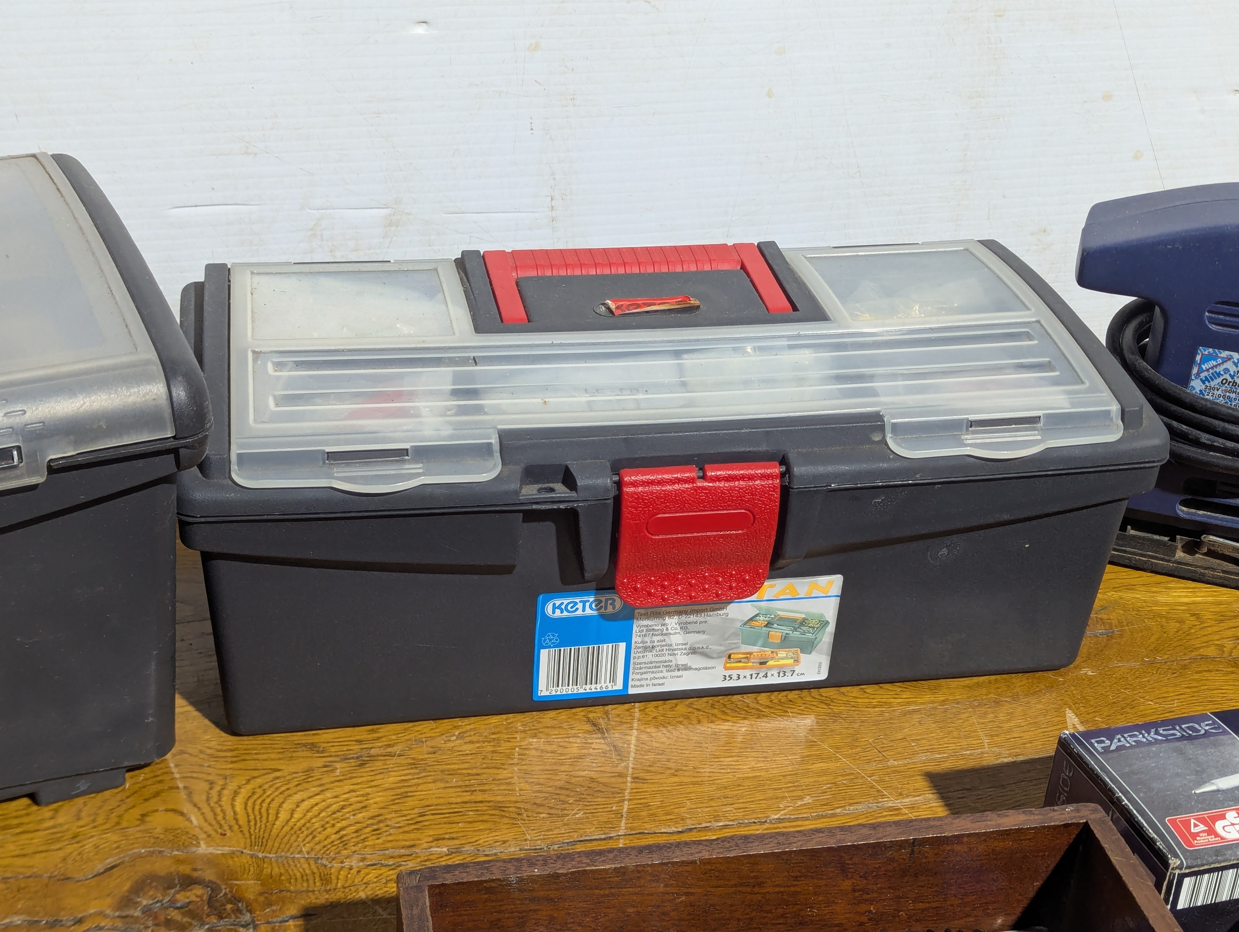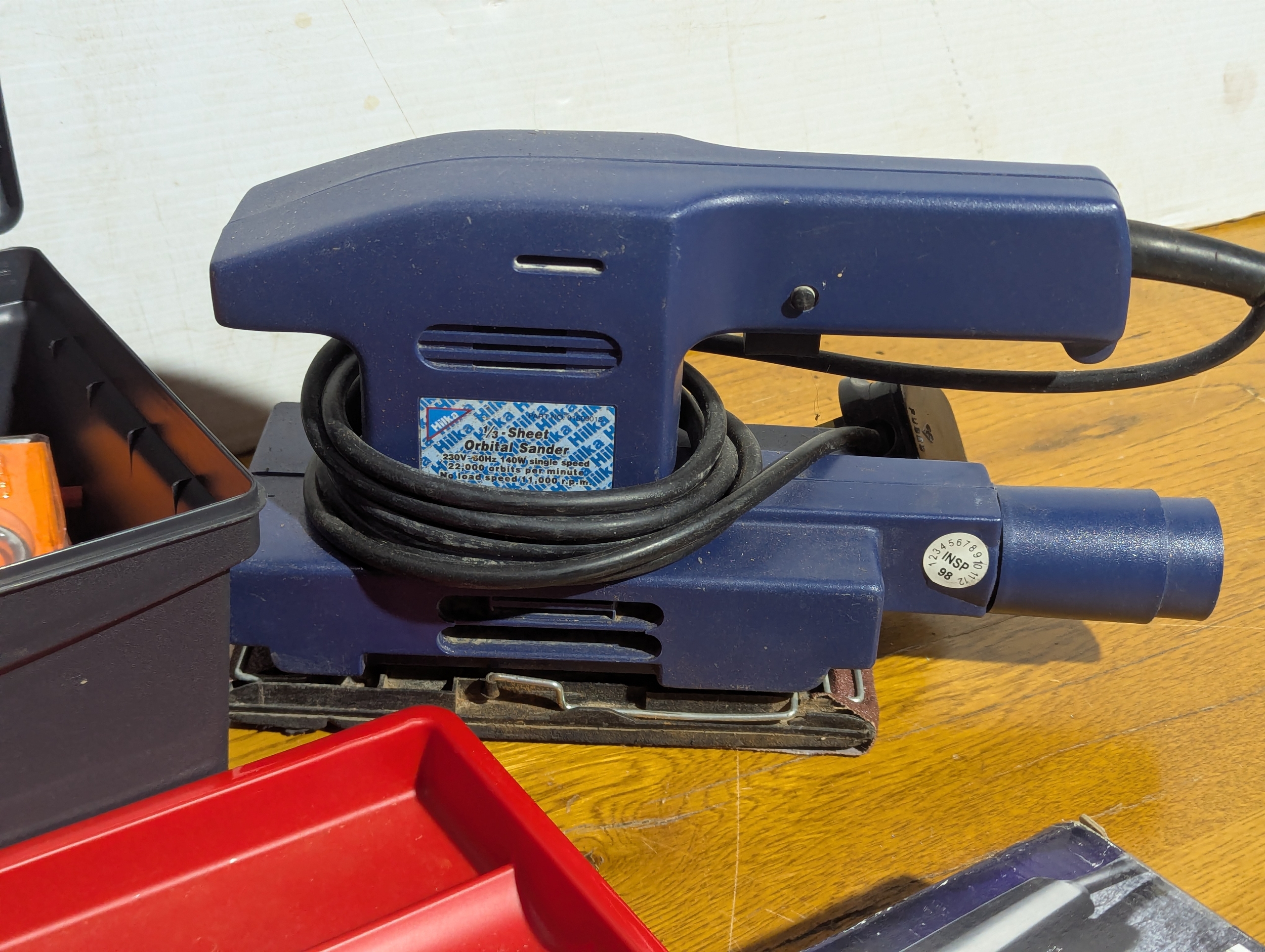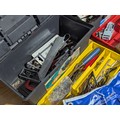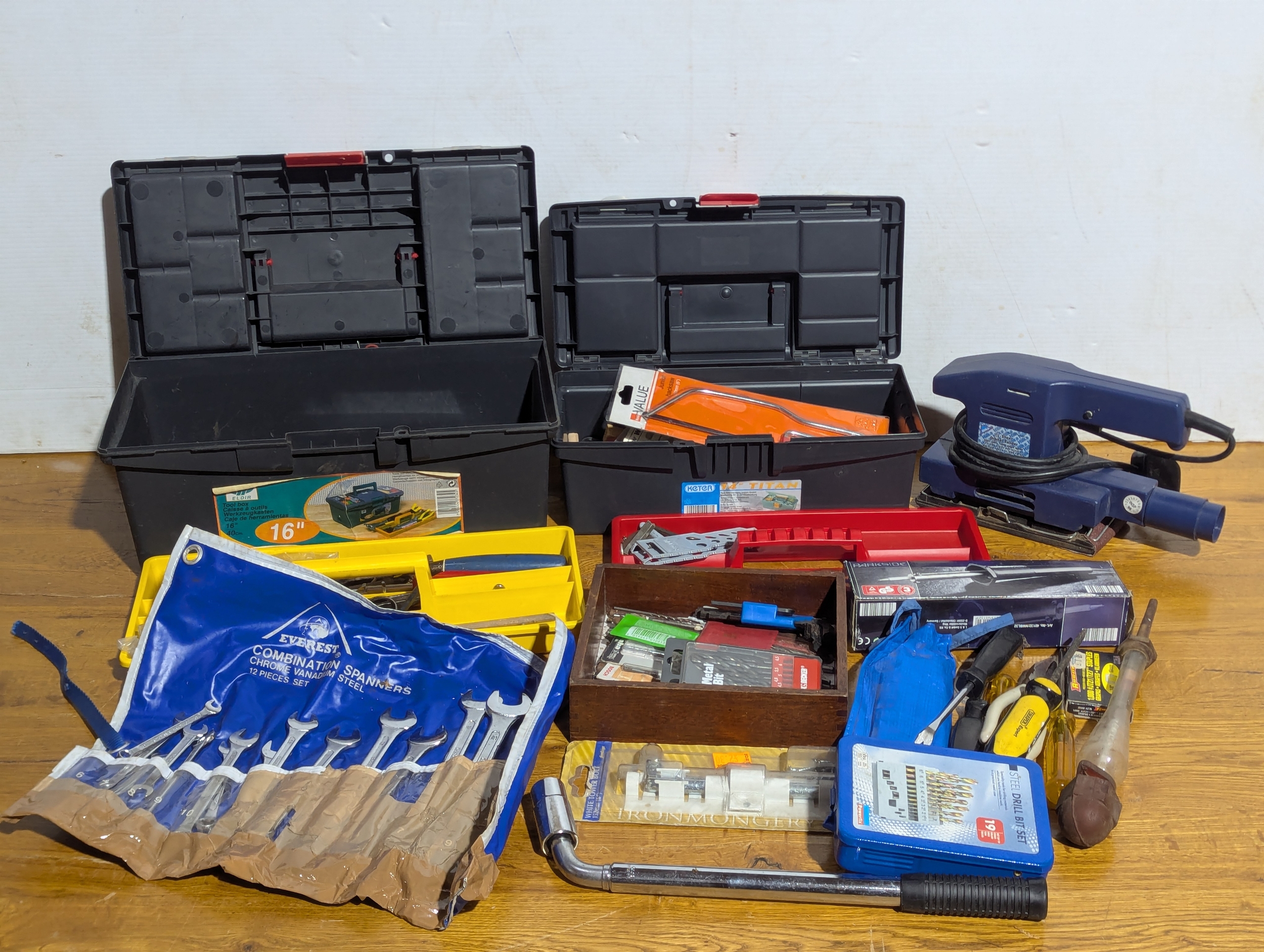 Quantity of tools including 2 tool boxes, electric sander, Everest spanners set, drill bits etc