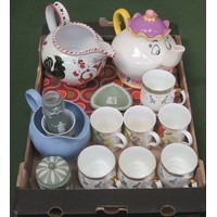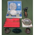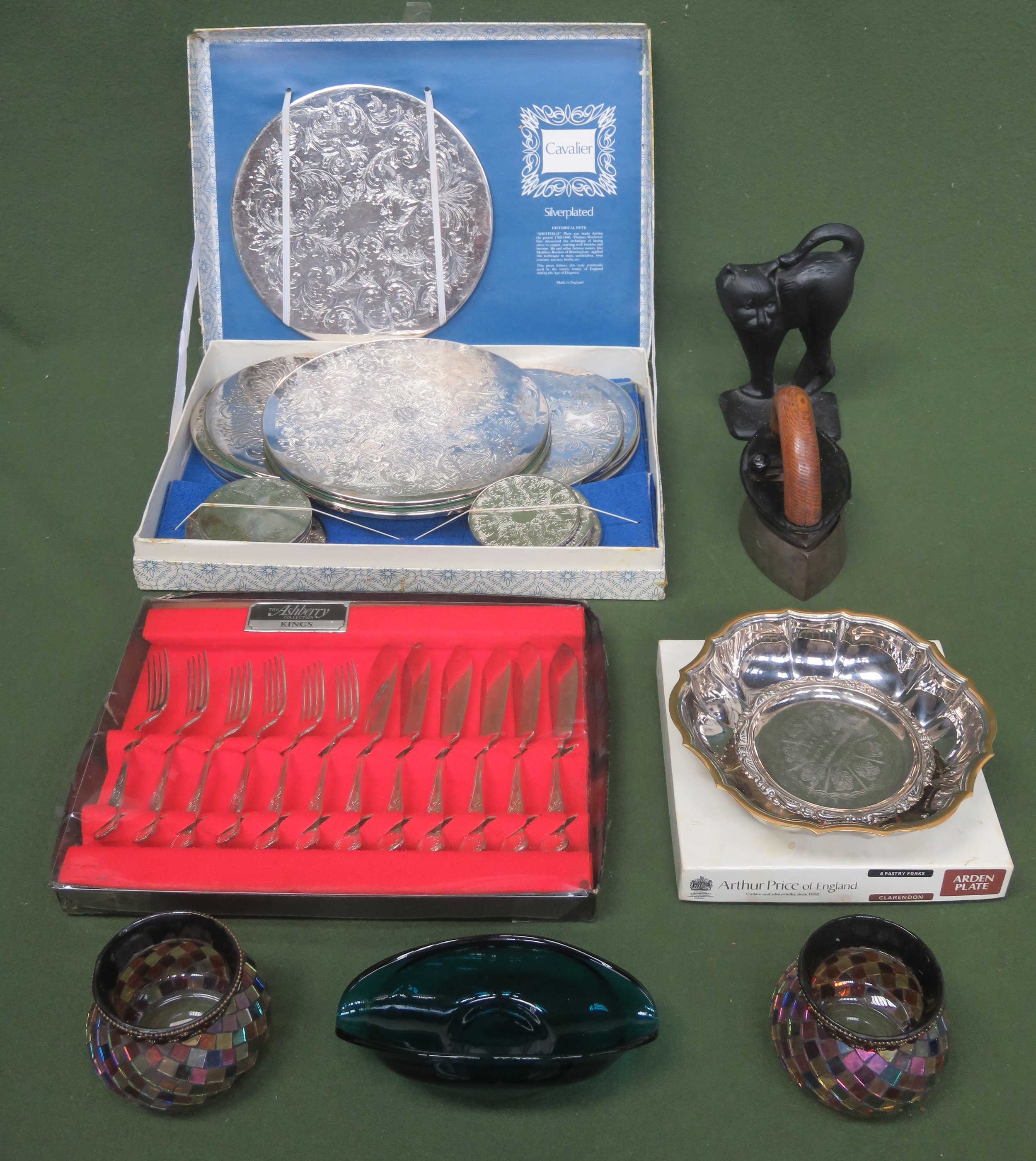 Mixed lot including platedvware, flatware, coloured glass, plus travel iron etc