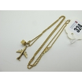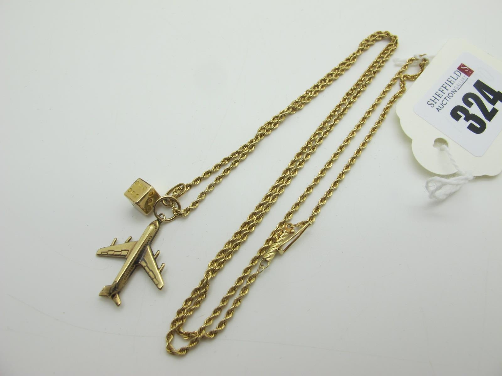 A Fine Ropetwist Chain, stamped "14k", 62cm long (5 grams), suspending a 9ct gold aeroplane charm pendant, and a dice charm pendant stamped "375" (total weight 2grams).