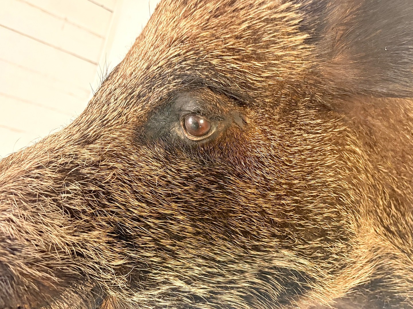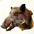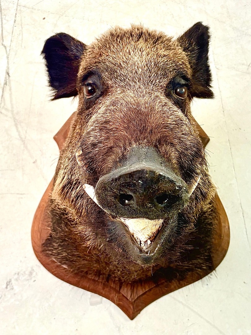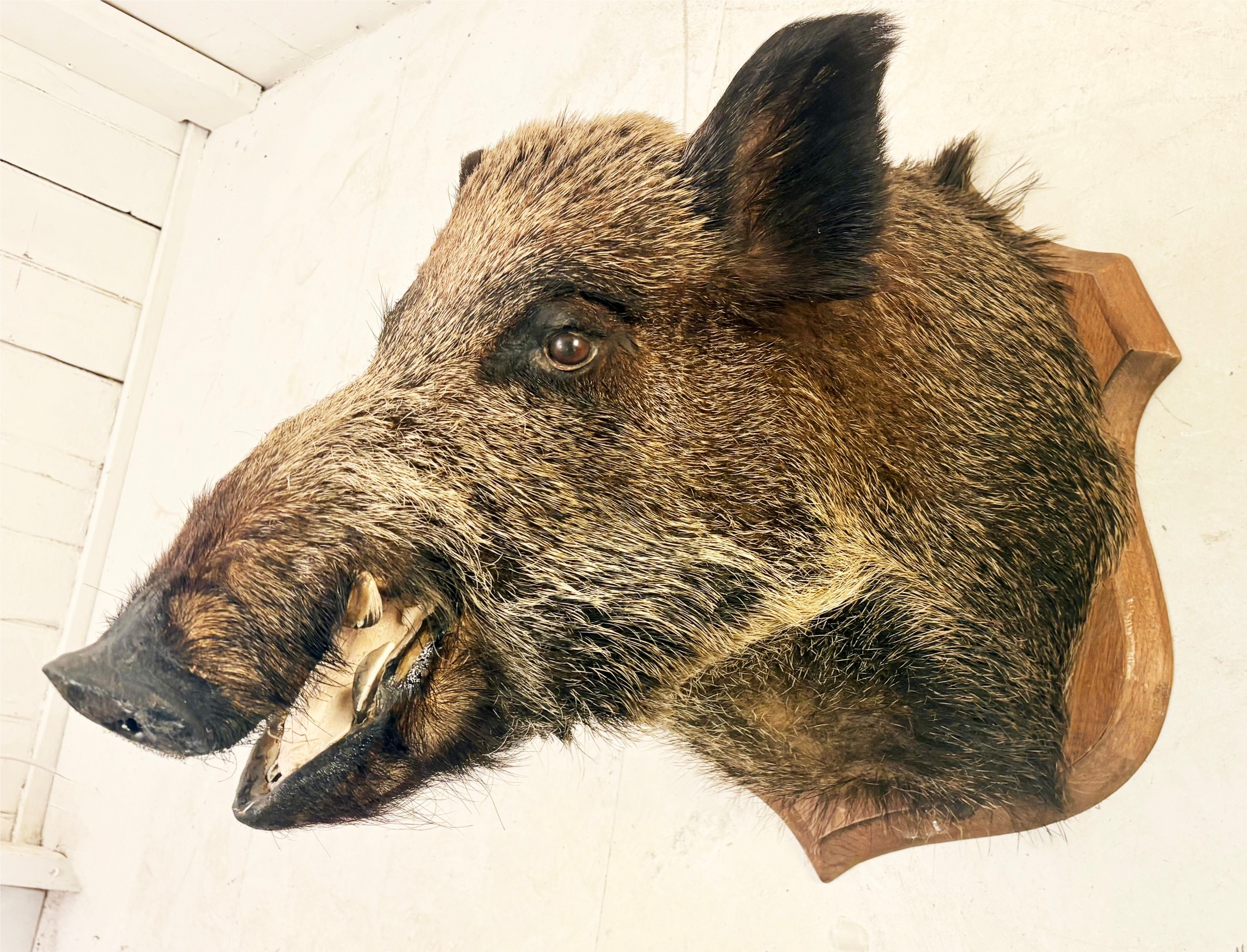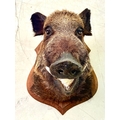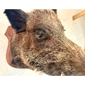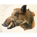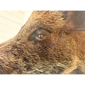 FRENCH BOARS HEAD TROPHY ON A WOODEN SHIELD. 63cm H x 48cm W x 62cm D.