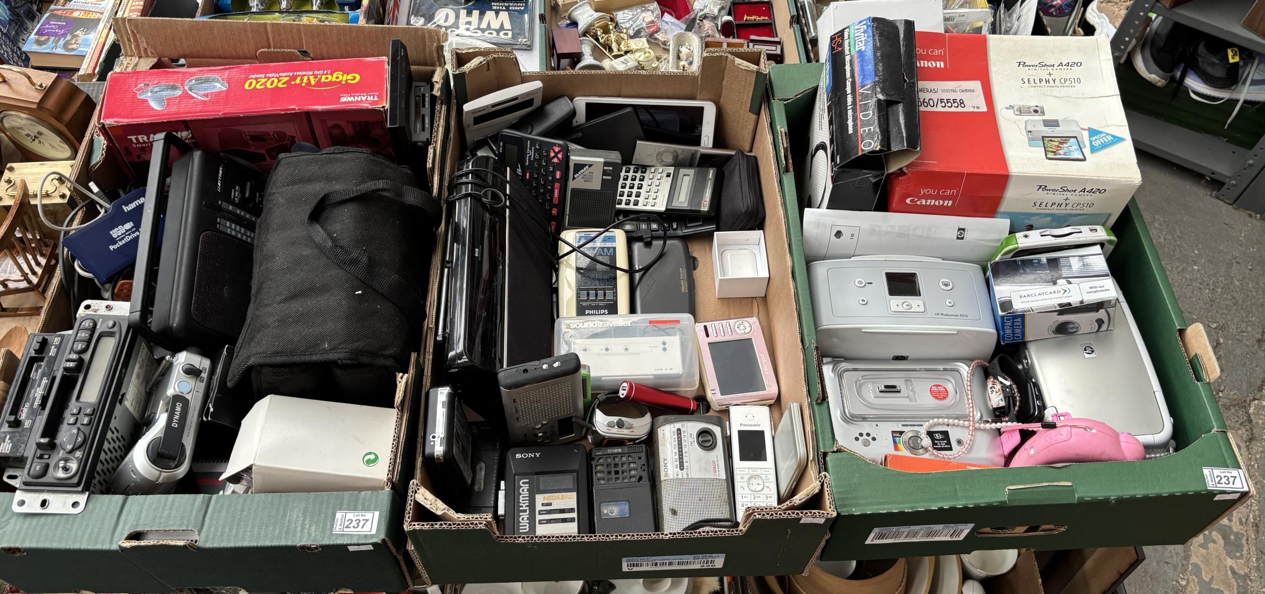 3 Boxes containing assorted electronics including cassette recorders, radios, calculators etc