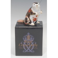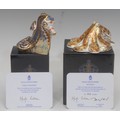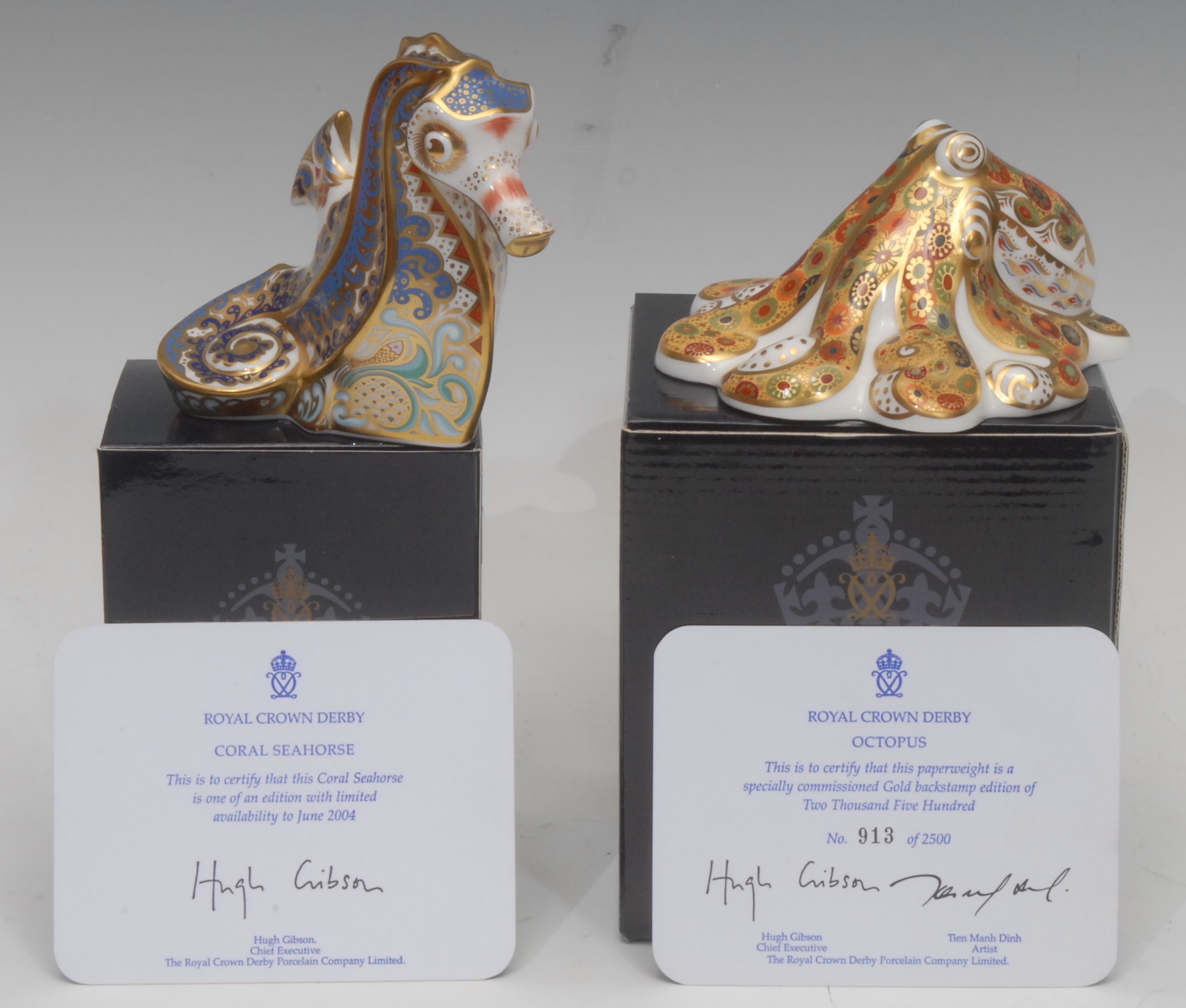A Royal Crown Derby paperweight, Octopus, specially commissioned gold backstamp, designed by Tien Manh Dinh, limited edition 913/2,500, gold stopper, 12cm long, printed mark in gold, certificate, boxed; another, Coral Seahorse, limited to June 2004, gold stopper, 10cm, printed mark in red, certificate, boxed (2)