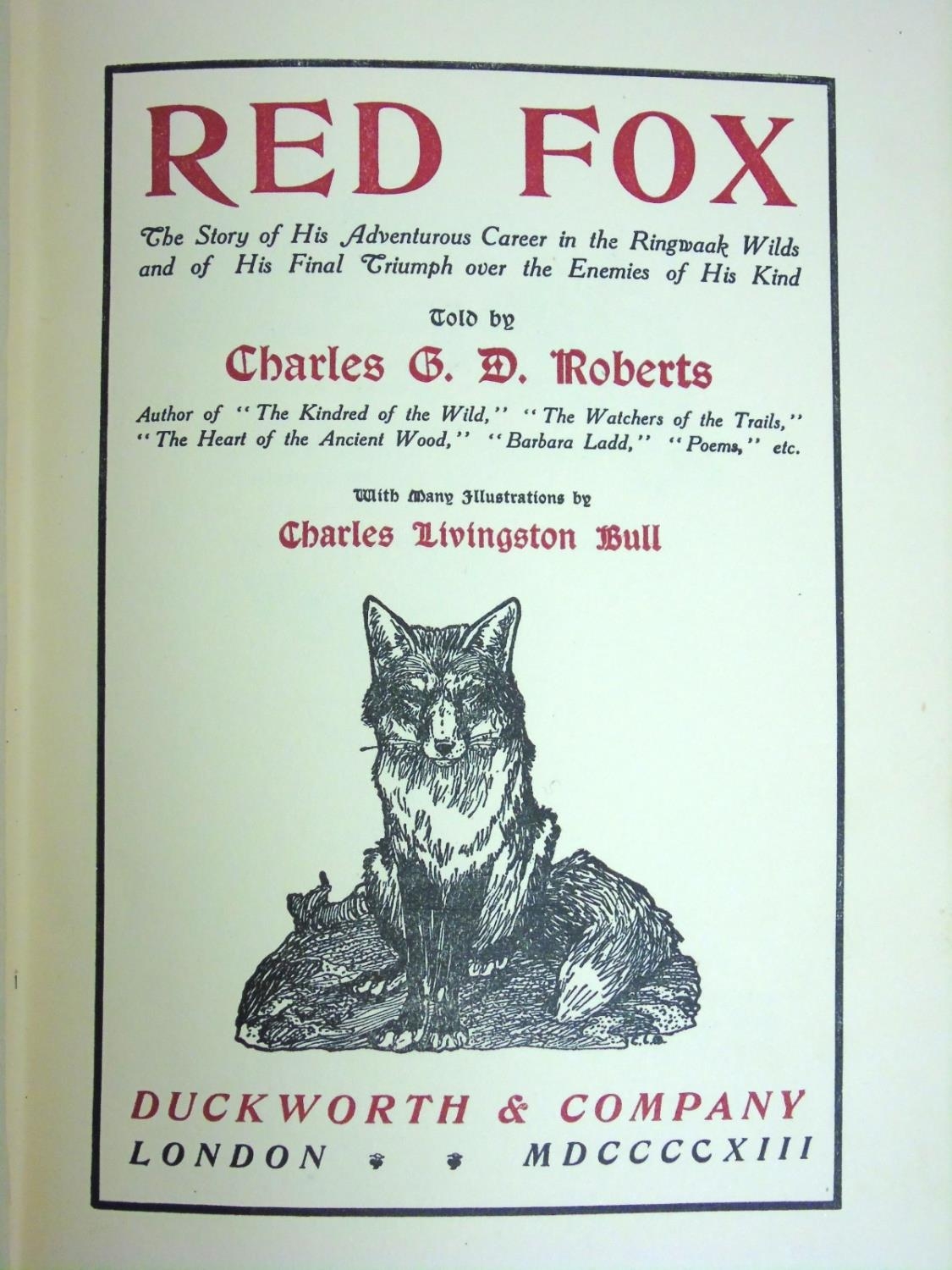 Book: '' Red Fox '' by Charles G.D. Roberts, published by Duckworth & Co. London 1913, hardback with gilt lettering and designs to front and spine, 340pp