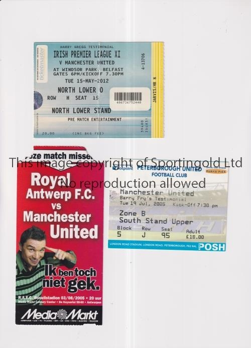 MANCHESTER UNITED Three tickets for away friendly matches v Peterborough United 19/7/2005 (Barry Fry's Testimonial), Irish Premier League XI 15/5/2012 (Harry Gregg Testimonial), slightly creased and Royal Antwerp 3/8/2005. Generally good