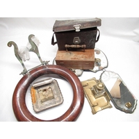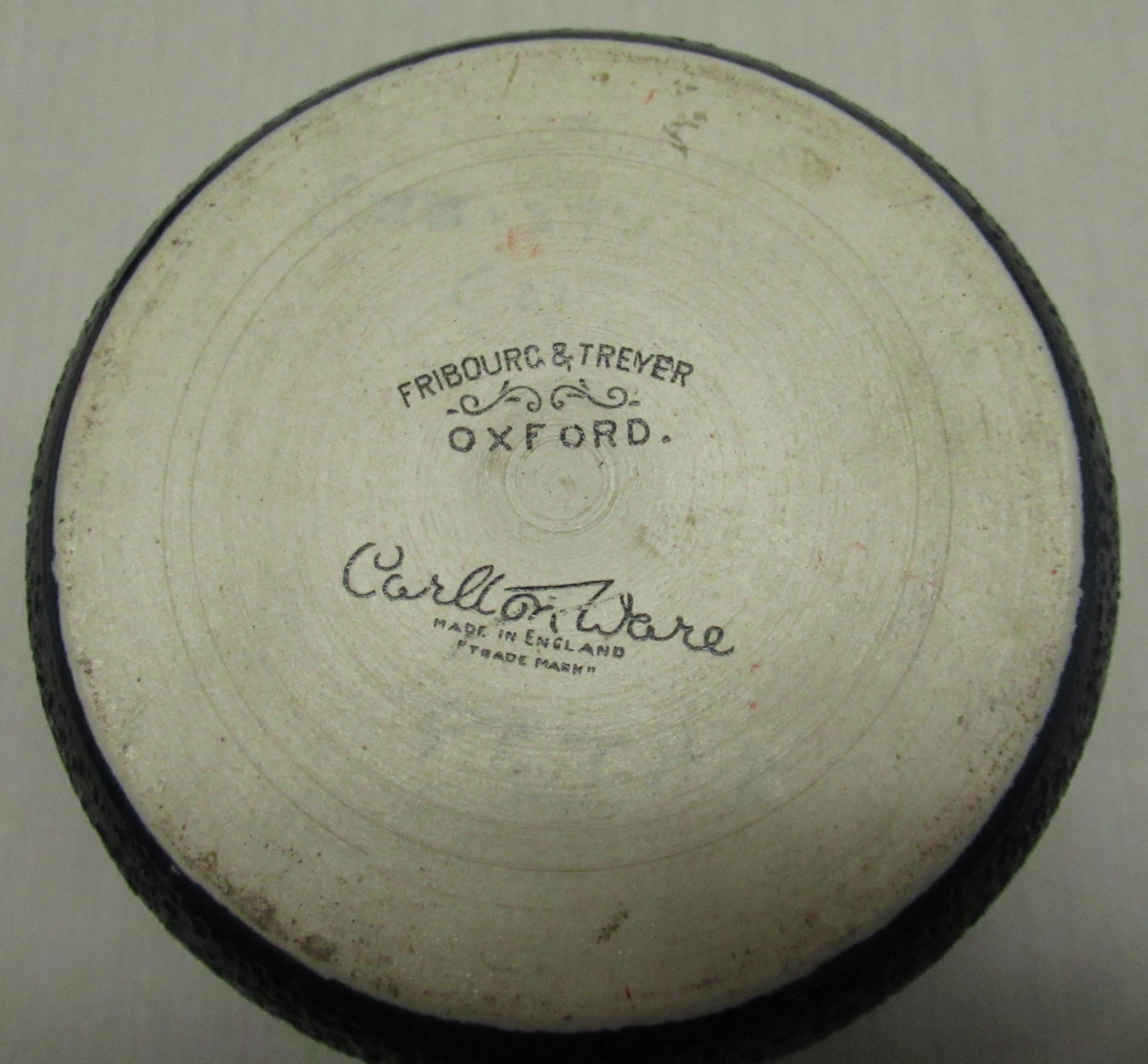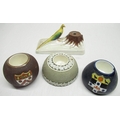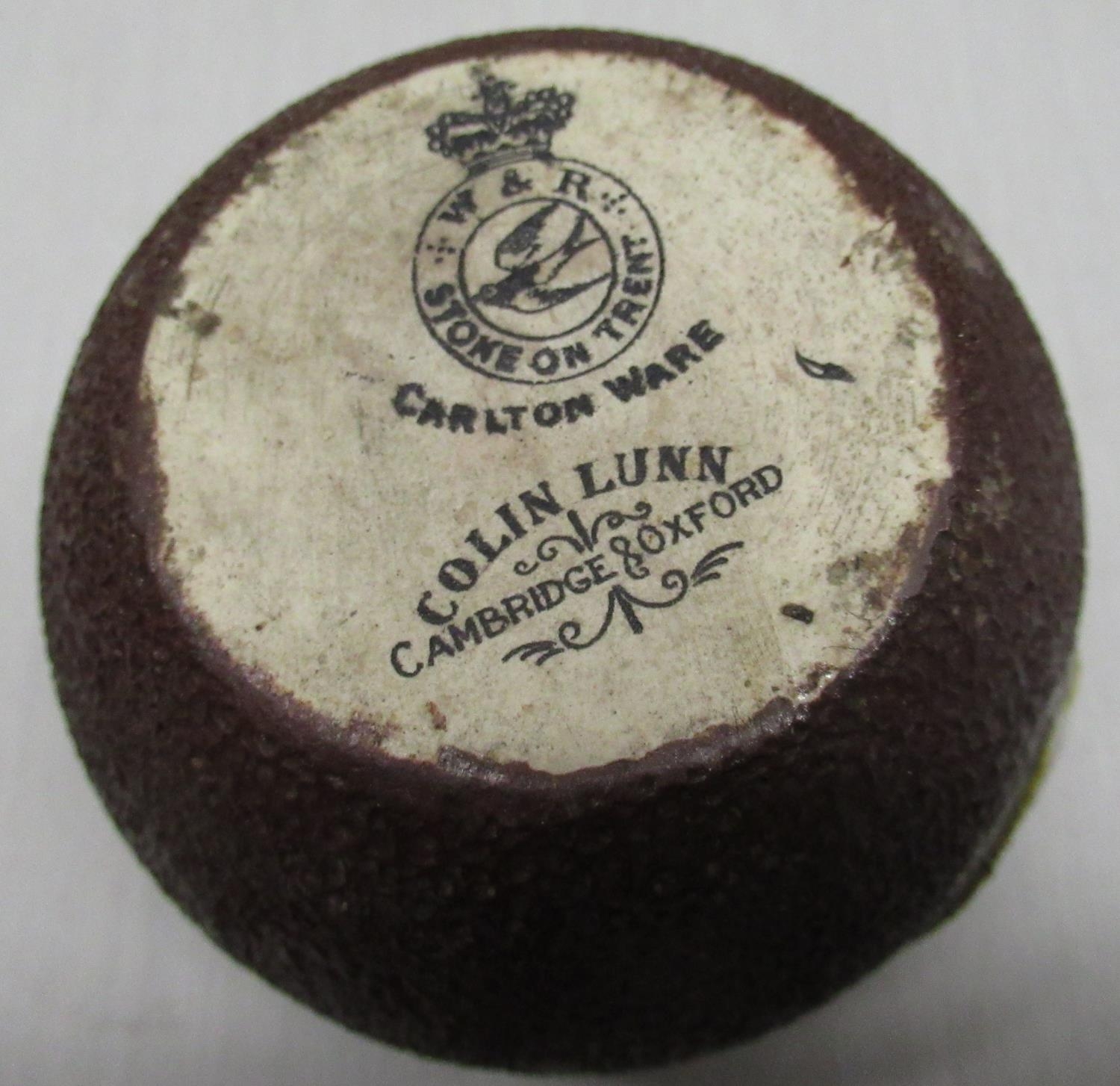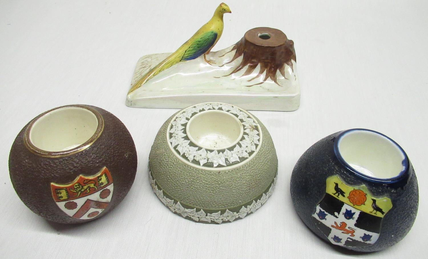 1930's Carlton Ware lustre pen stand in the form of golden pheasant beside tree stump, W & R Carlton ware vesta striker with Rd No. 133737, two other Carlton ware vesta strikers with Oxbridge crests and retailer marks
