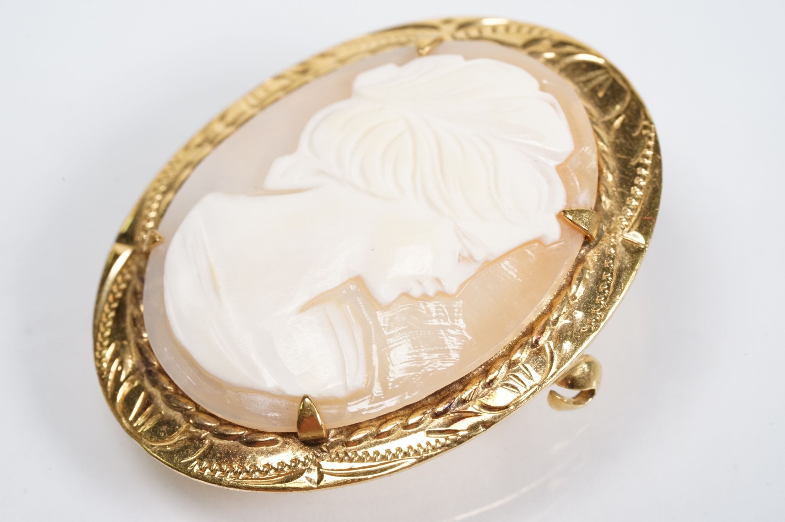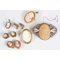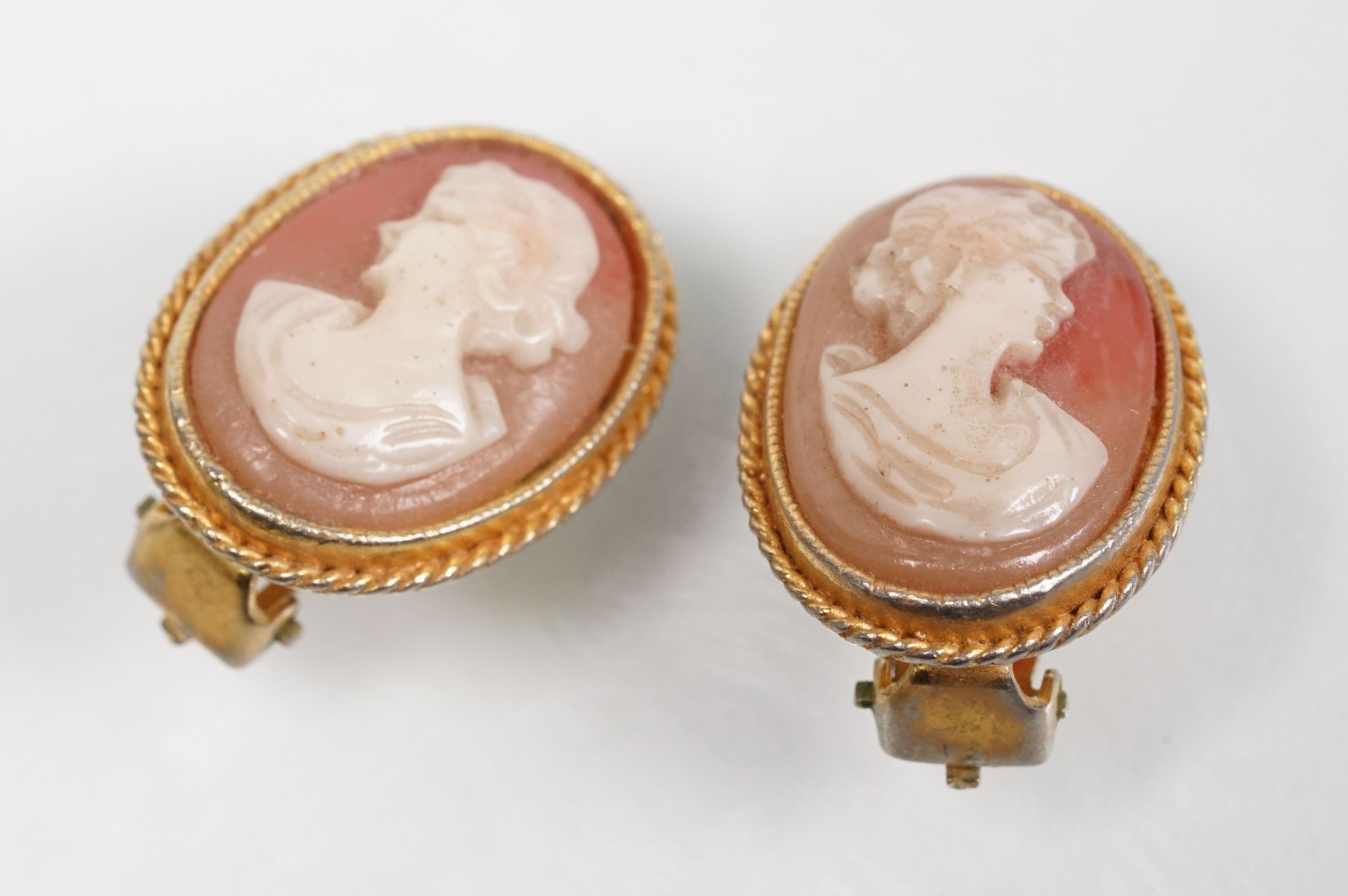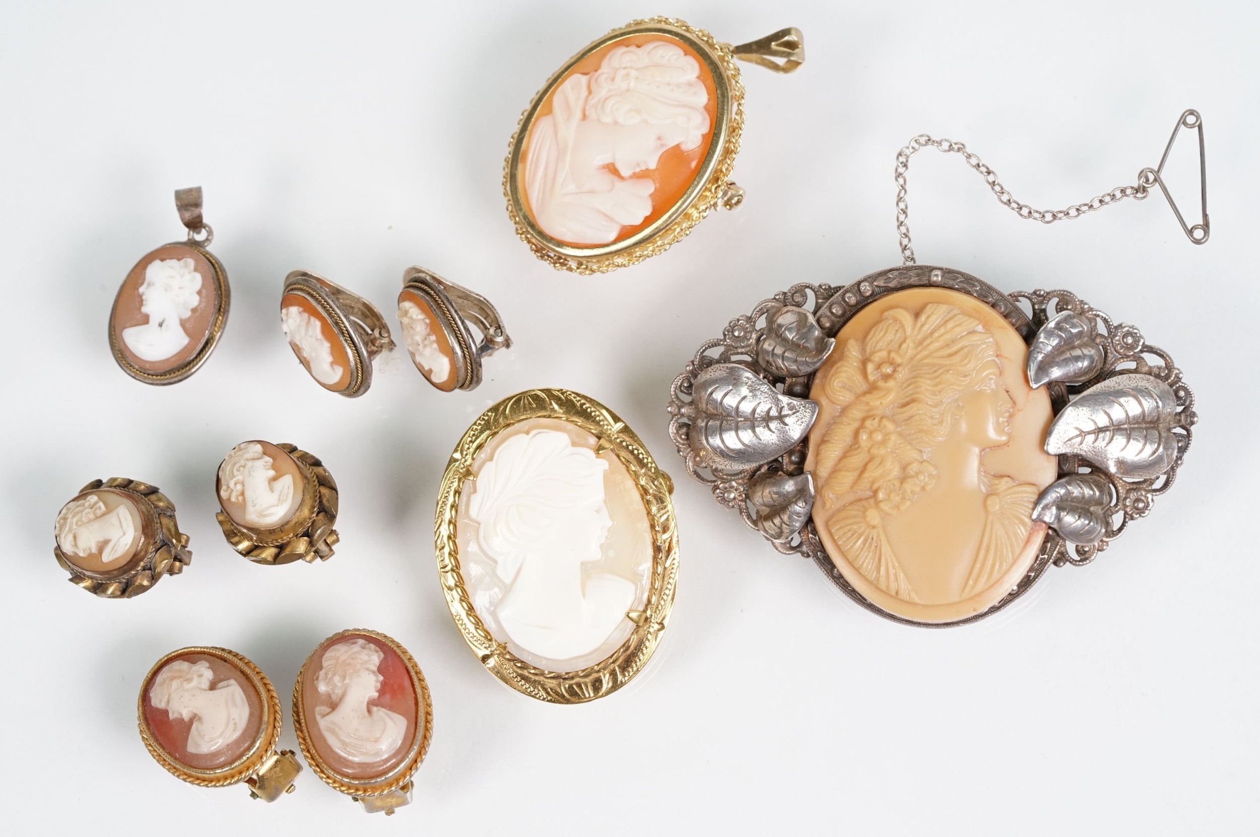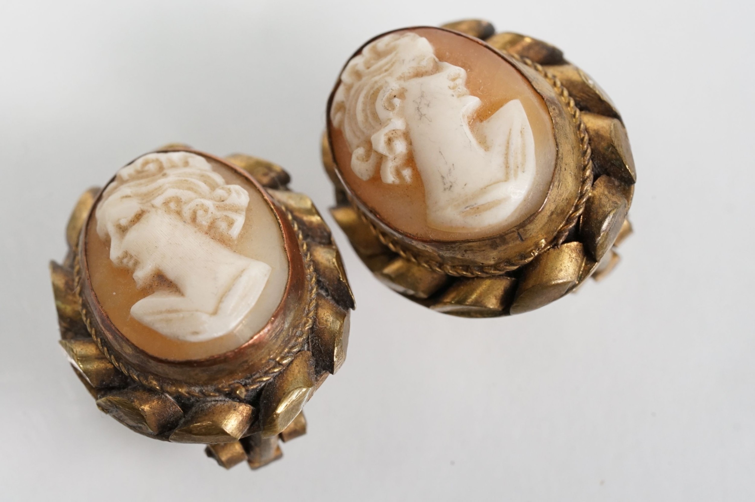 Group of cameo jewellery to include yellow metal and carved shell cameo pendant (partial hallmark to bale), three pairs of clip on earrings, a rolled gold cameo brooch and a silver set cameo brooch. Largest measures 6cm wide.